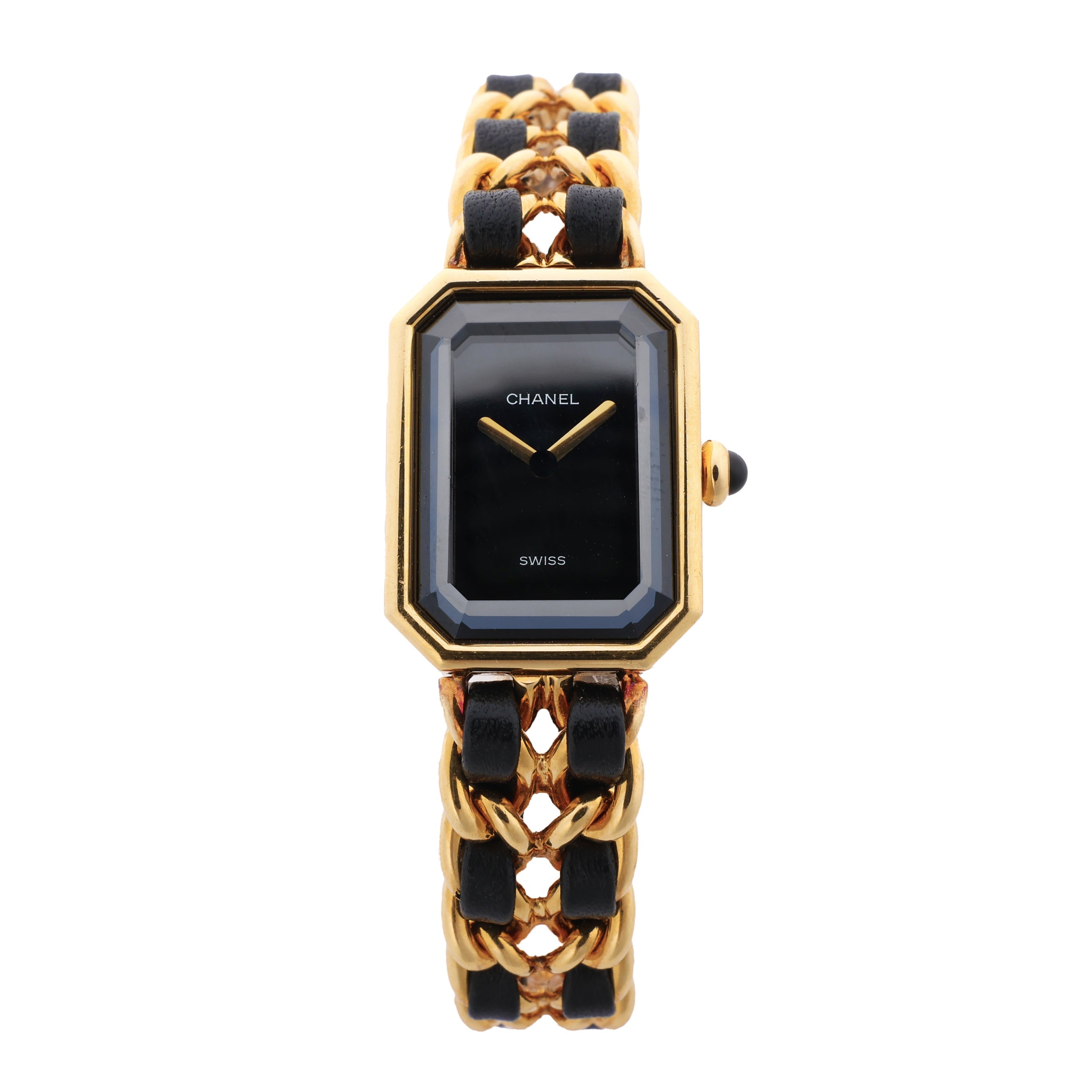 Brand: Chanel Model: Premiere XLReference: H0001Condition: ExcellentCondition Details: Light signs of use, including subtle surface marks barely visible to the eye. Minor surface discoloration on the clasp. Please see photos for the exact condition.Dial Colour: BlackCase Material: Gold PlatedStarp Colour: Gold, BlackStrap material: Gold Plated, LeatherMovement: QuartzFace Diameter: 26 x 20 mm Approx. max circumference: 17 cmComes With: Case, Warranty card, Service card