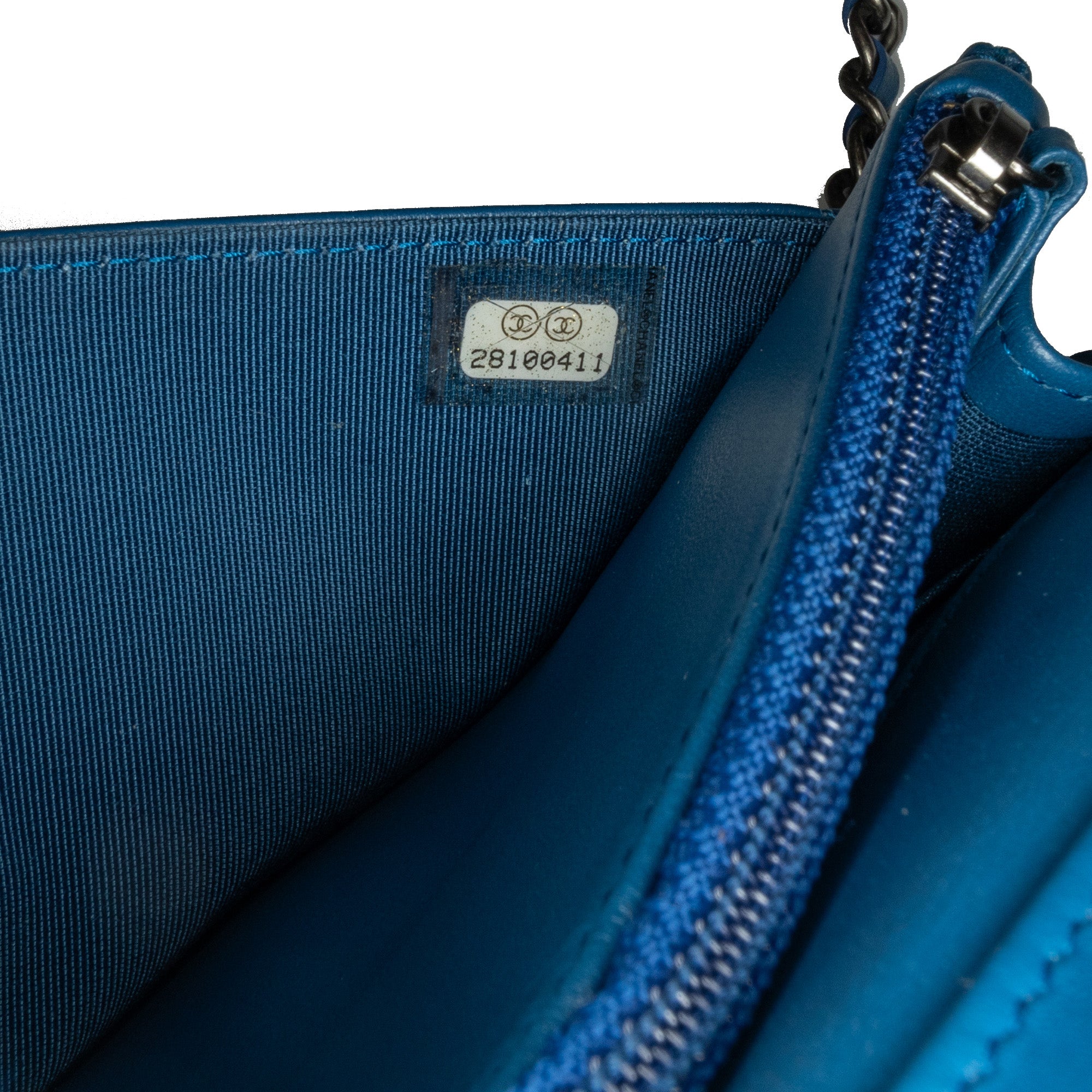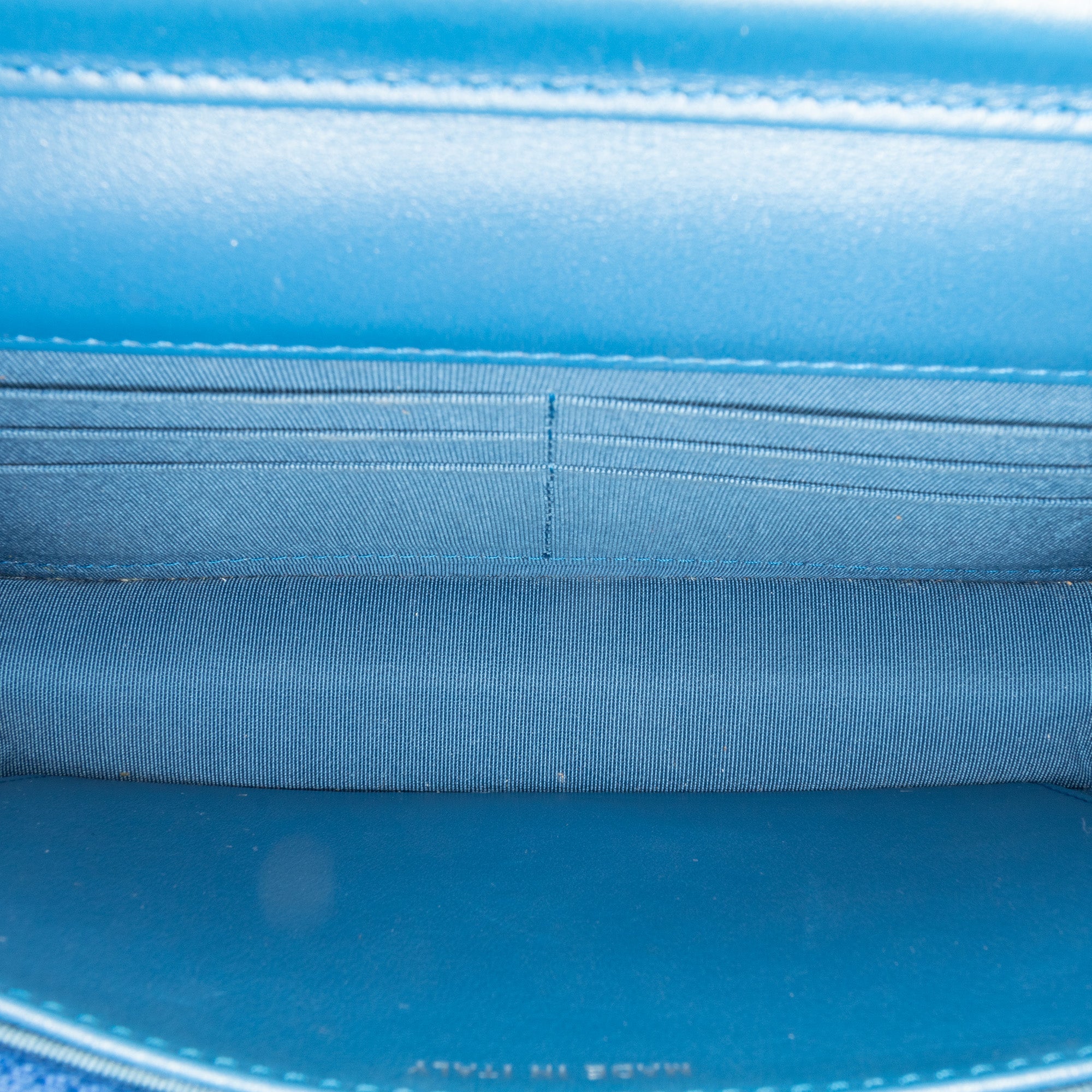 This wallet on chain features a quilted calf leather body, a leather woven chain strap, a front flap with a magnetic closure, interior zip and slip pockets, and interior card slots. Inclusion: authenticity card. Retail Price: 3000.00