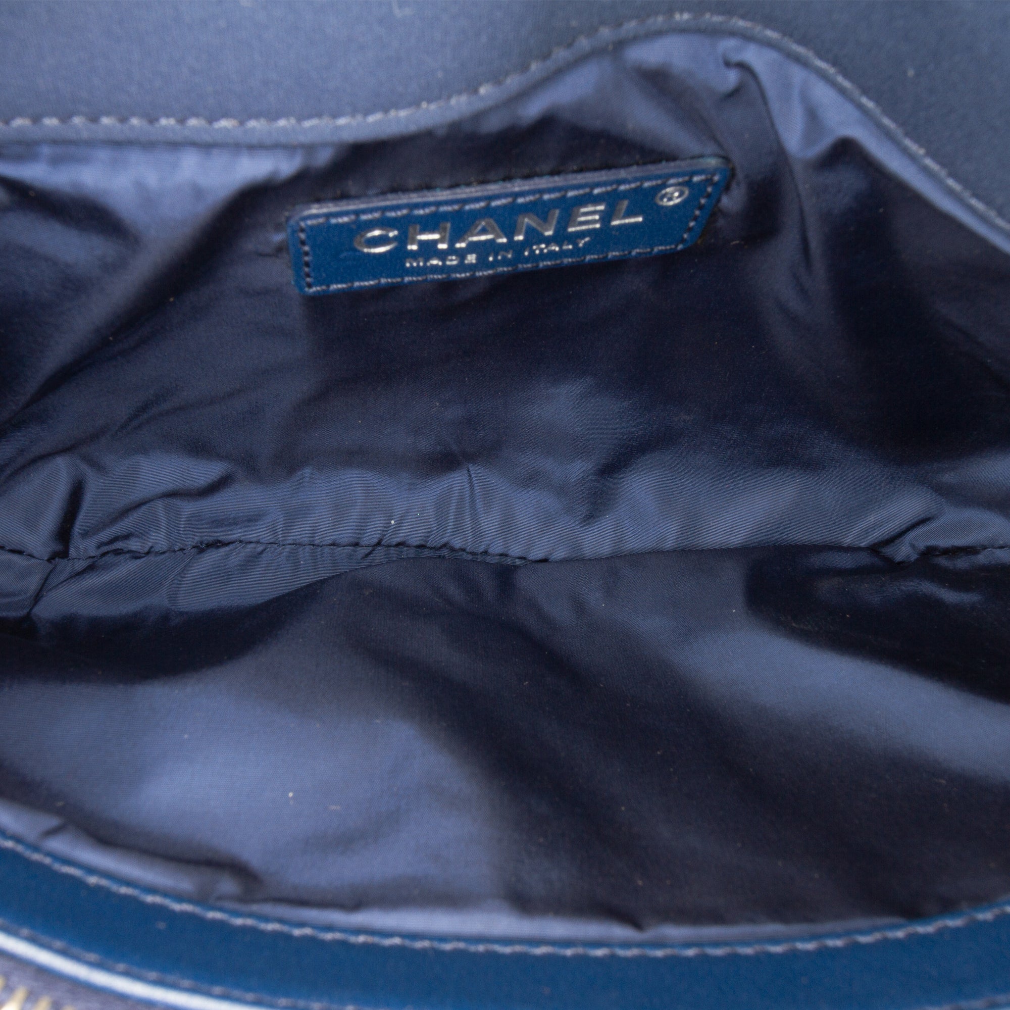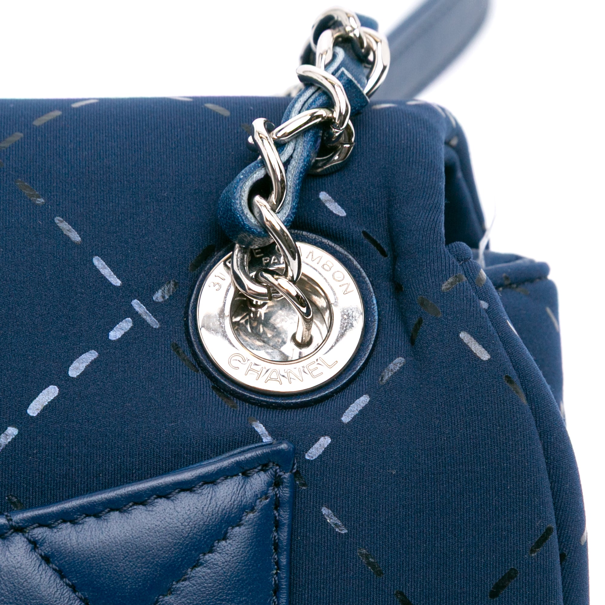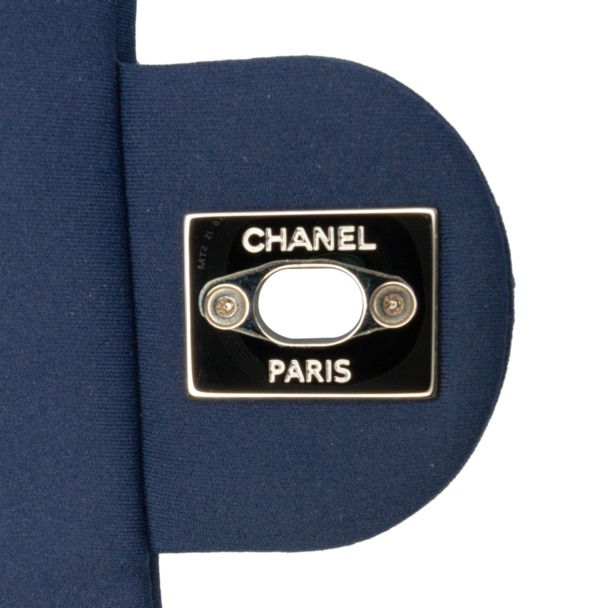 This shoulder bag features a jersey body, a woven chain shoulder strap with leather guard, a flap with CC turn-lock closure, and an exterior back slip pocket. Retail Price: 5200.00