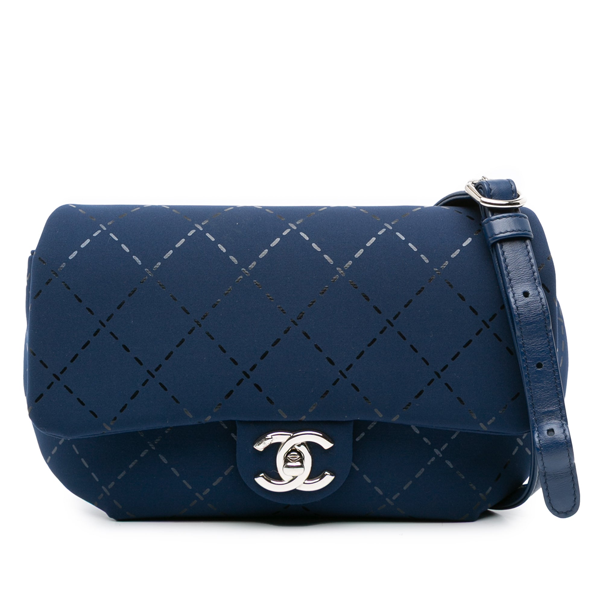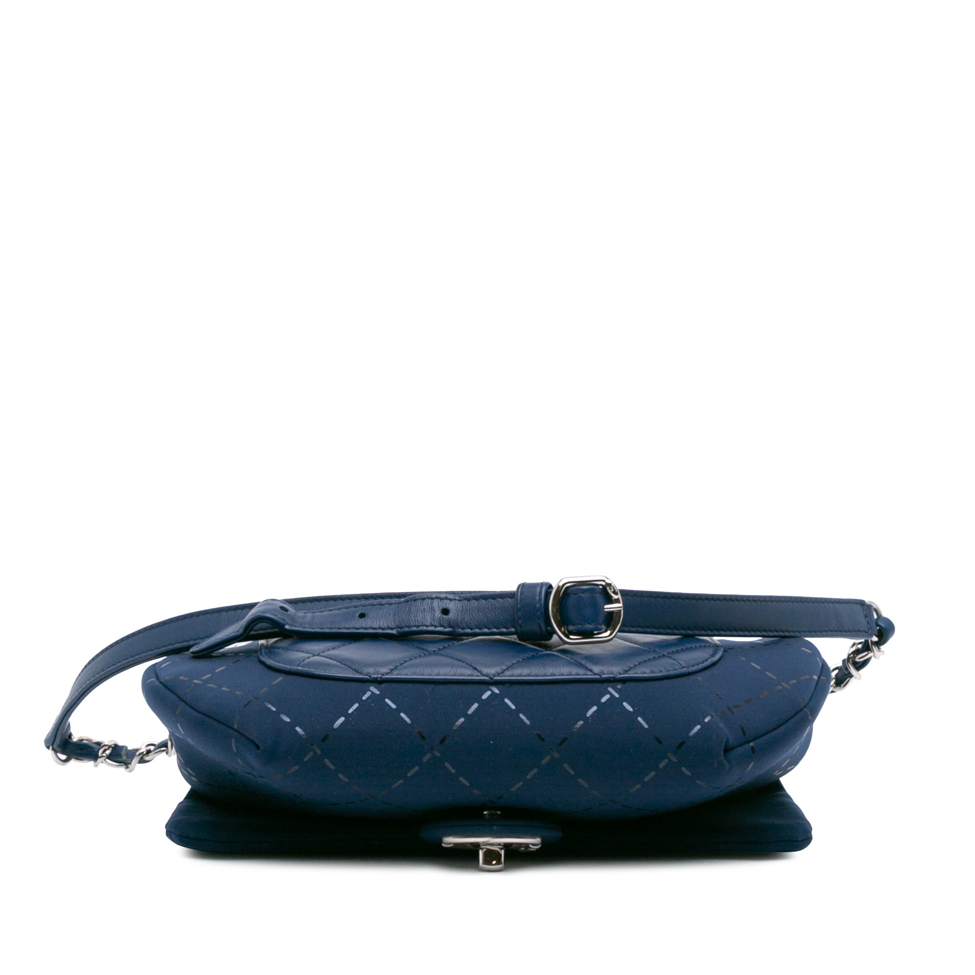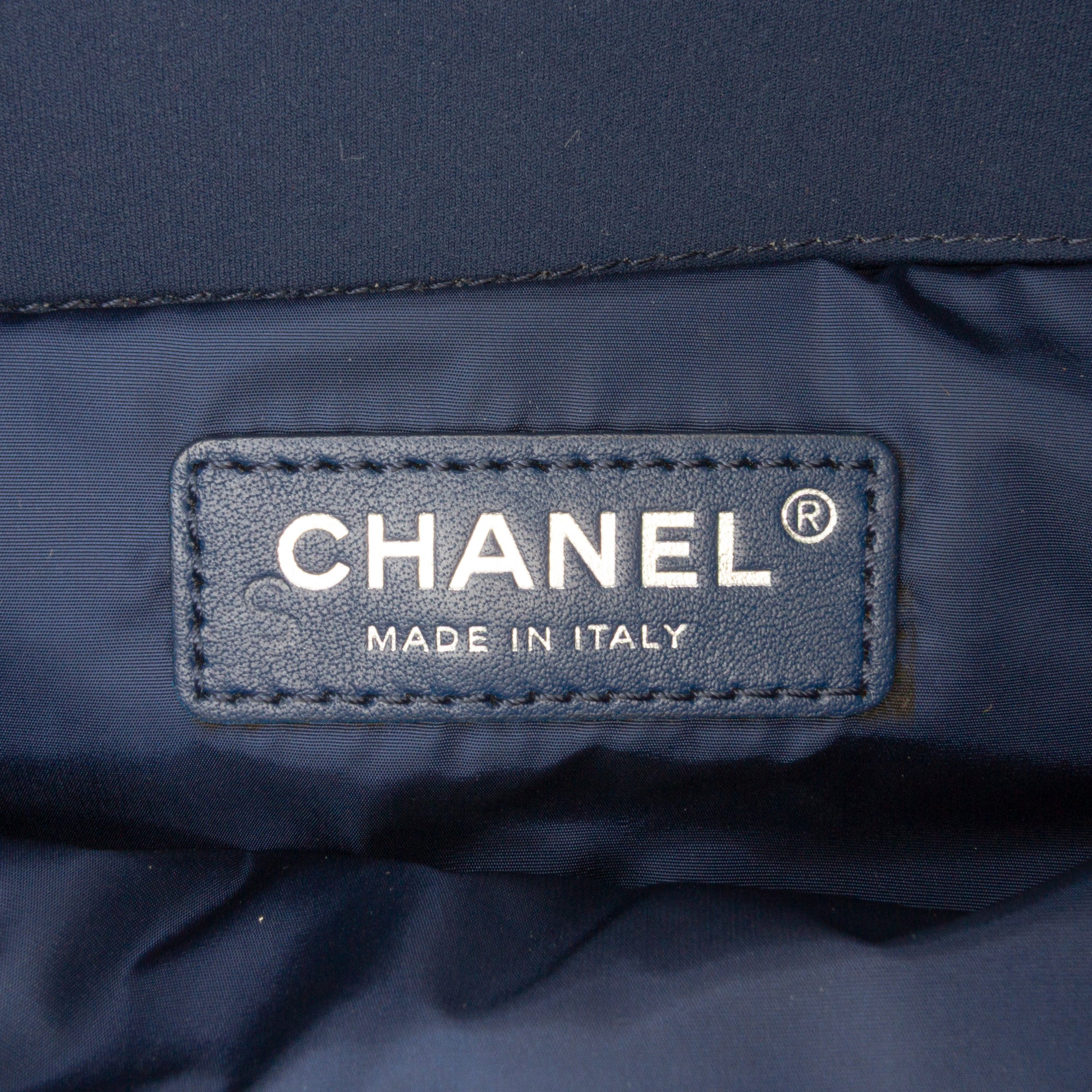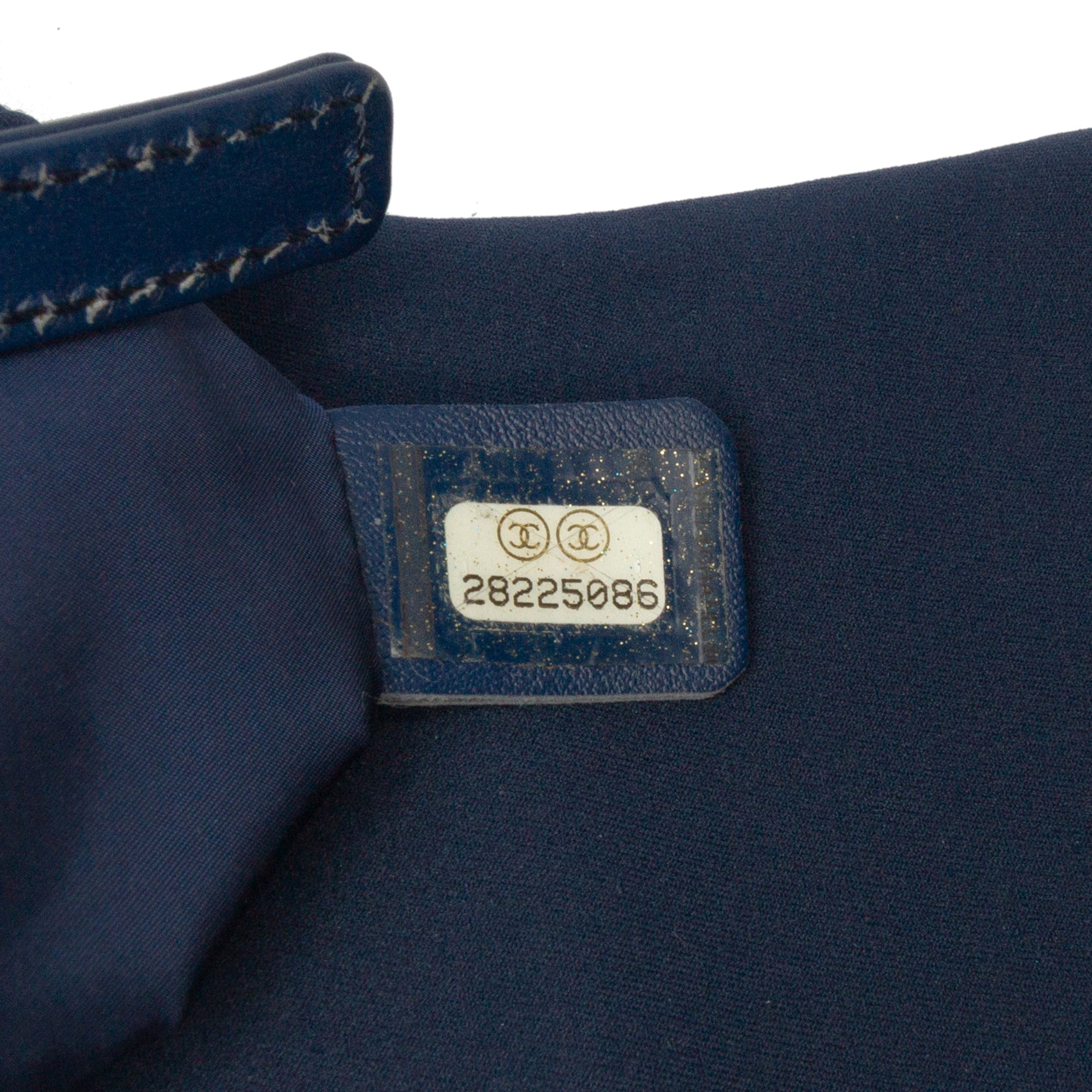 This shoulder bag features a jersey body, a woven chain shoulder strap with leather guard, a flap with CC turn-lock closure, and an exterior back slip pocket. Retail Price: 5200.00