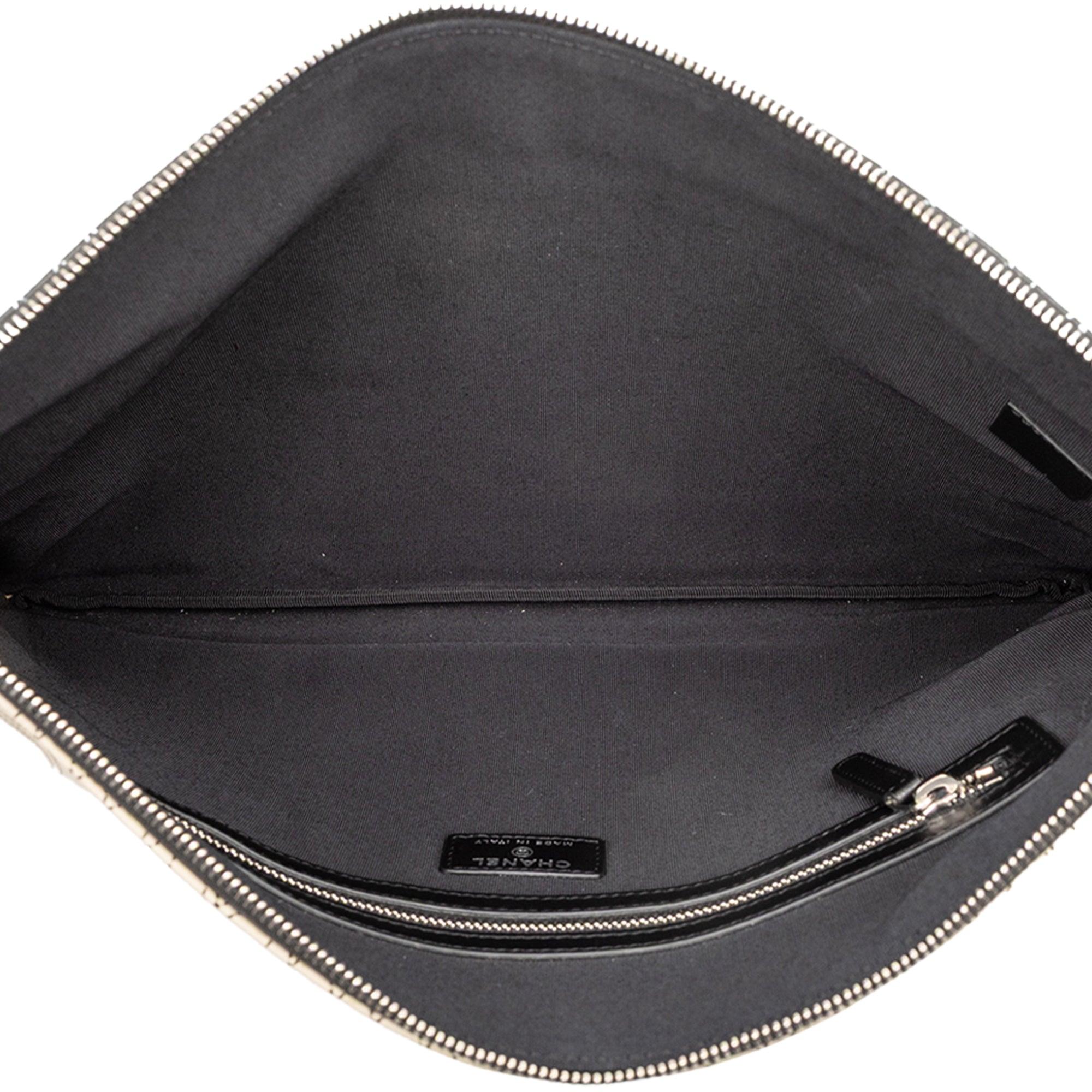 This clutch features coated canvas body, a flat wrist strap, a top zip closure, and an interior zip pocket. Inclusion: authenticity card. Retail Price: 1200.00