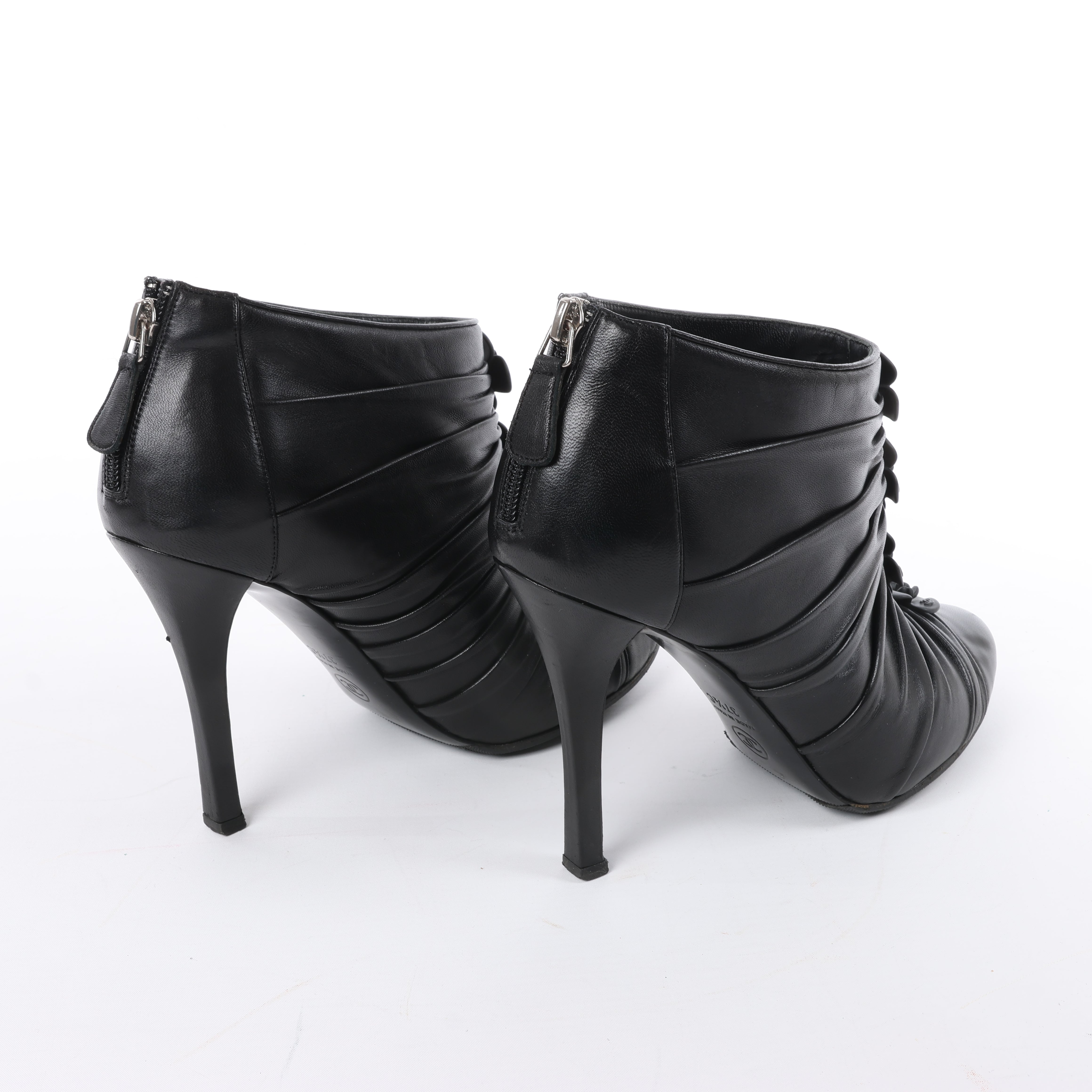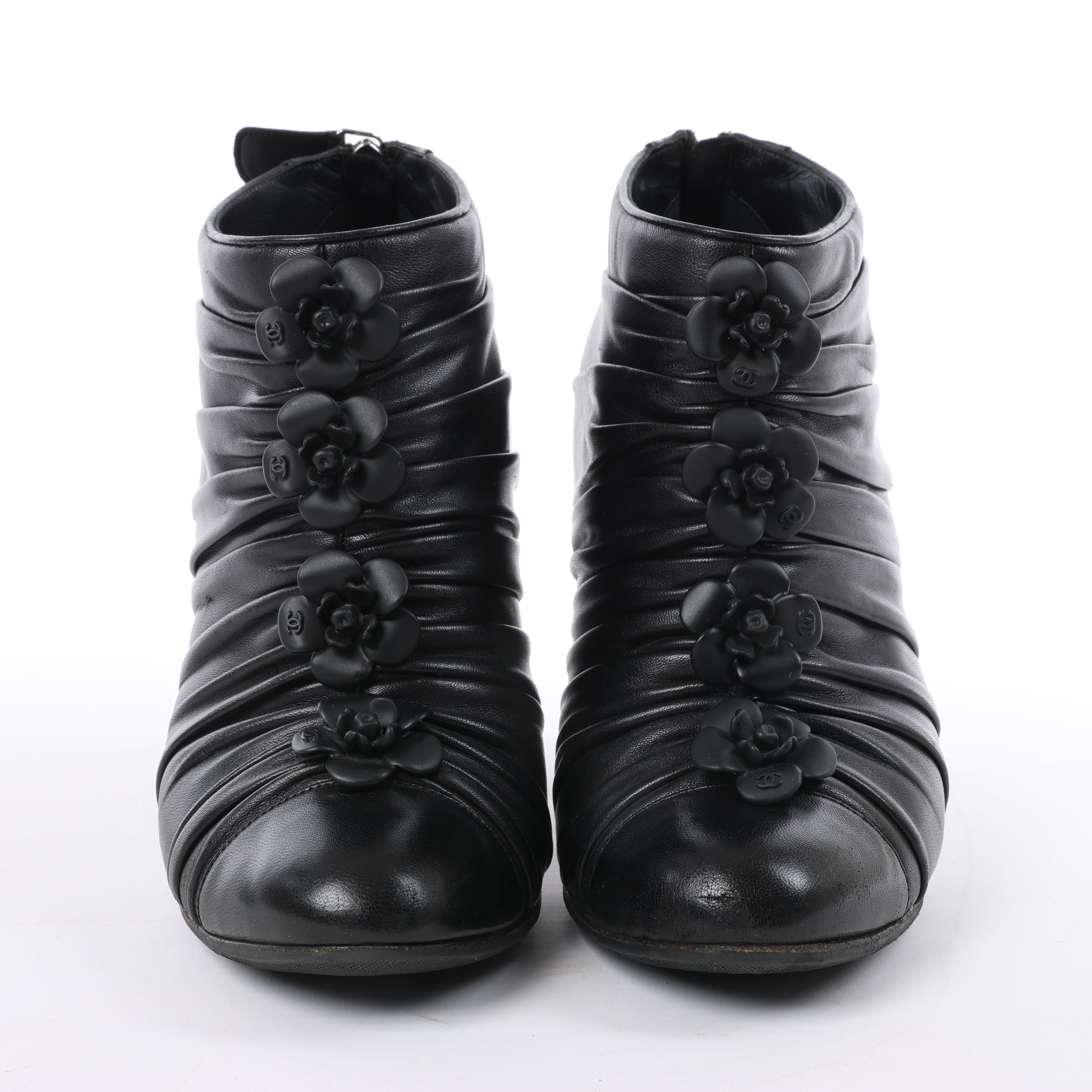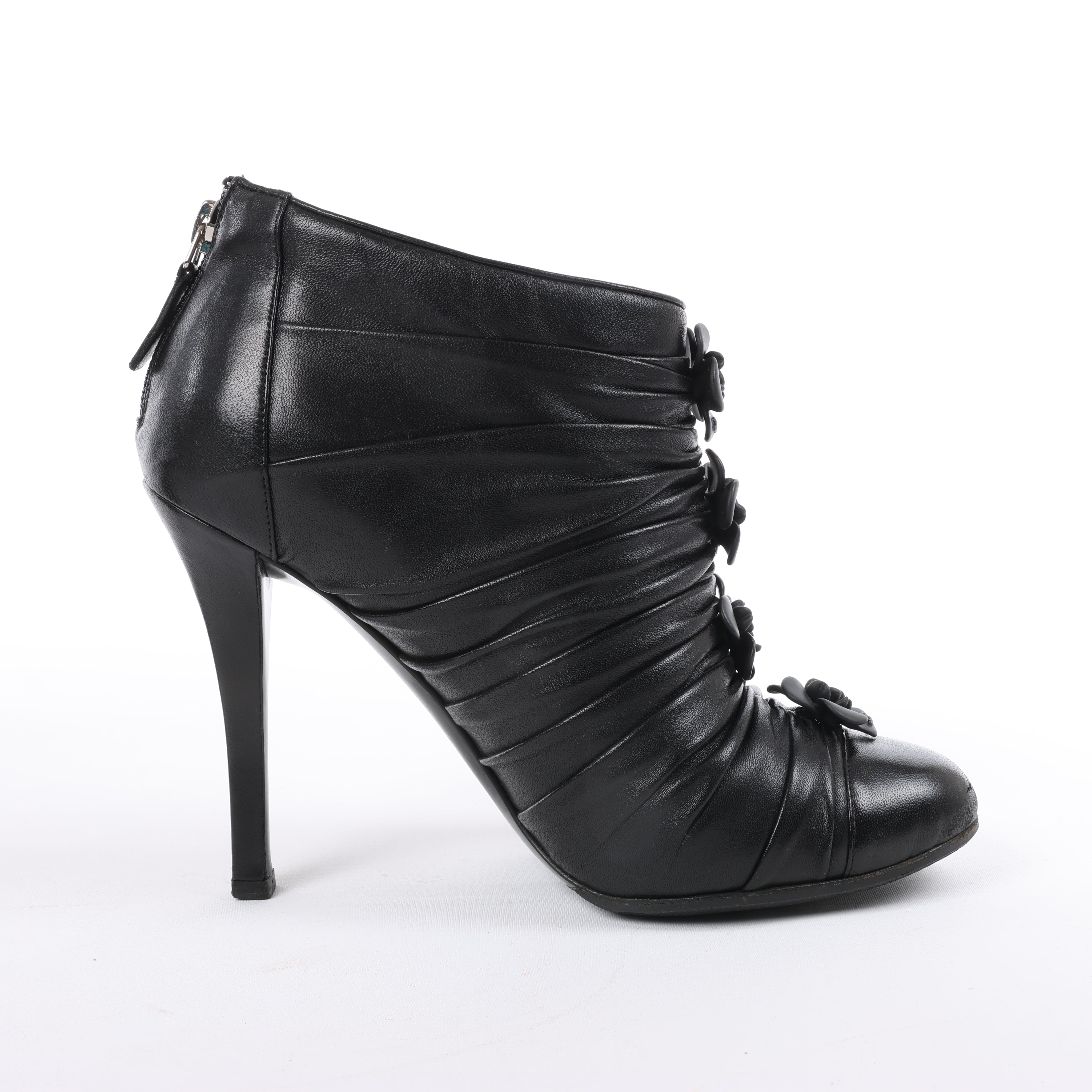 Chanel Coco Mark Camelia booties in black leather, size 37.5 EU. Delicately ruched with signature camellia flower accents and stiletto heel—feminine elegance meets iconic Chanel charm.
