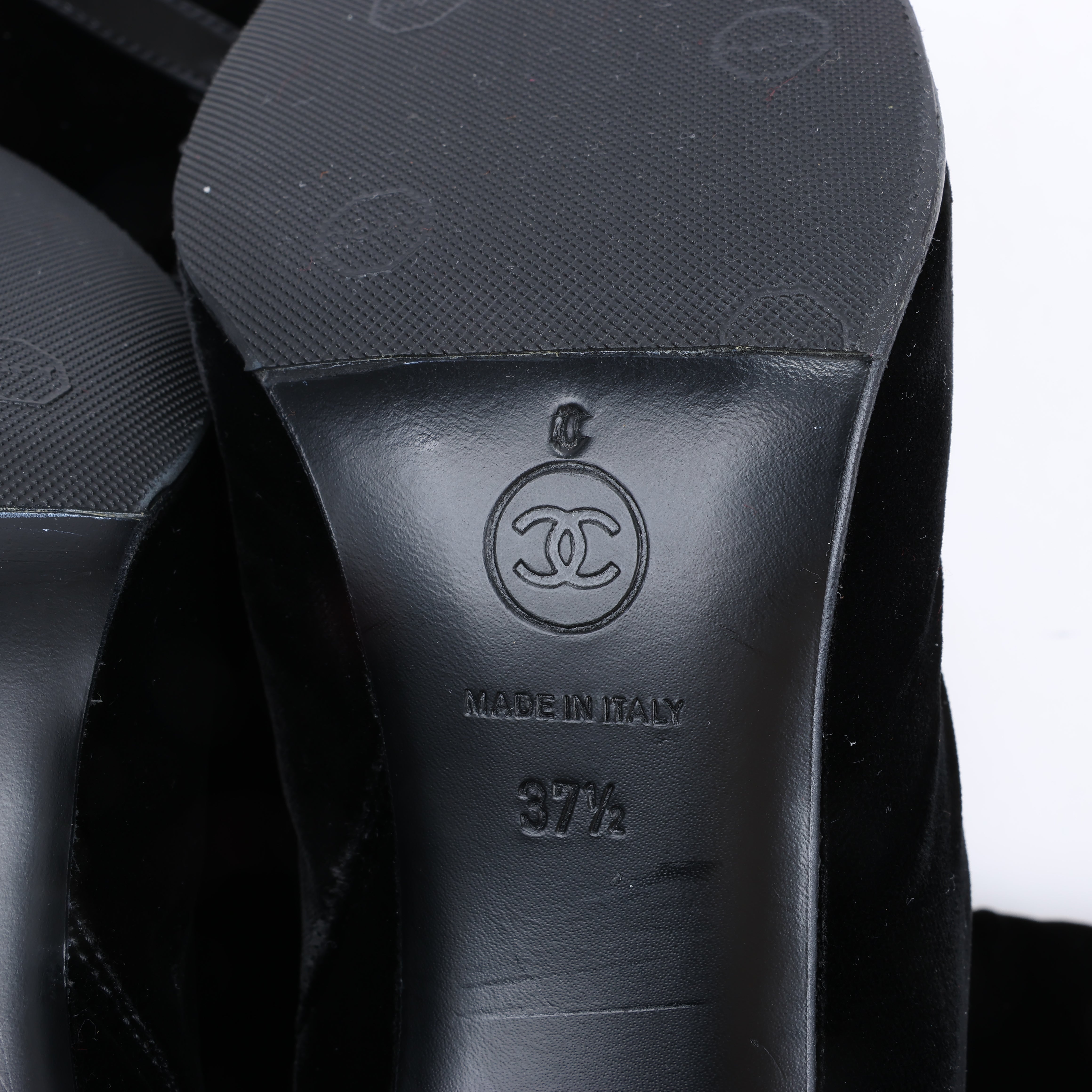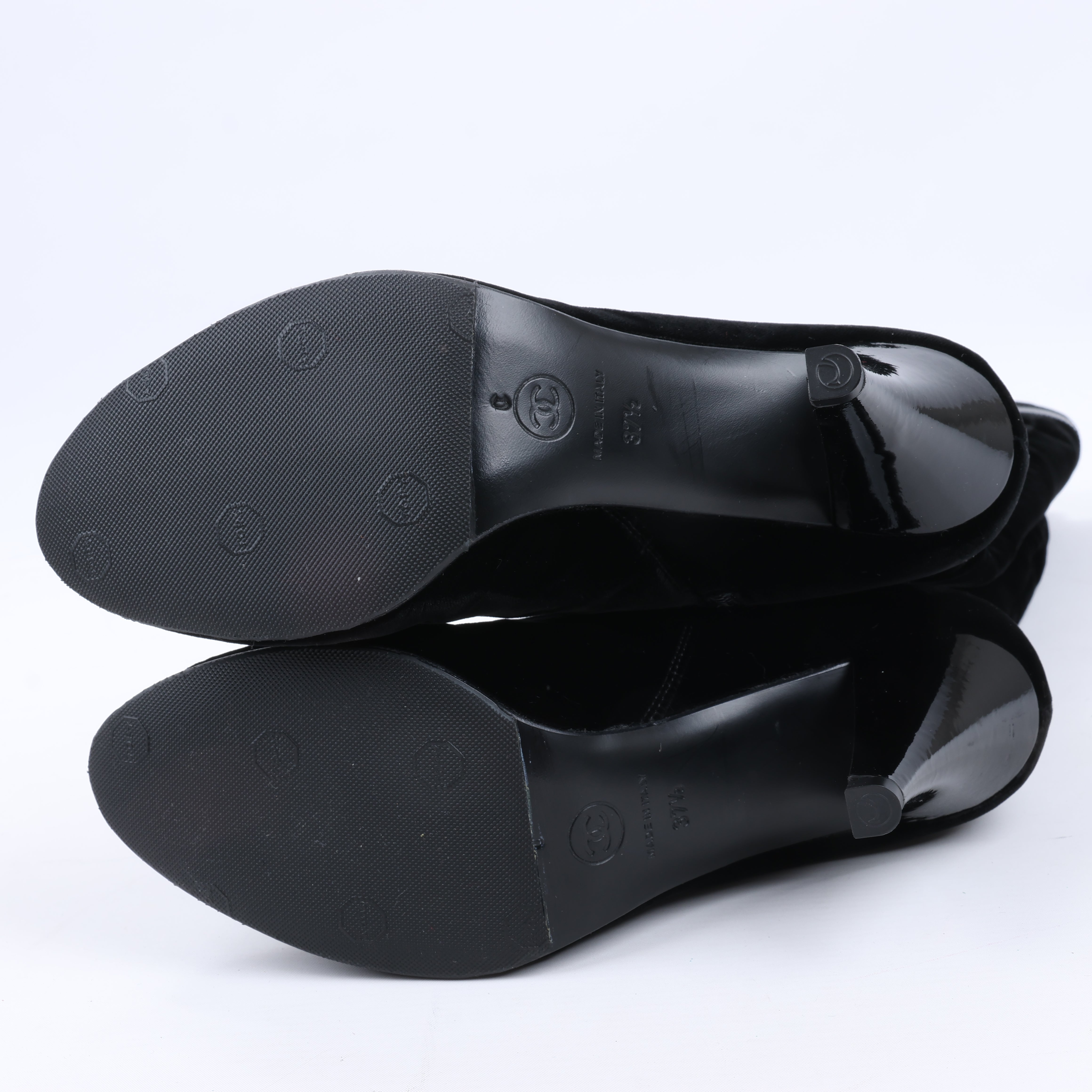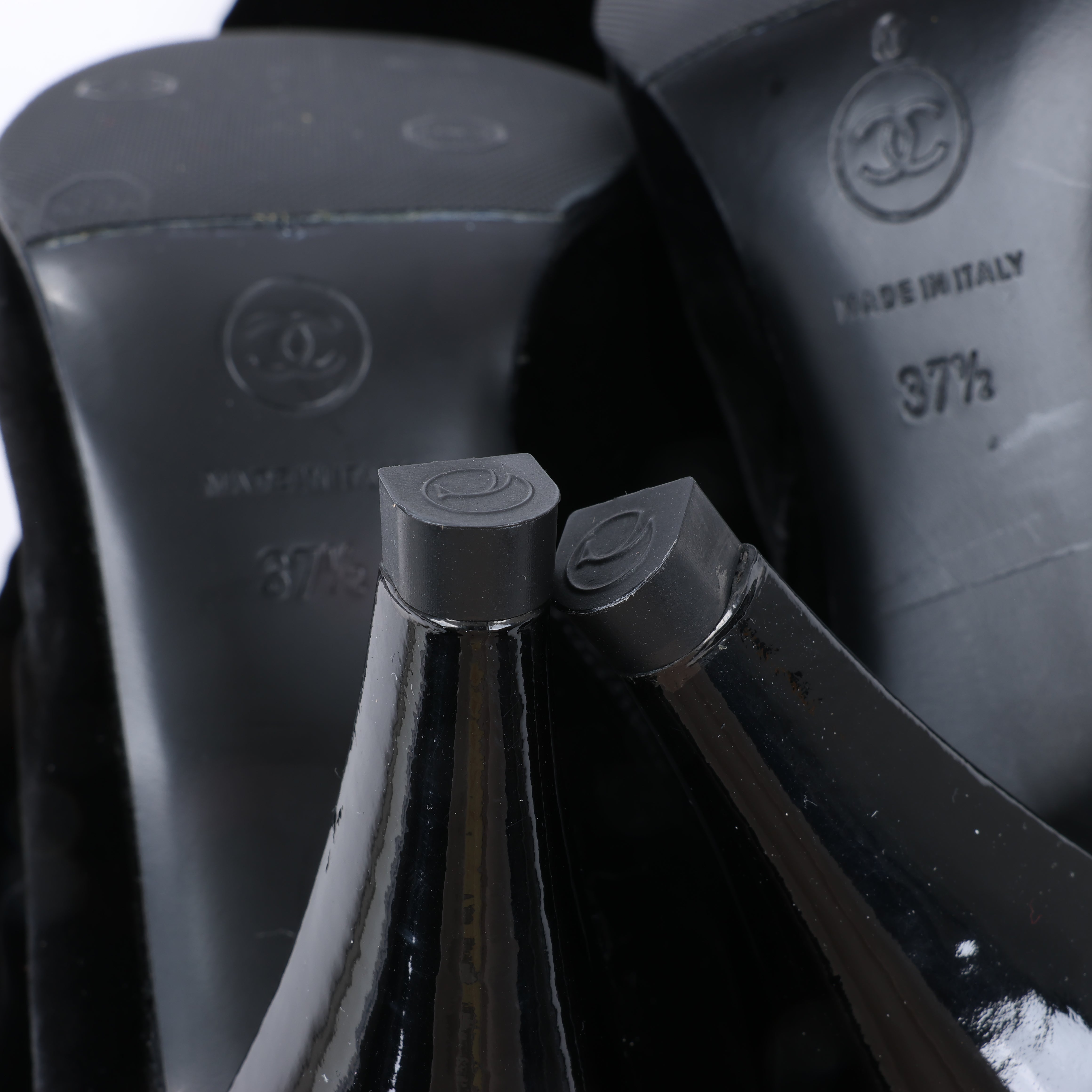 Brand: Chanel Size: EU 37.5Heel Height: 8 cmShaft circumference: 37 cmCondition: ExcellentCondition Details: Like new, because outsole and heel tip has been restoredMain Colour: BlackColours: -Main material: Velvet (Velour)Materials: Patent leatherManufactured In: ItalyComes With: -