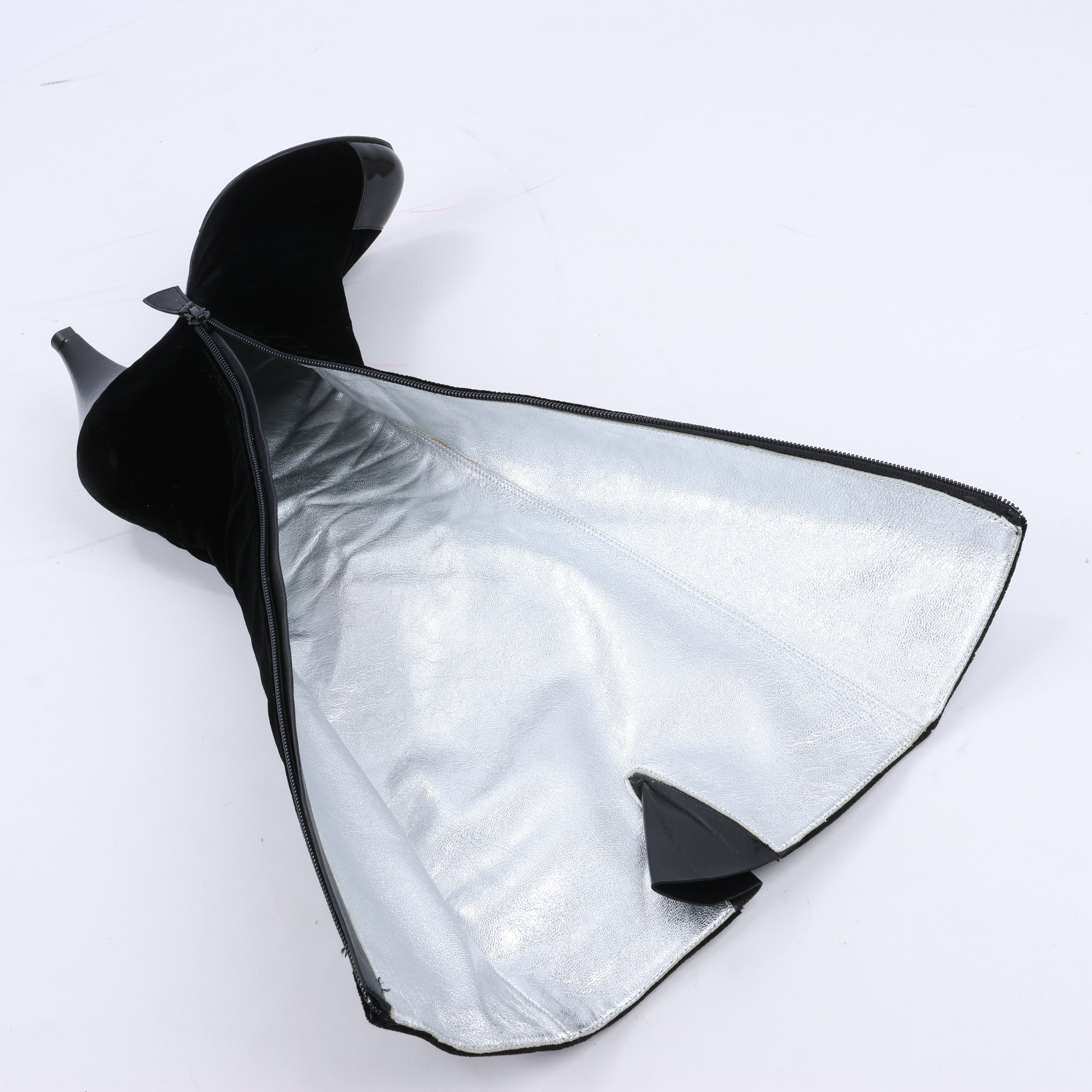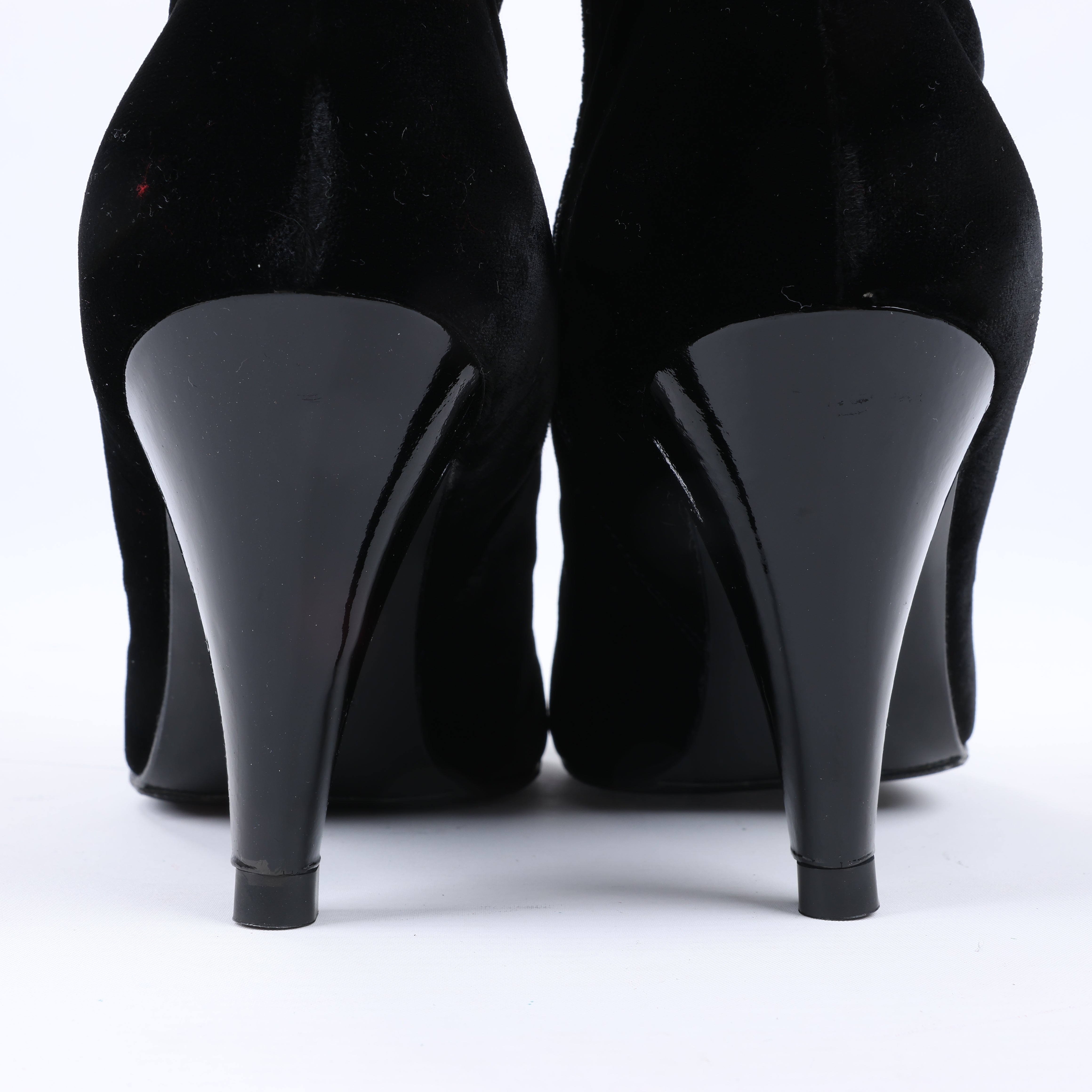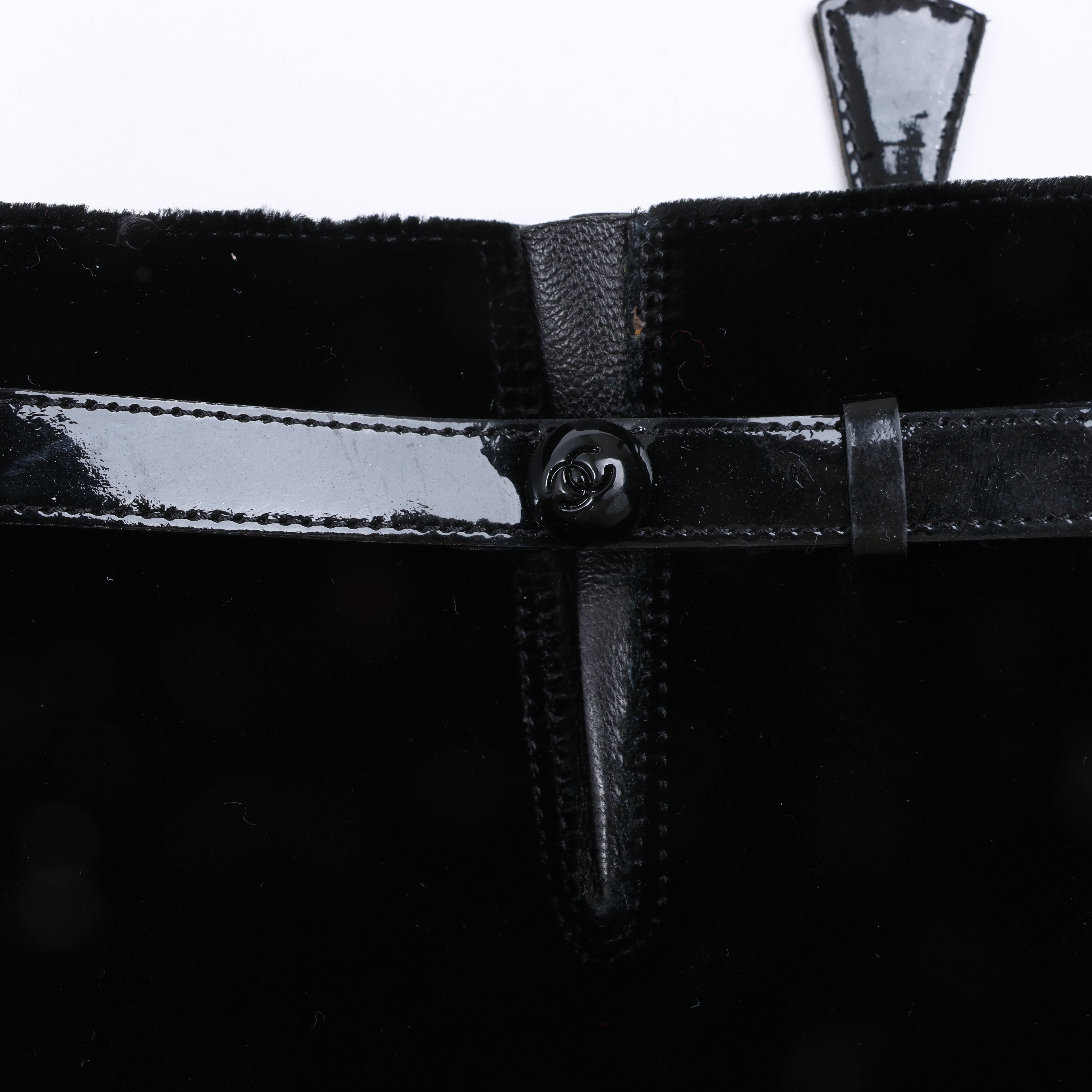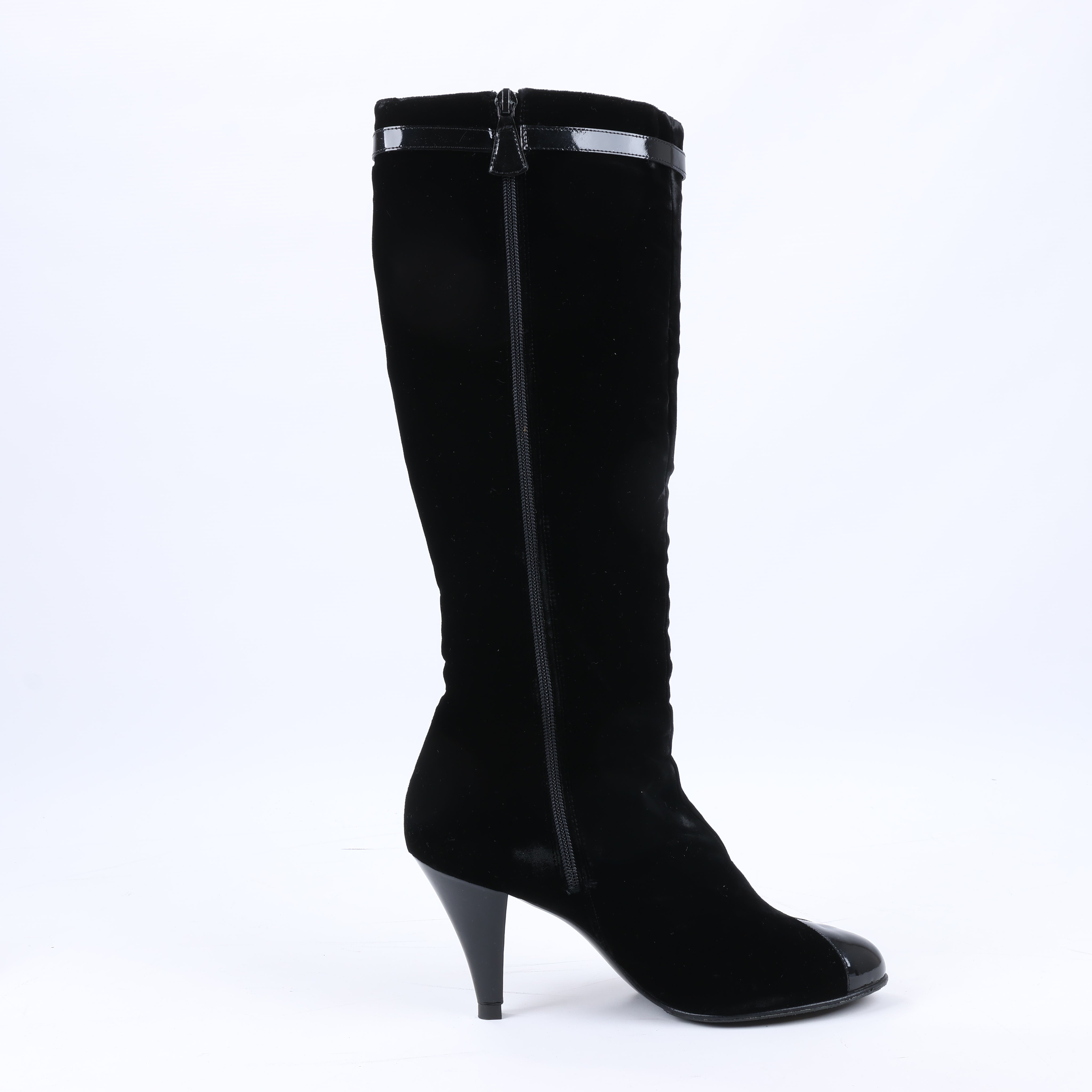 Brand: Chanel Size: EU 37.5Heel Height: 8 cmShaft circumference: 37 cmCondition: ExcellentCondition Details: Like new, because outsole and heel tip has been restoredMain Colour: BlackColours: -Main material: Velvet (Velour)Materials: Patent leatherManufactured In: ItalyComes With: -