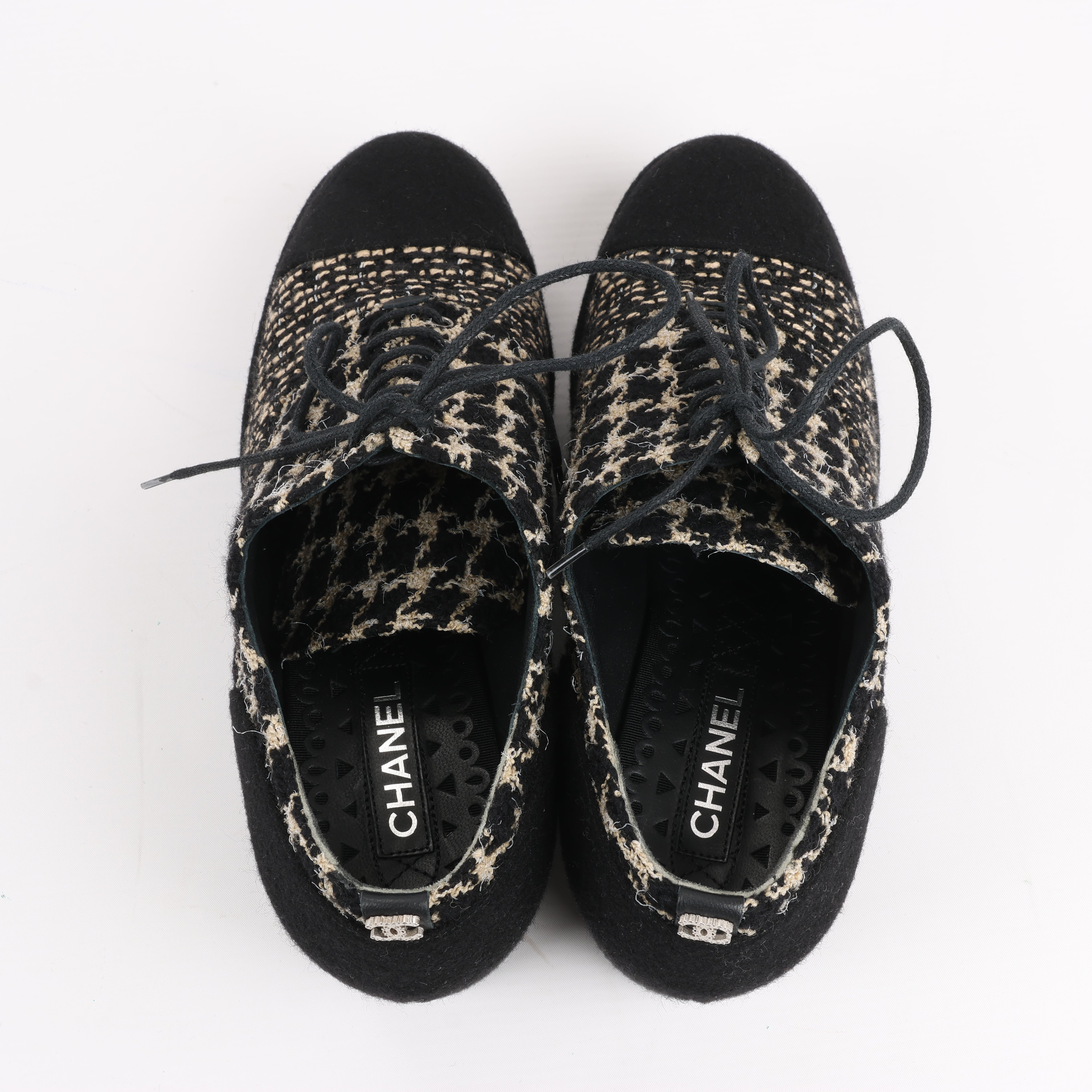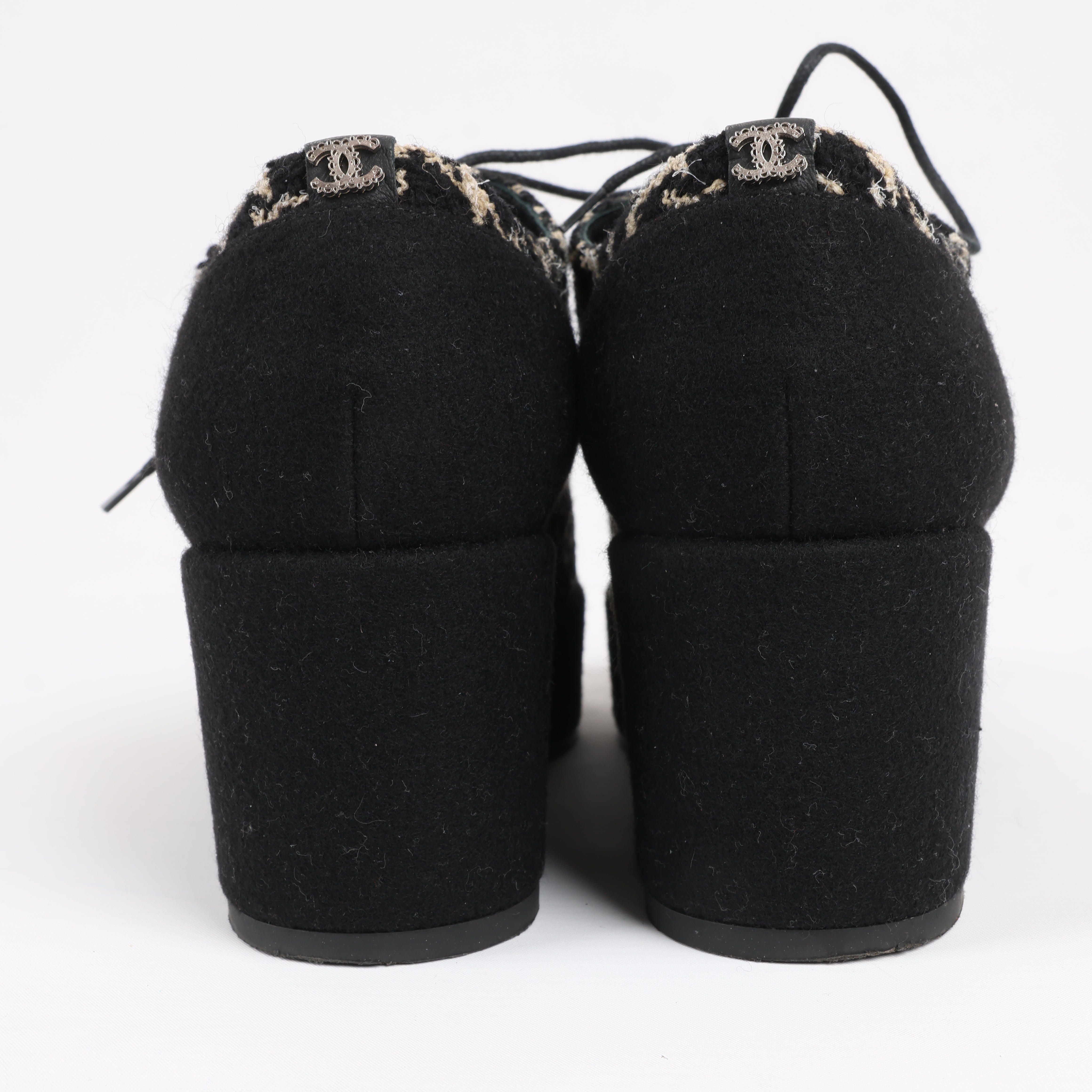 Elevate your style with these CHANEL Coco Tweed Felt Mark Boots. Crafted in black and beige tweed with luxurious fabric and leather details, these lace-up platform shoes exude timeless elegance. A bold yet sophisticated statement for any fashion-forward wardrobe. Size 37 EU.