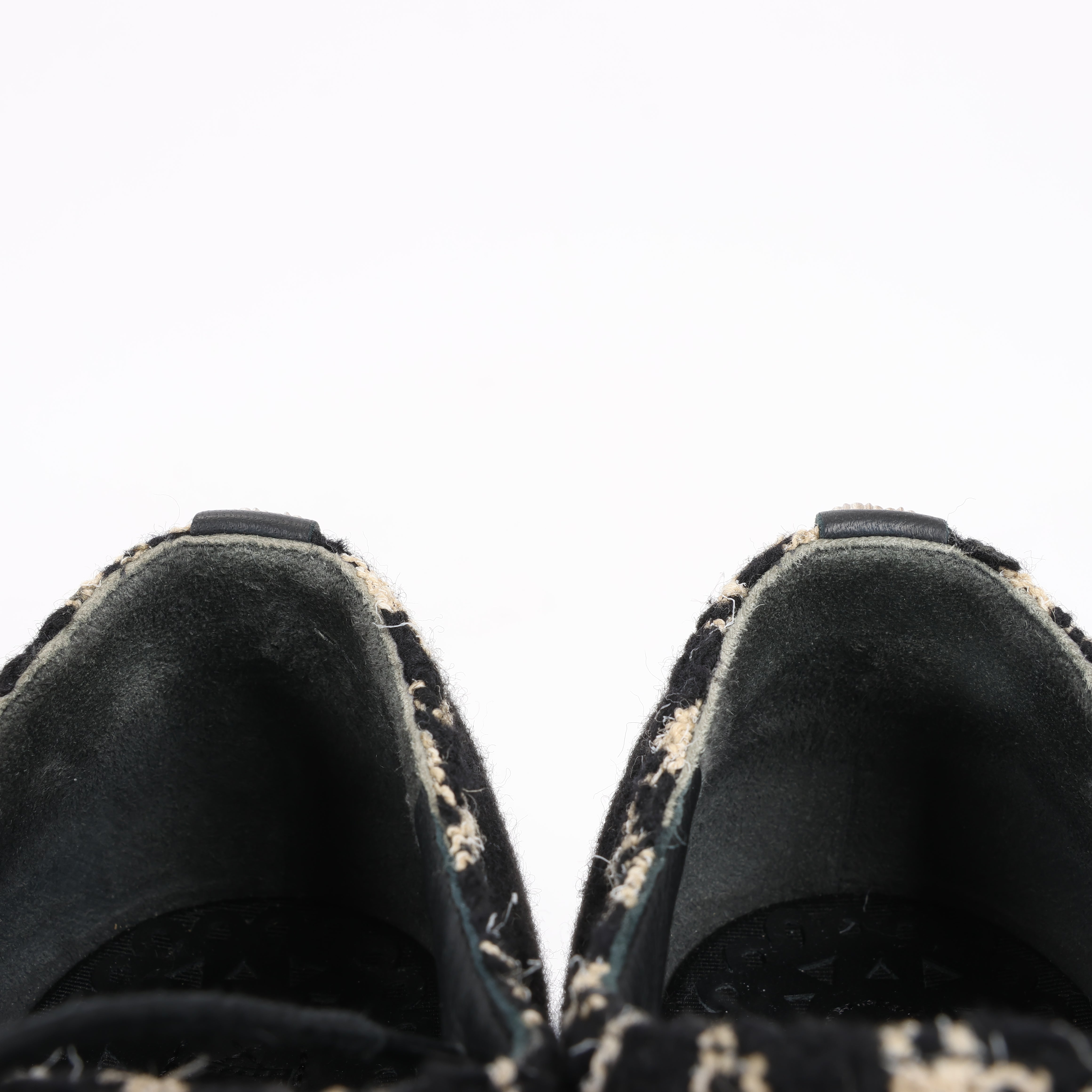 Elevate your style with these CHANEL Coco Tweed Felt Mark Boots. Crafted in black and beige tweed with luxurious fabric and leather details, these lace-up platform shoes exude timeless elegance. A bold yet sophisticated statement for any fashion-forward wardrobe. Size 37 EU.