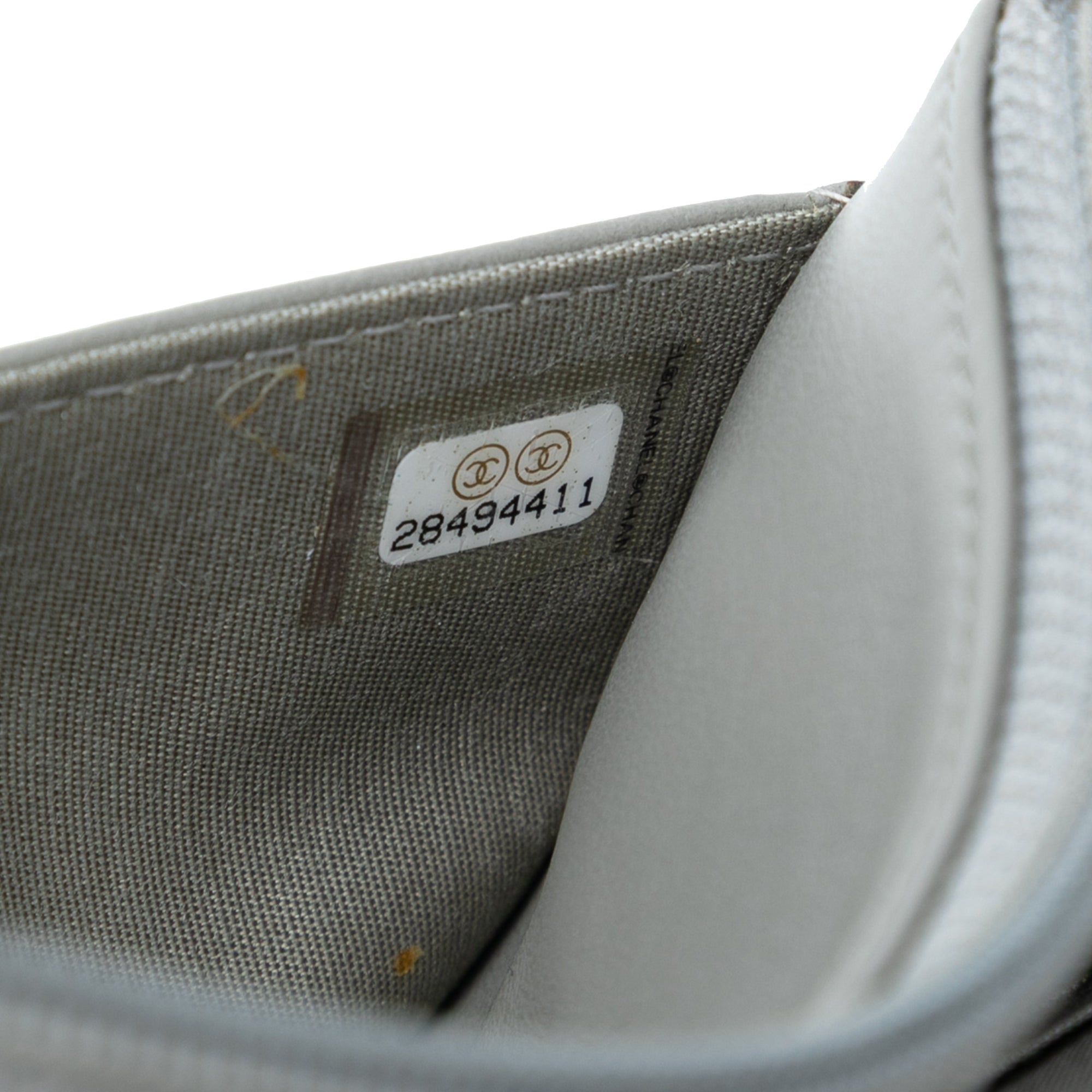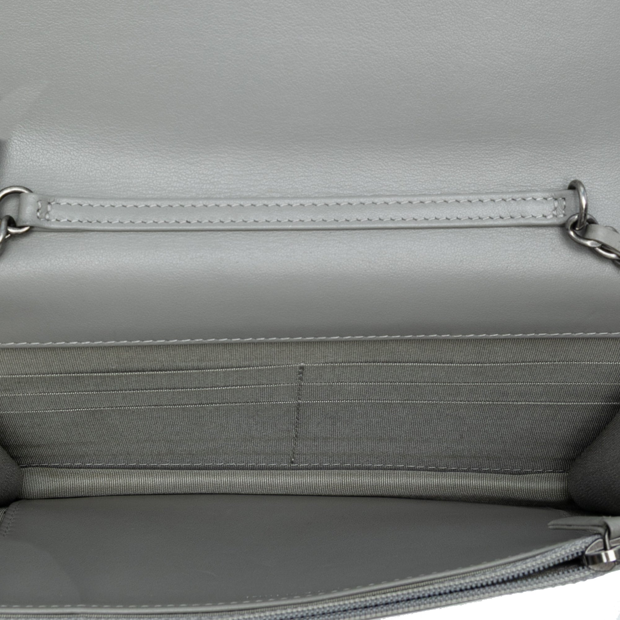 This wallet on chain features a quilted calf leather body, a silver-tone leather-woven chain link strap, a tassel detail, a front flap with magnetic snap closure, and interior zip and slip pockets. Retail Price: 3350.00