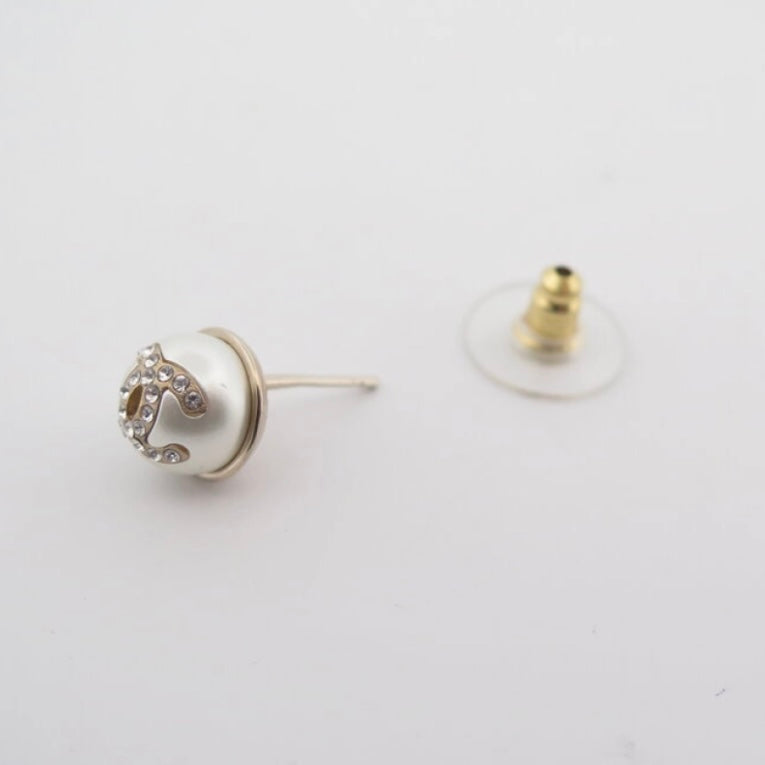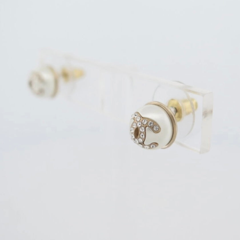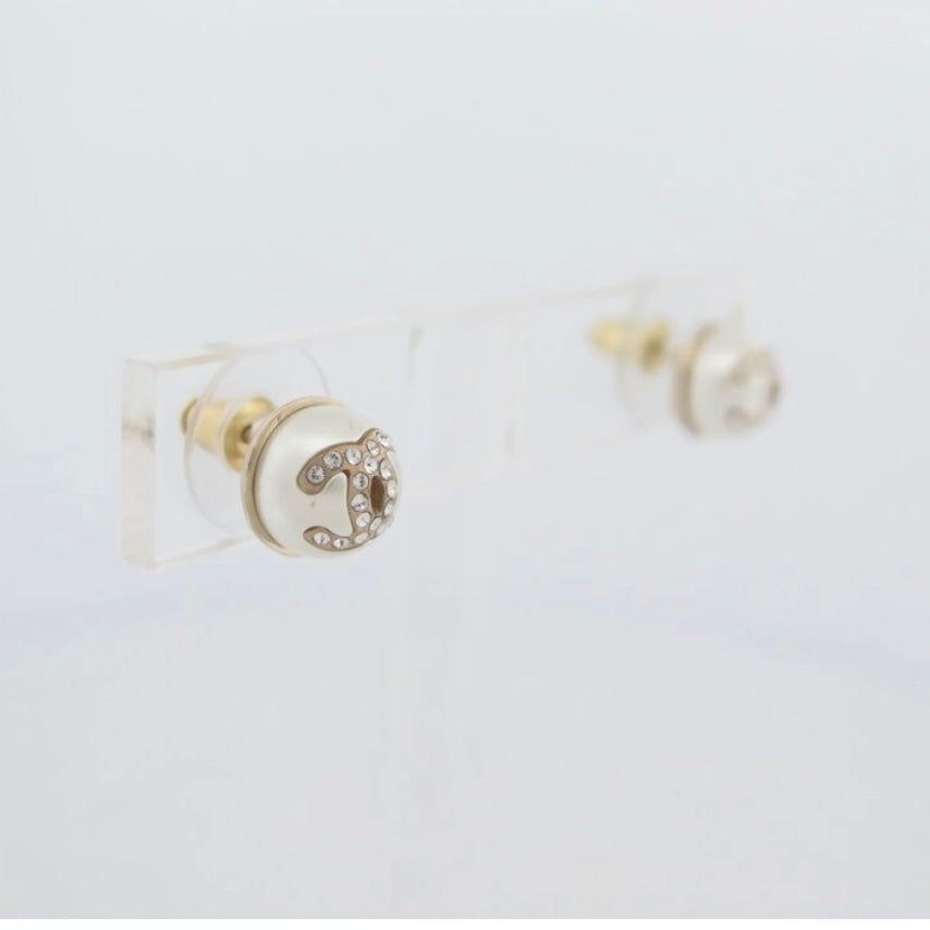 Small pearl earrings with rhinestone-encrusted Cc. gold metal. punch present on the back. very good condition. sold in a neutral box. about 1cm wide/high