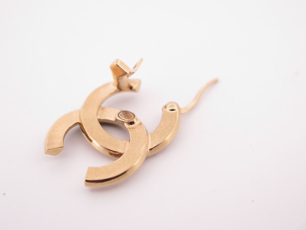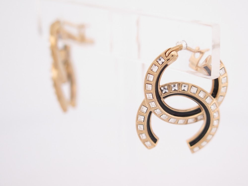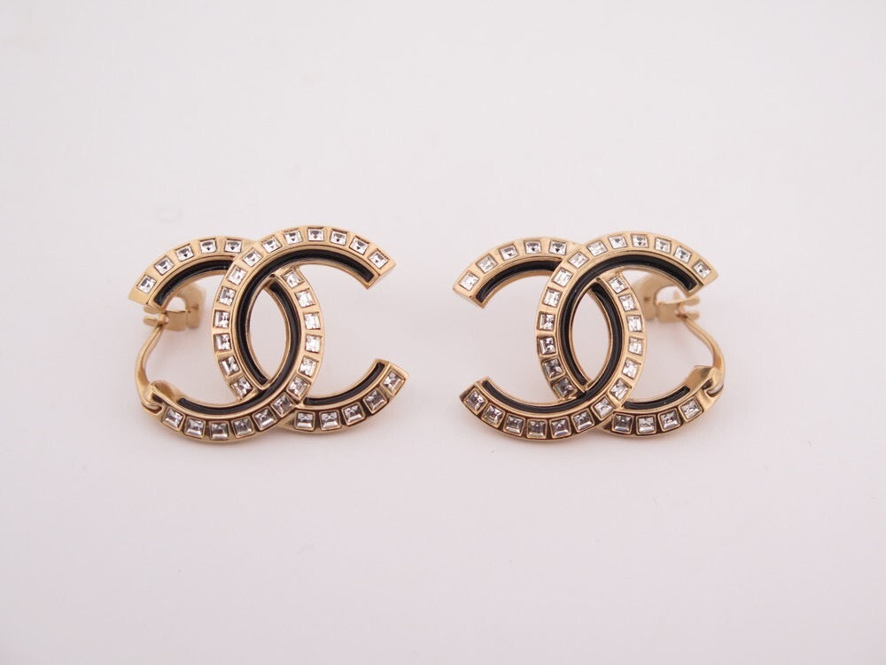 Chanel drop earrings. champagne gold metal. black edges and rhinestones. about 2.6*2cm. punch present. sold in a neutral box. excellent condition