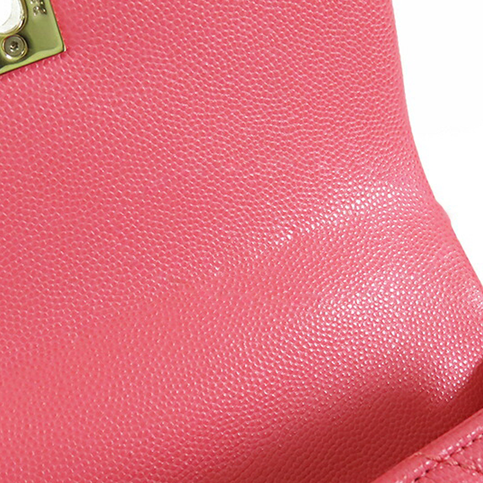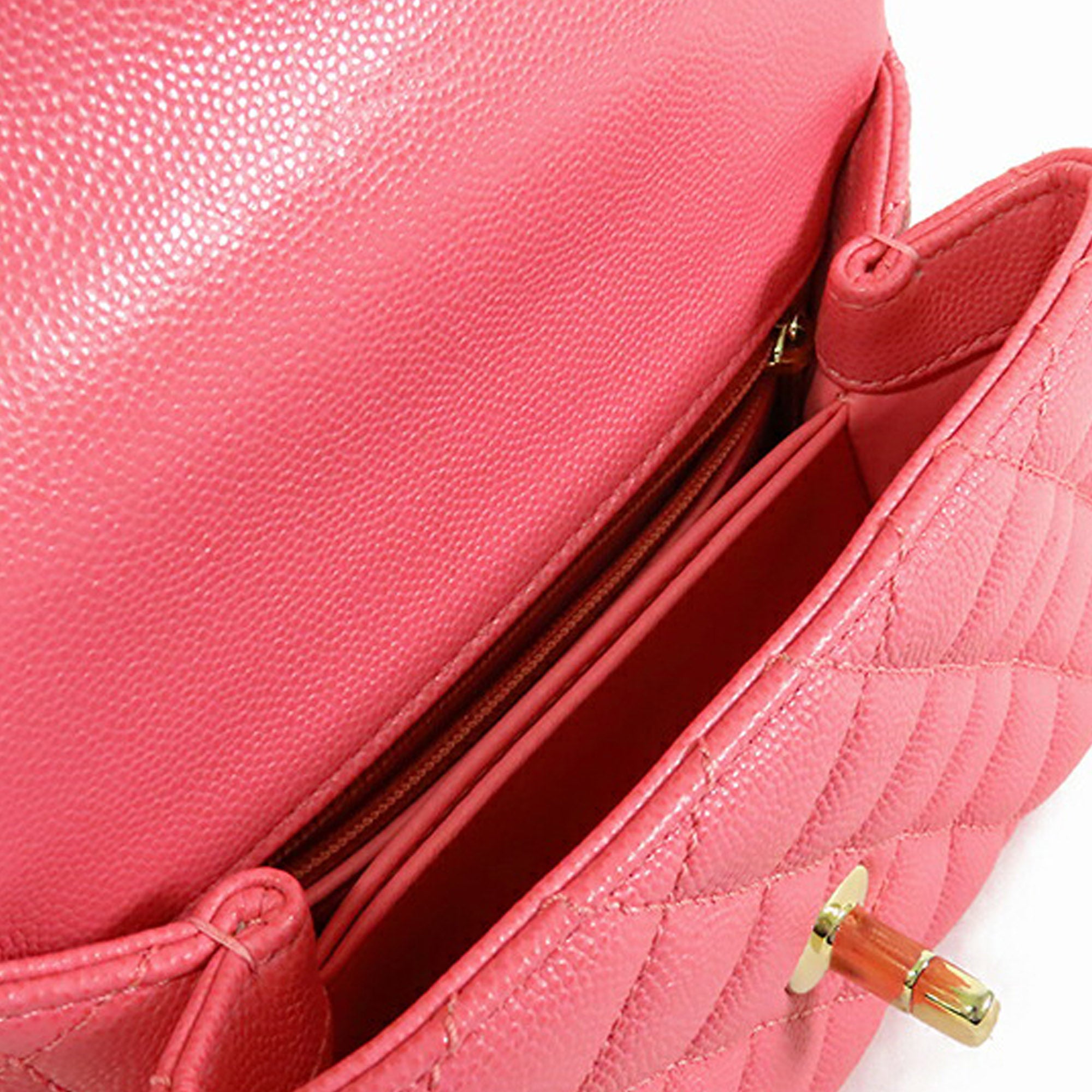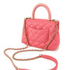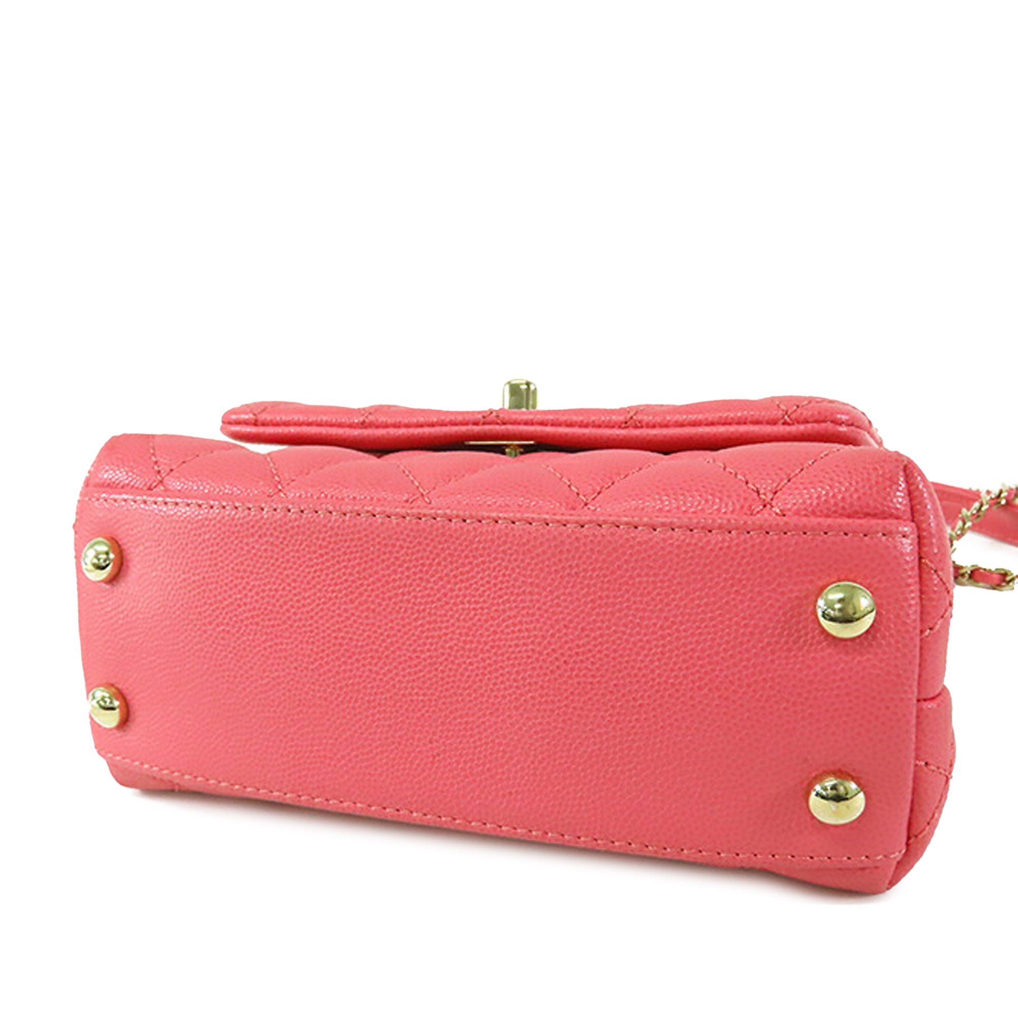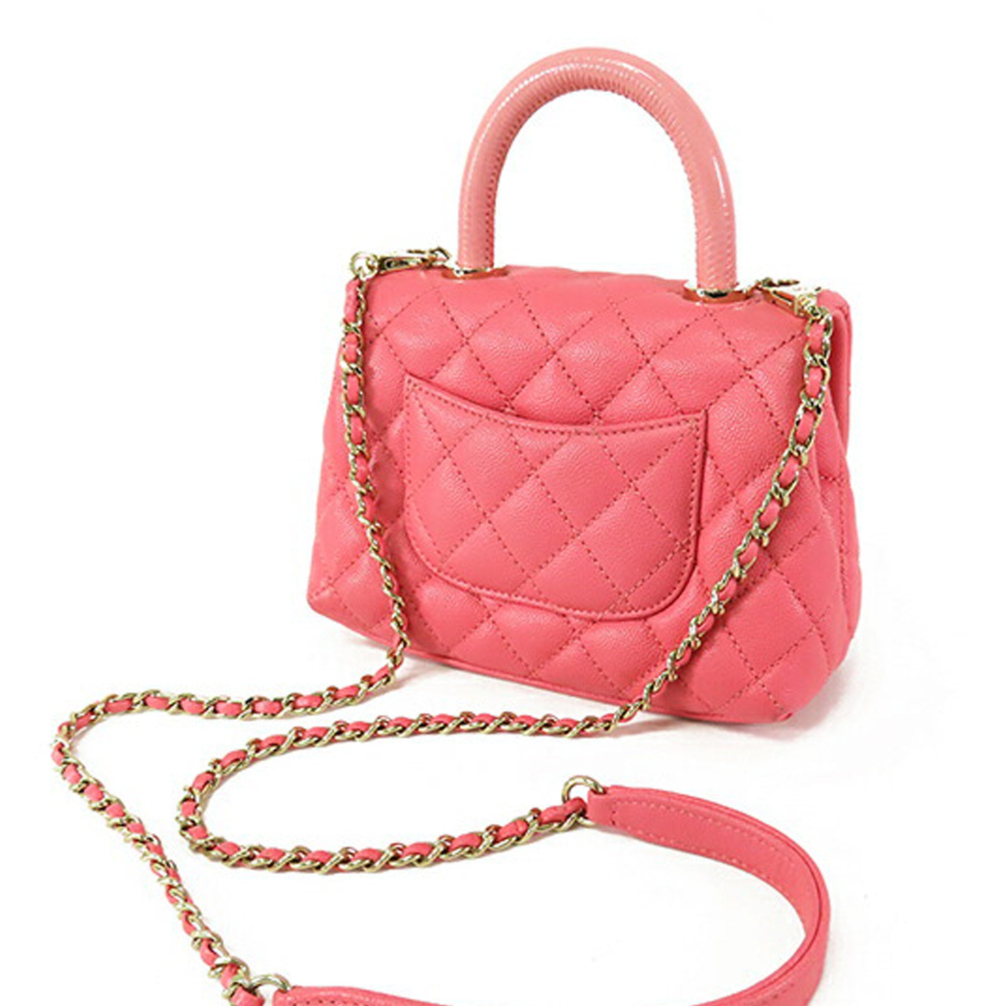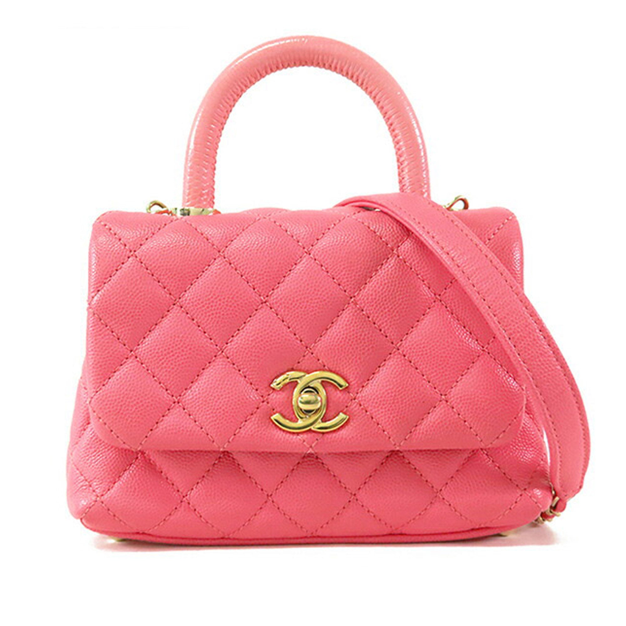 The Coco Handle bag features a quilted caviar leather body, a rolled leather top handle, a detachable leather woven-in chain strap, a front flap with twist lock closure, an exterior back slip pocket, and interior zip and slip pockets. Retail Price: 8000.00
