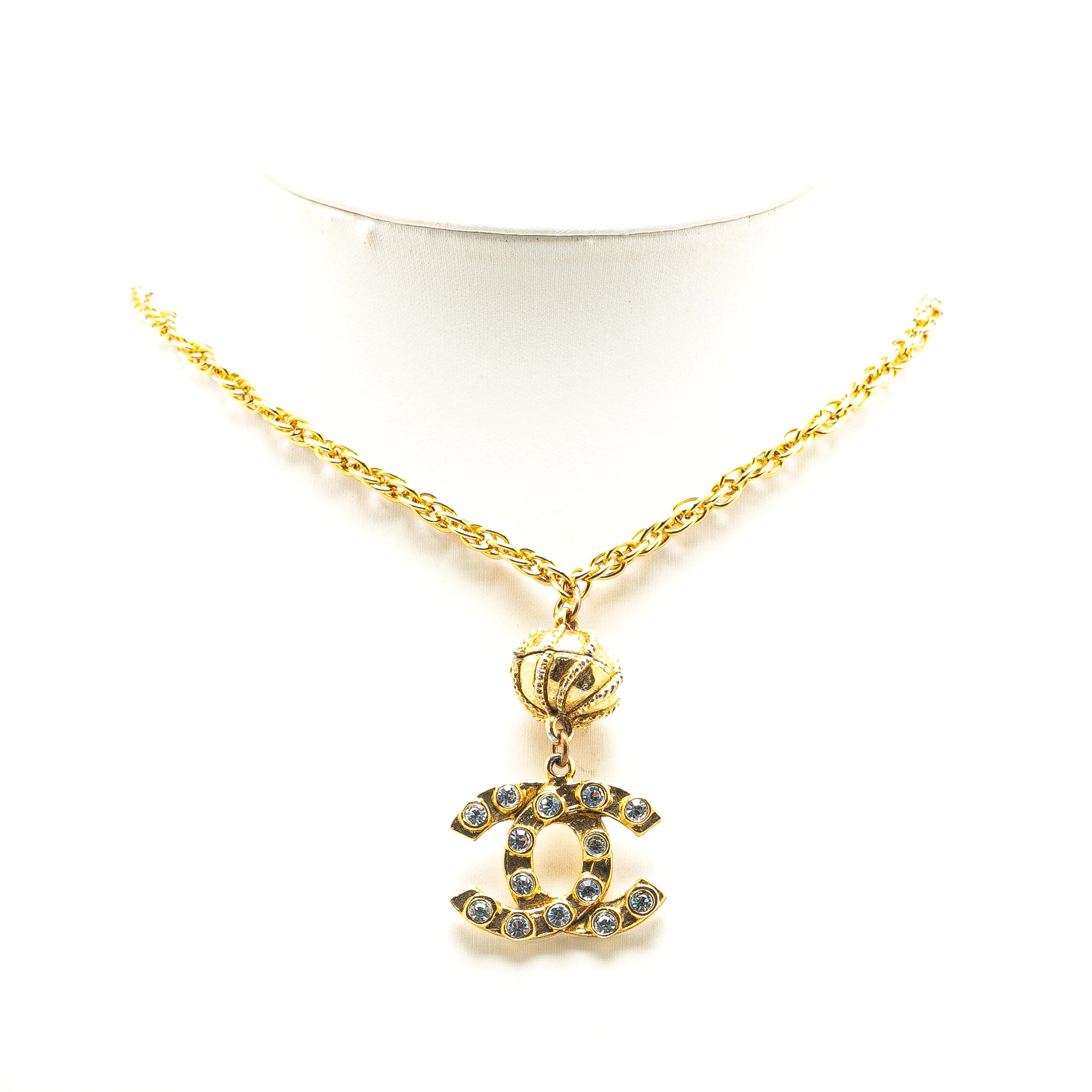 This necklace features a gold-plated chain and CC pendant with rhinestone details, and a spring ring closure. Retail Price: 1600.00
