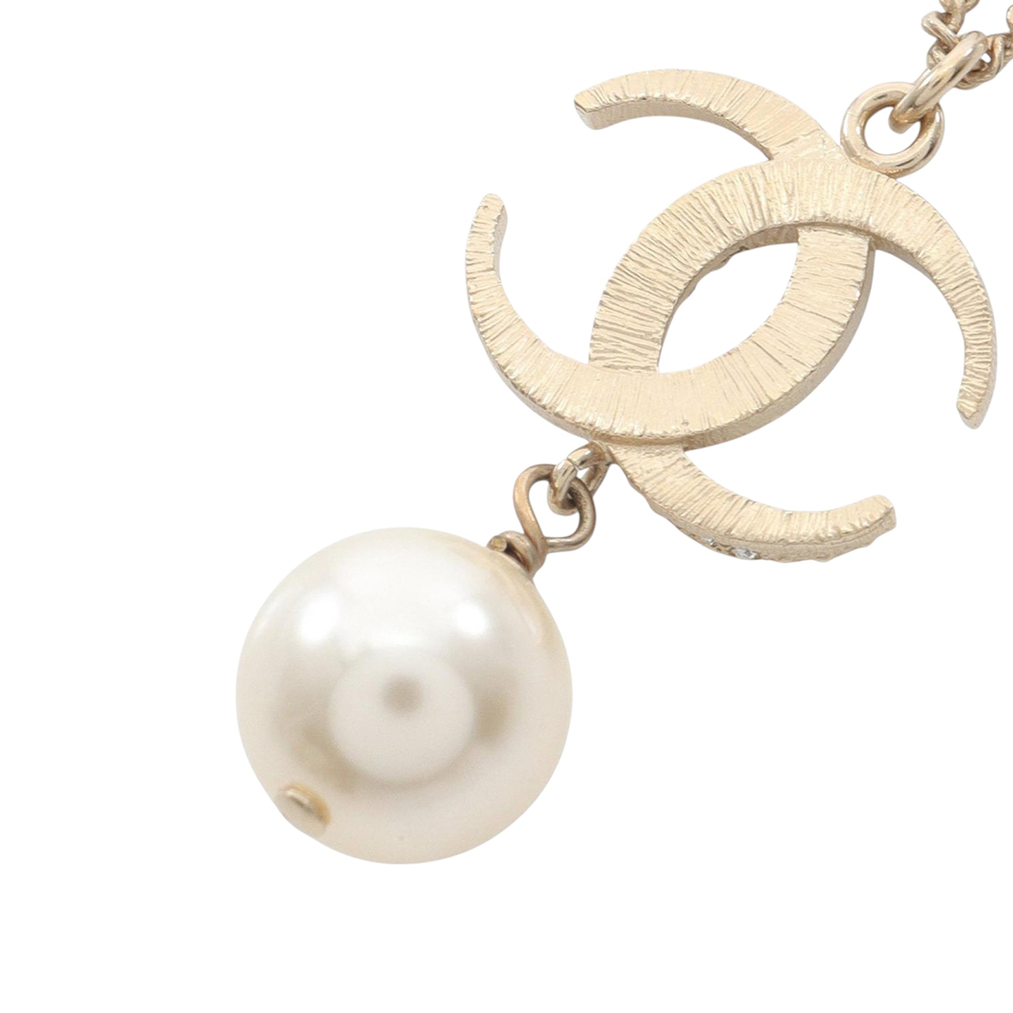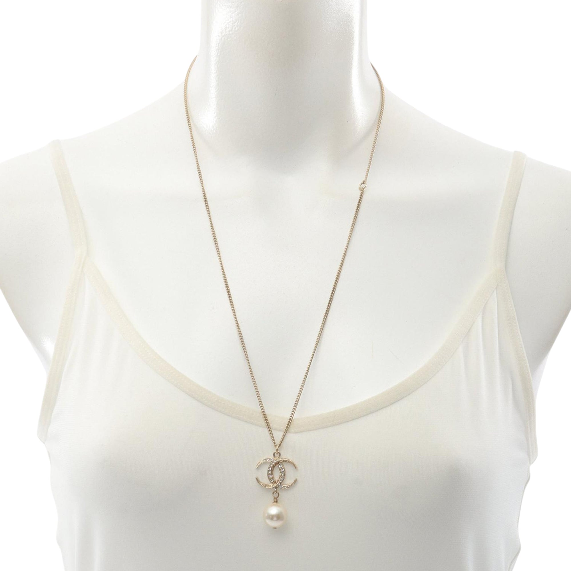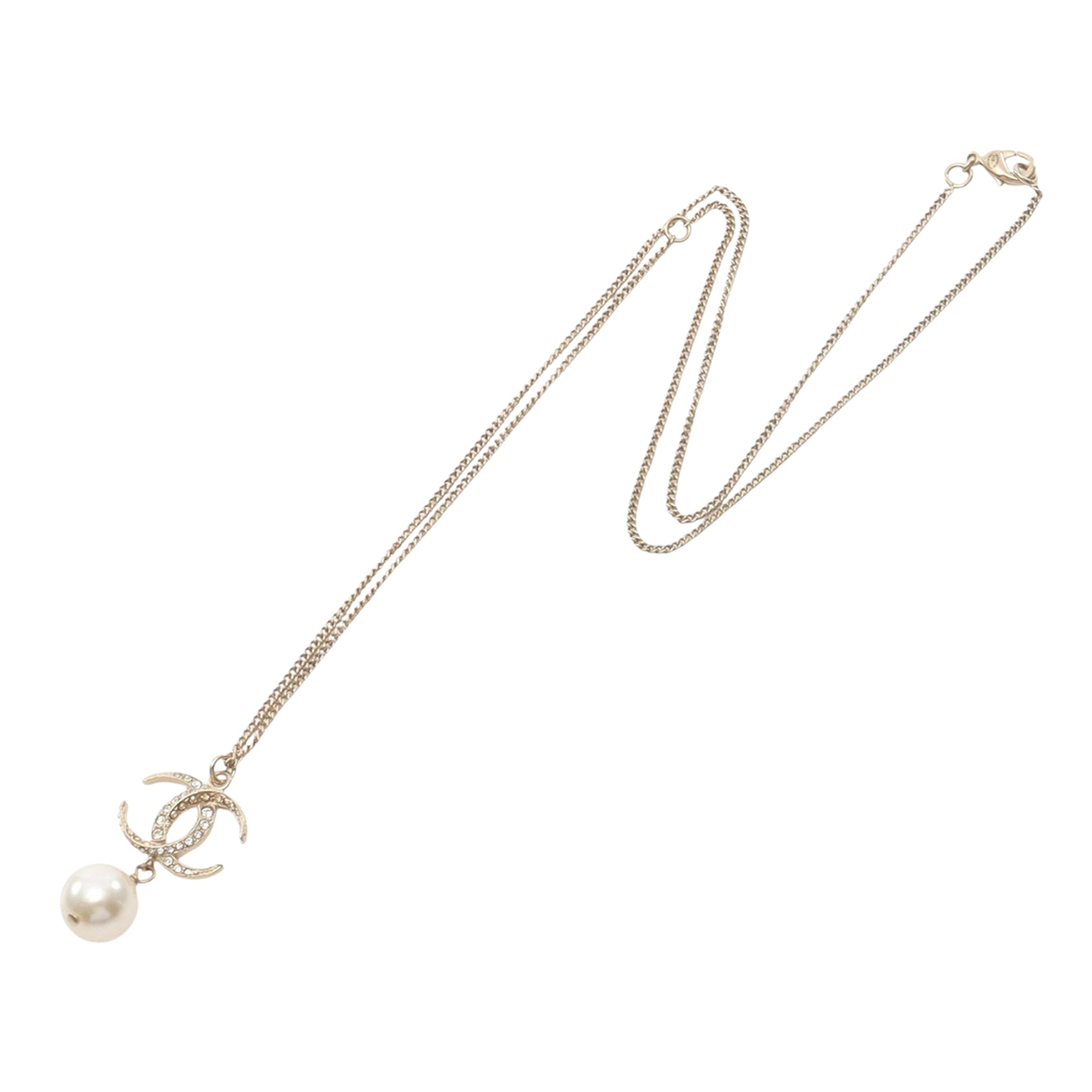This necklace features a gold-tone chain with a pearl and rhinestone-embellished CC logo pendant, and a lobster clasp closure. Retail Price: 767.00