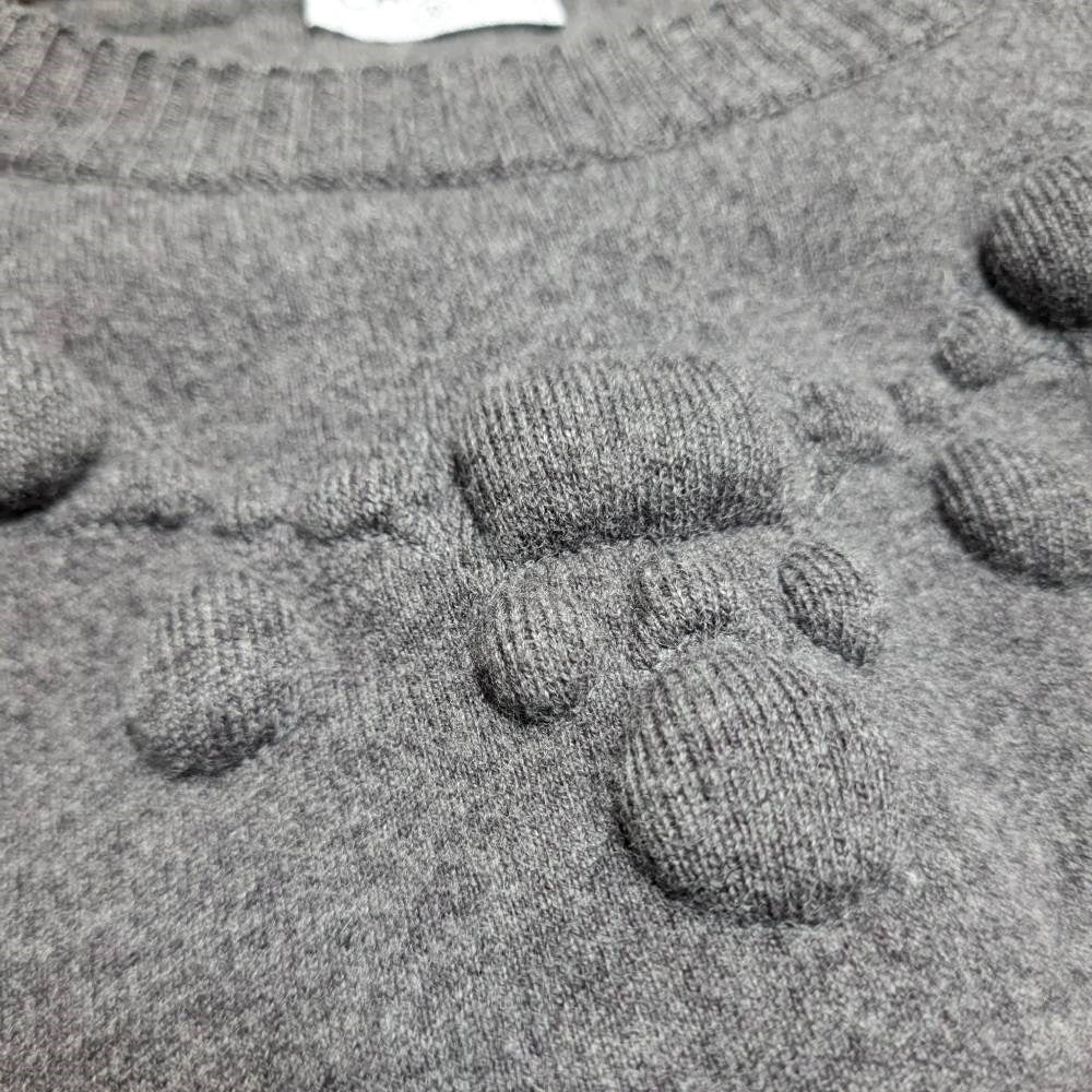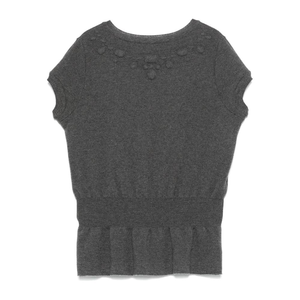 Chanel 2010s grey wool top with embossed motif. Ribbed crewneck, cap short sleeves, tone-on-tone trompe-l'oeil necklace motif with padding, elasticated waist and ruffled hem.