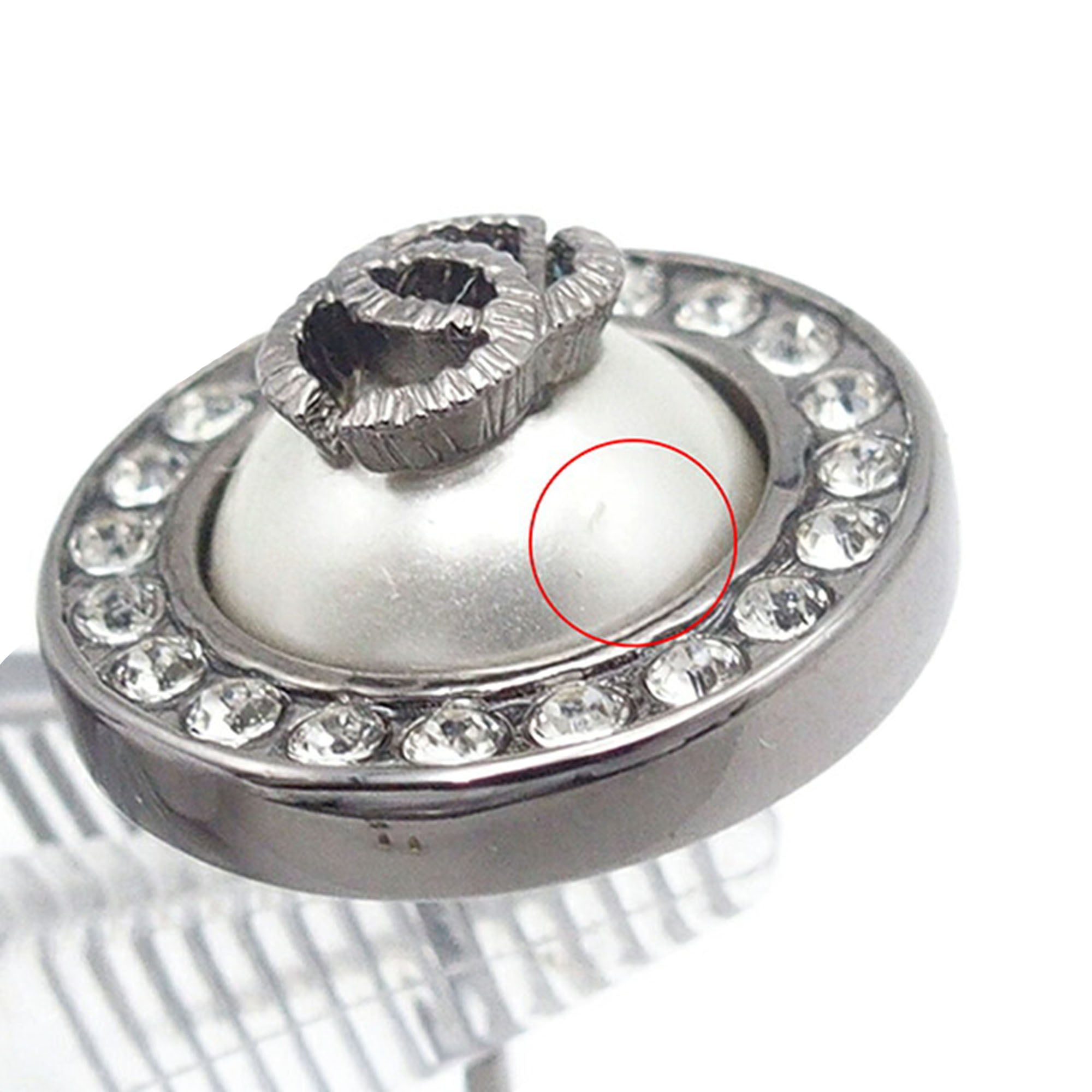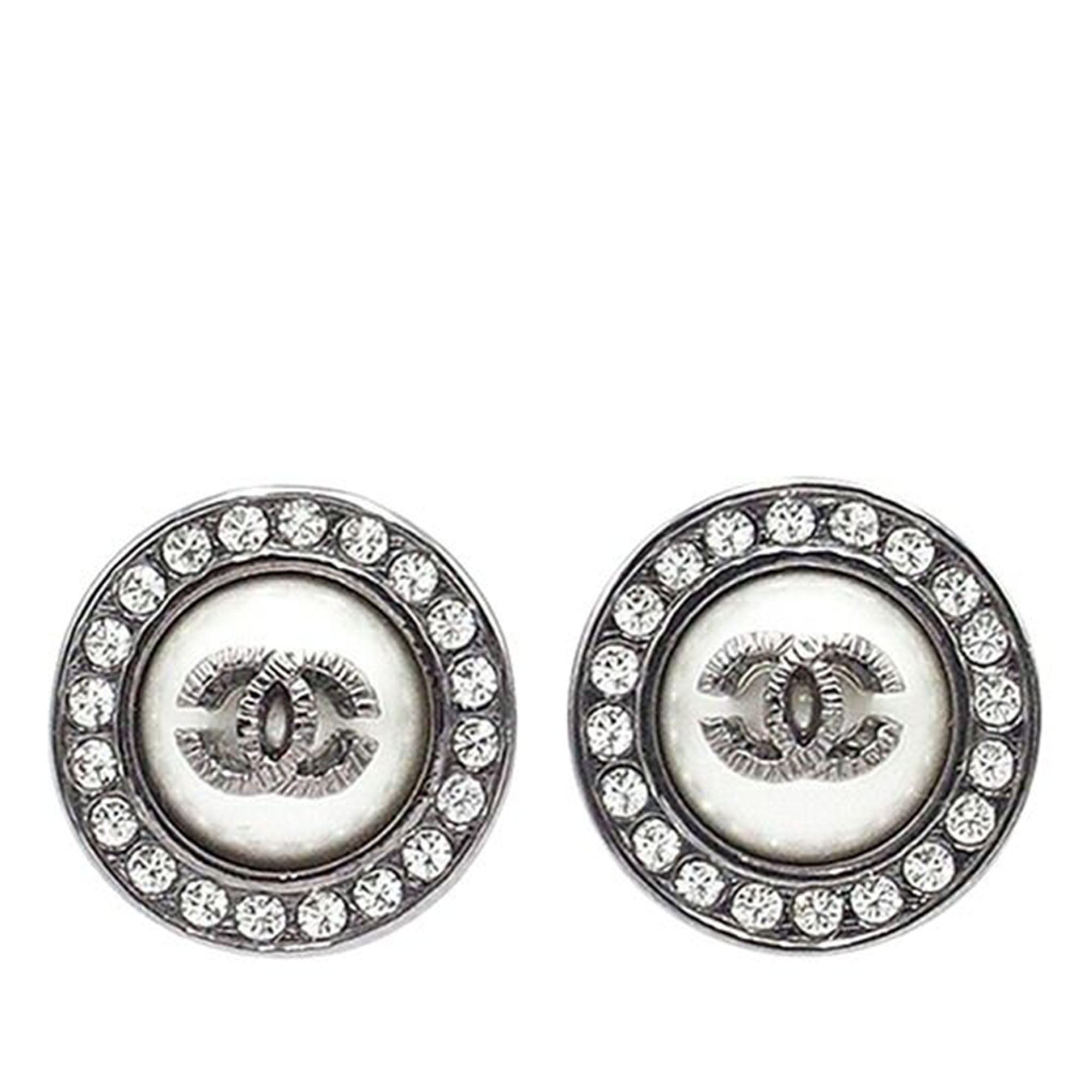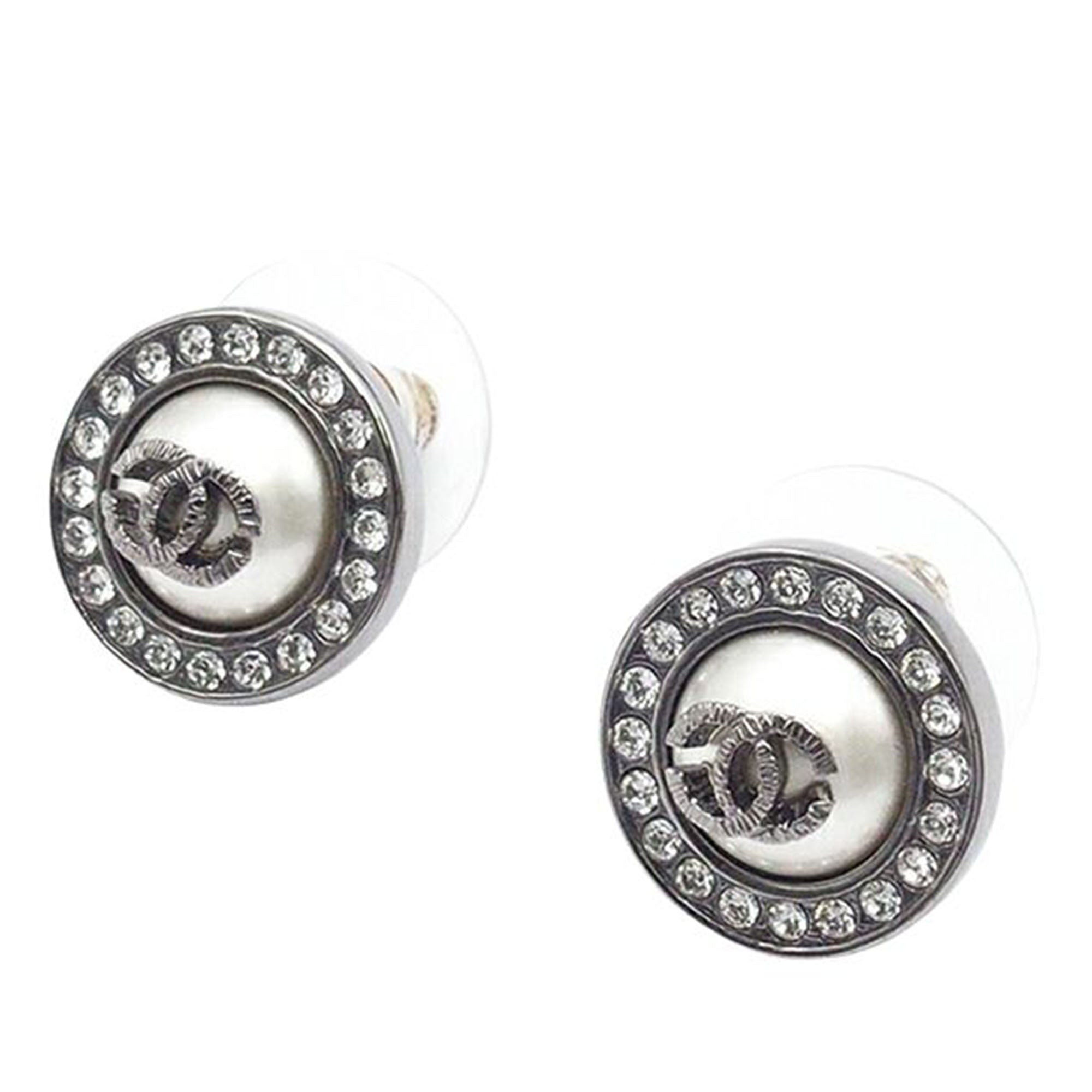Chanel Gunmetal Plated CC Faux Pearl and Crystal Round Push Back Earrings Secondhand