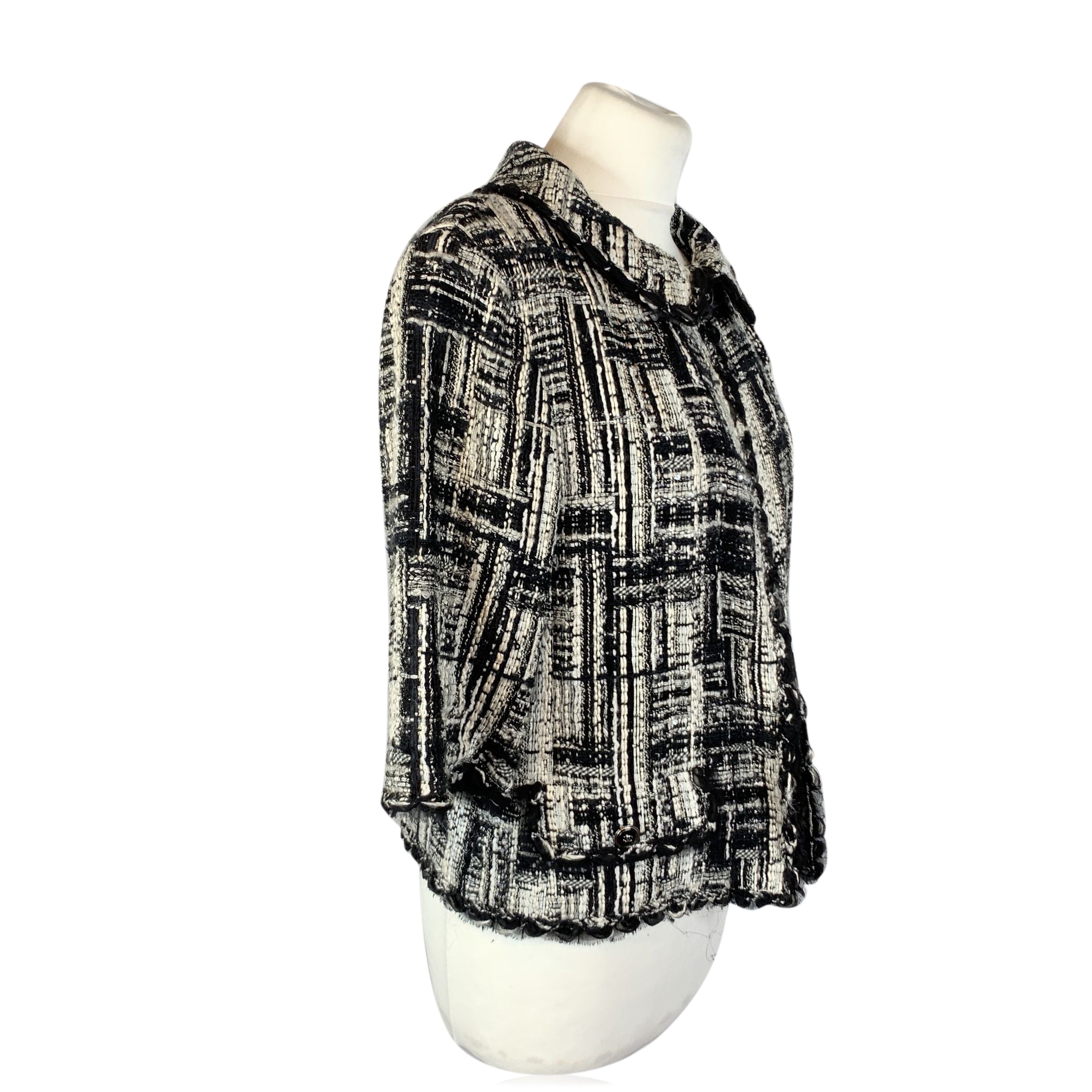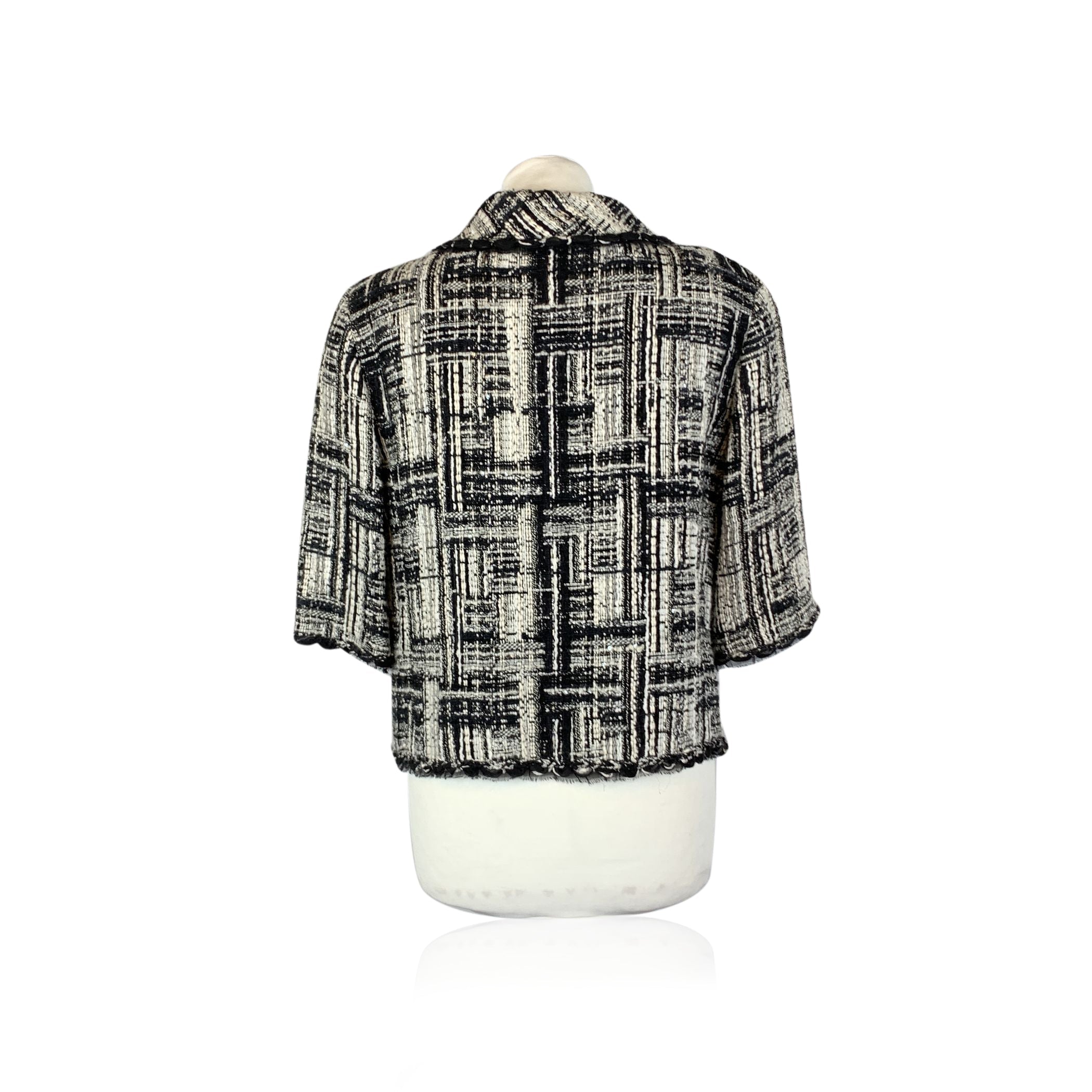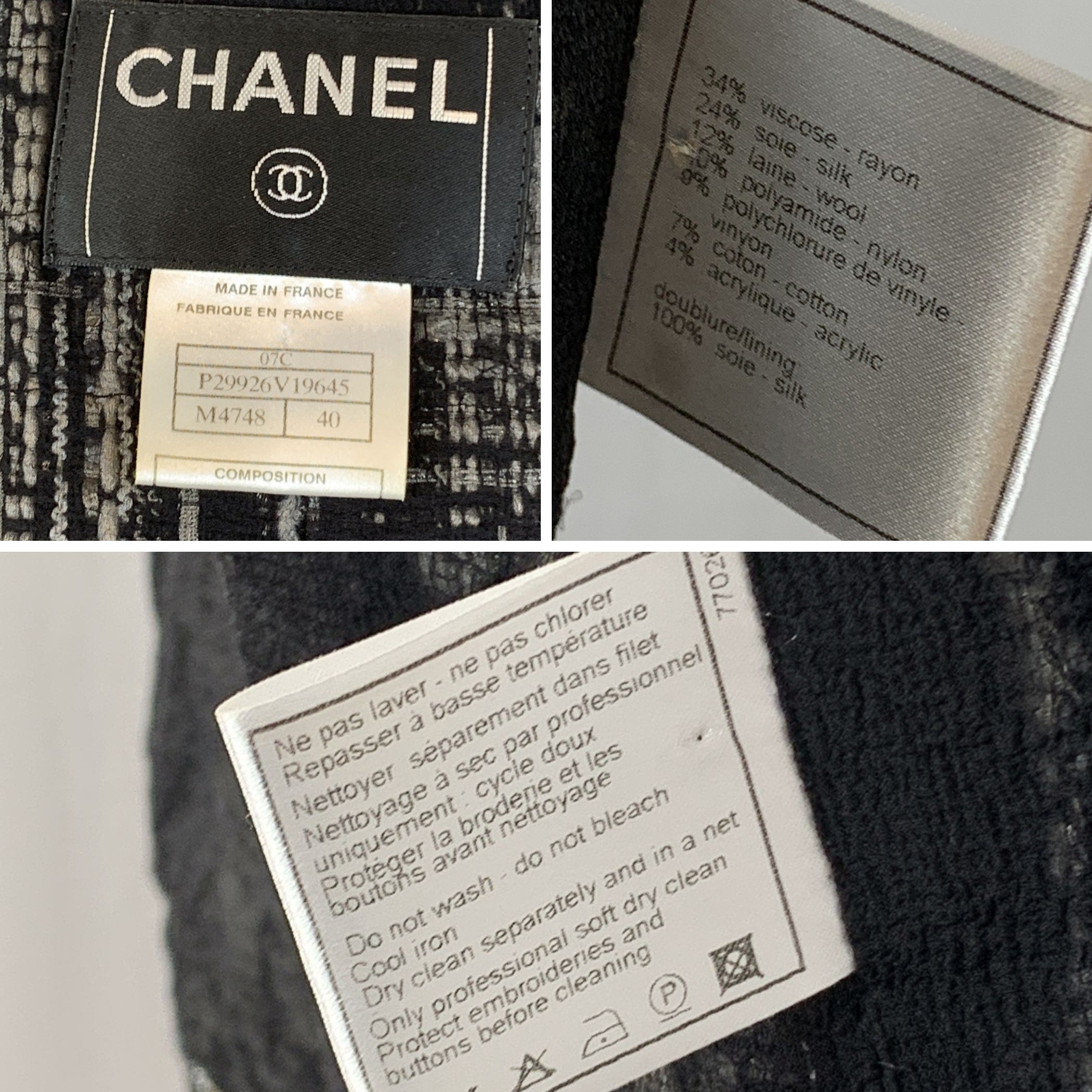 Step Into Timeless Elegance With This Stunning Piece From The Chanel Spring Resort 2007 Collection. This Sophisticated Gem Embodies The Chic Sophistication That Defines The Iconic Brand, Offering a Bold, Yet Refined Design Perfect For Any Stylish Wardrobe. Crafted In a Thick, Contrasting Black-and-white Tweed Blend, The Fabric Is Beautifully Threaded With Shimmering Silver Metallic Accents And Delicate Sequins, Creating a Luxurious Texture That Catches The Light With Every Movement. The Design Features a Classic Collared Neckline, Complemented By a Single Button Closure And Two Small Front Flap Pockets-each Adorned With The Signature Chanel Logo Buttons For That Unmistakable Touch Of Luxury. The 3/4 Length Sleeves Add a Modern Twist, While The Fine Sheer Black Mesh Lining Elevates The Overall Feel, Offering Both Elegance And Comfort In Perfect Harmony. This Piece, Made In France, Combines a Sophisticated Mix Of Materials: 34% Viscose, 34% Silk, 12% Wool, And 9% Polychlorure, With a 100% Silk Lining That Ensures a Soft, Breathable Fit. A True Testament To Chanel's Craftsmanship, This Jacket Is a Must-have For Any Lover Of Classic Fashion. Tag Size: 40 Fr (Estimated It Size: 44 It) A Collector's Item That Will Never Go Out Of Style, This Piece Is The Epitome Of Understated Luxury, Ready To Be Cherished For Years To Come.