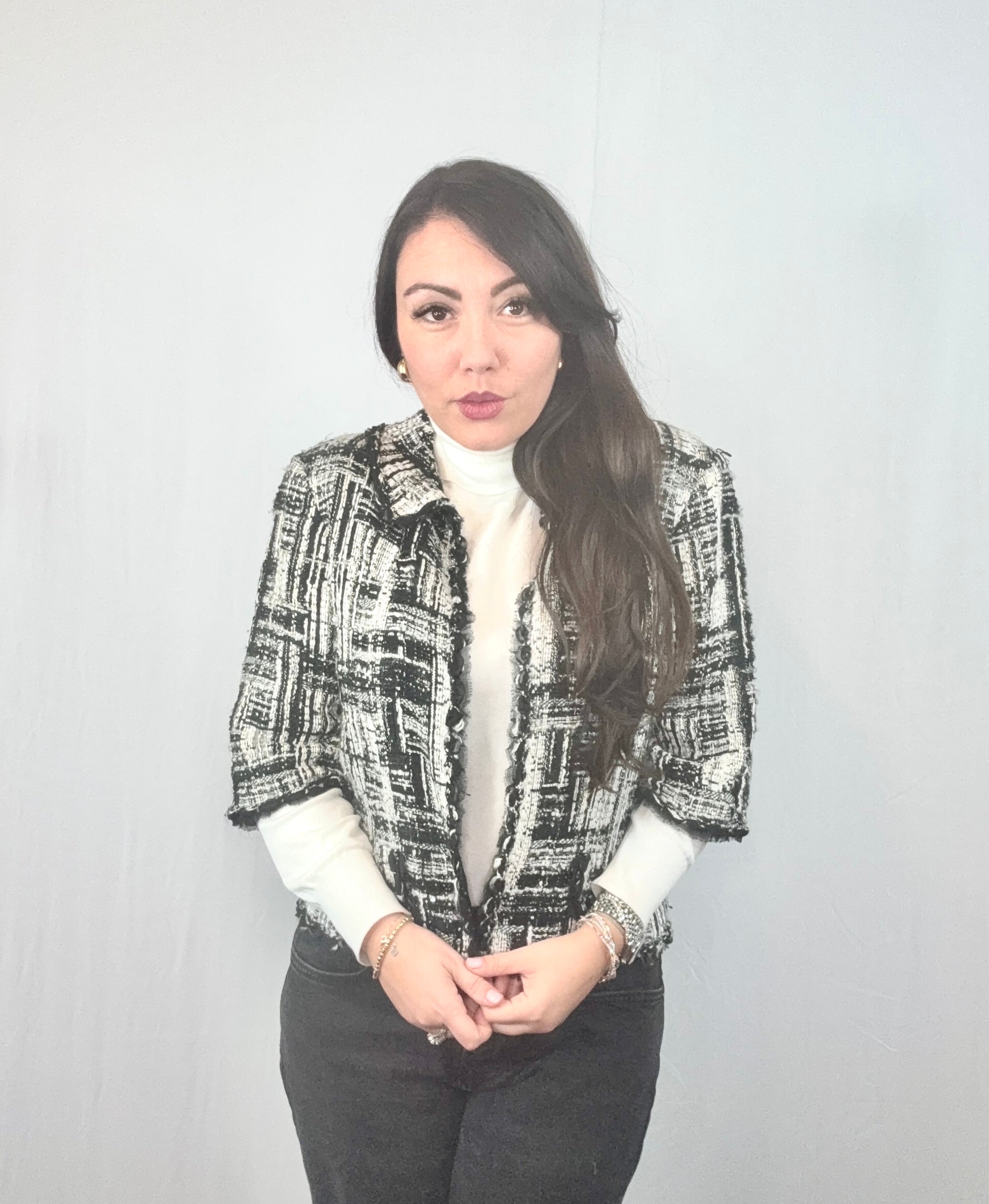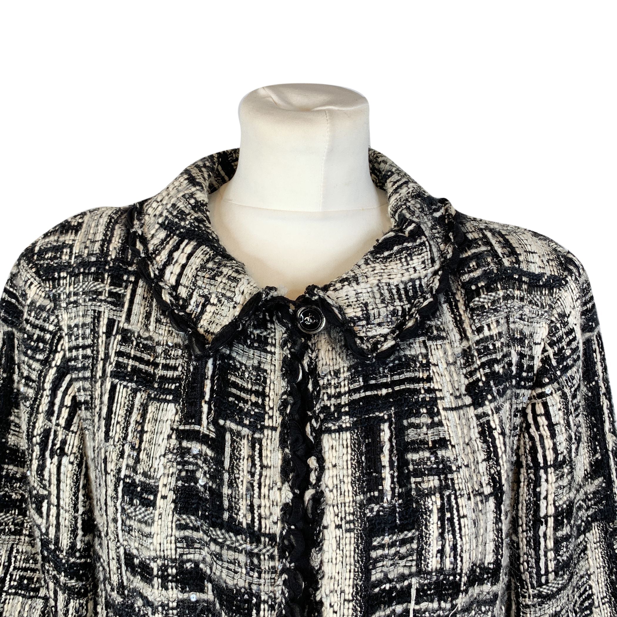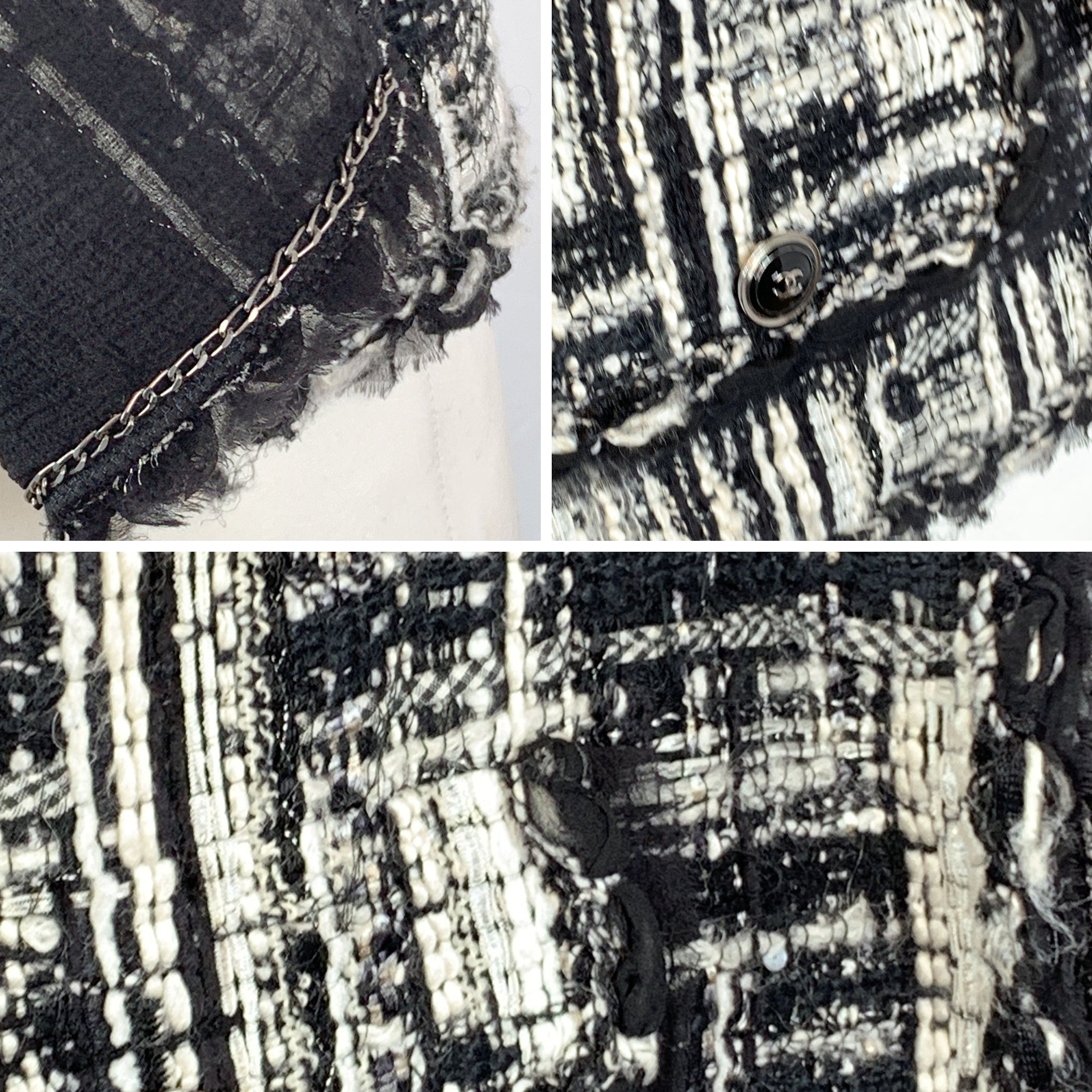 Step Into Timeless Elegance With This Stunning Piece From The Chanel Spring Resort 2007 Collection. This Sophisticated Gem Embodies The Chic Sophistication That Defines The Iconic Brand, Offering a Bold, Yet Refined Design Perfect For Any Stylish Wardrobe. Crafted In a Thick, Contrasting Black-and-white Tweed Blend, The Fabric Is Beautifully Threaded With Shimmering Silver Metallic Accents And Delicate Sequins, Creating a Luxurious Texture That Catches The Light With Every Movement. The Design Features a Classic Collared Neckline, Complemented By a Single Button Closure And Two Small Front Flap Pockets-each Adorned With The Signature Chanel Logo Buttons For That Unmistakable Touch Of Luxury. The 3/4 Length Sleeves Add a Modern Twist, While The Fine Sheer Black Mesh Lining Elevates The Overall Feel, Offering Both Elegance And Comfort In Perfect Harmony. This Piece, Made In France, Combines a Sophisticated Mix Of Materials: 34% Viscose, 34% Silk, 12% Wool, And 9% Polychlorure, With a 100% Silk Lining That Ensures a Soft, Breathable Fit. A True Testament To Chanel's Craftsmanship, This Jacket Is a Must-have For Any Lover Of Classic Fashion. Tag Size: 40 Fr (Estimated It Size: 44 It) A Collector's Item That Will Never Go Out Of Style, This Piece Is The Epitome Of Understated Luxury, Ready To Be Cherished For Years To Come.
