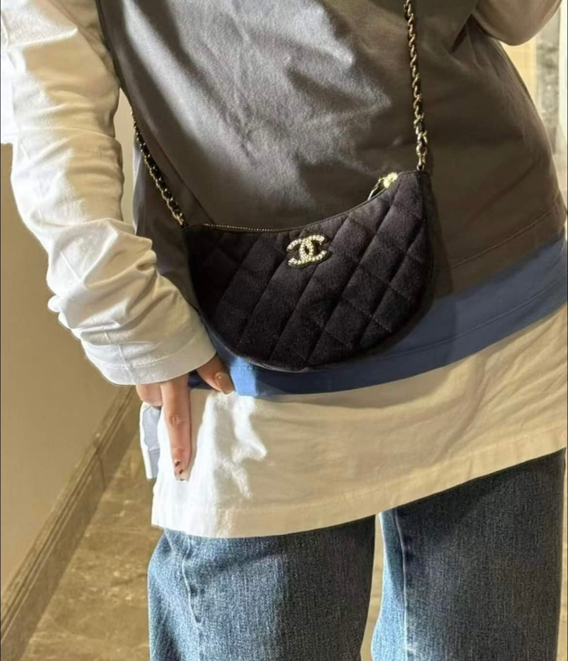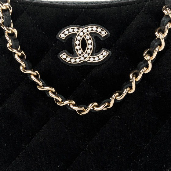 CHANEL hobo bag in velvet and black crystal chain This bag features a gold chain shoulder strap and a top zipper closure. It opens onto a black fabric interior. 11*17*3.5cm VIP model never worn with felt and box
