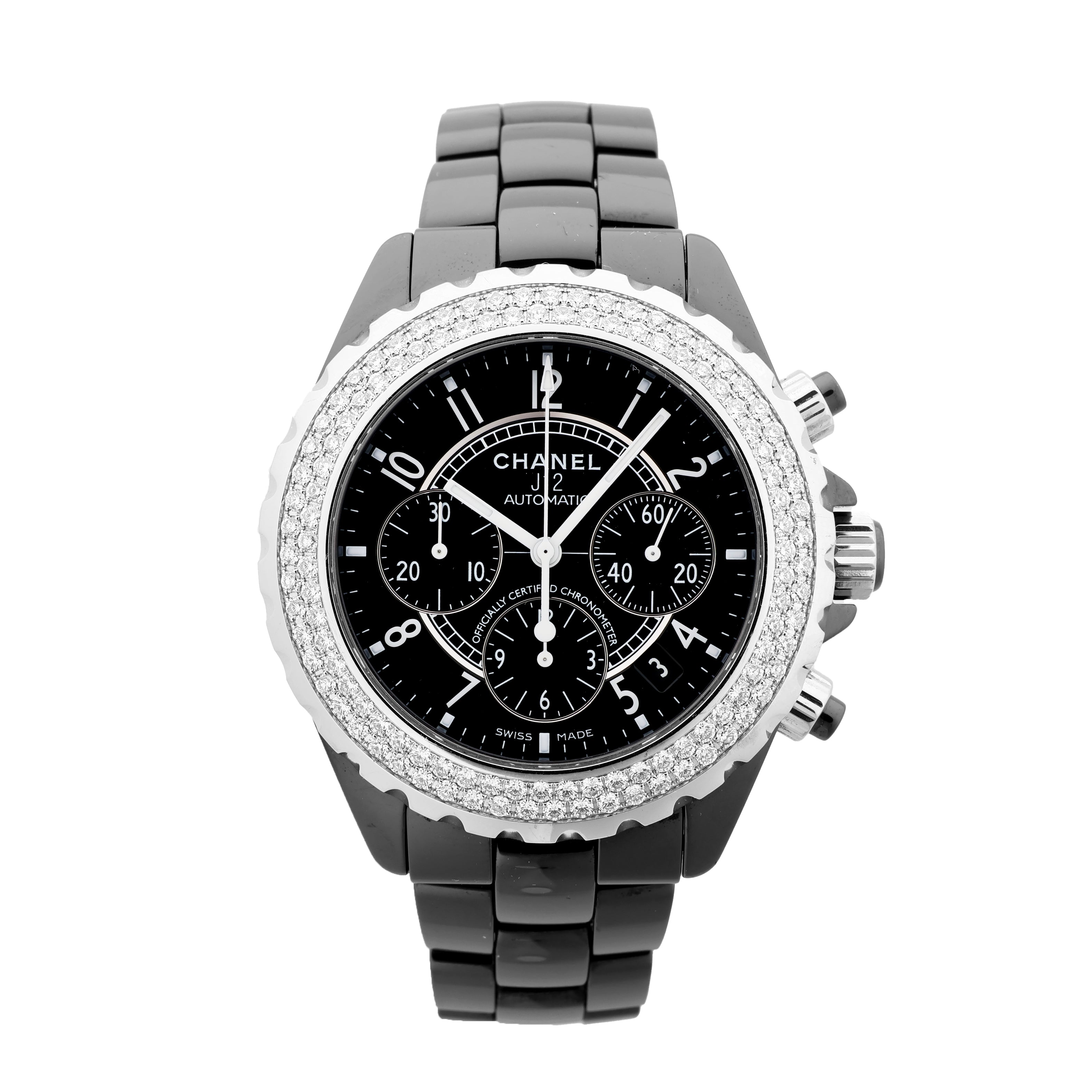 Chanel J12 H1009 watch in black ceramic and stainless steel, featuring a diamond-set bezel, chronograph functions, and automatic movement. A bold fusion of sporty elegance and luxurious sparkle.