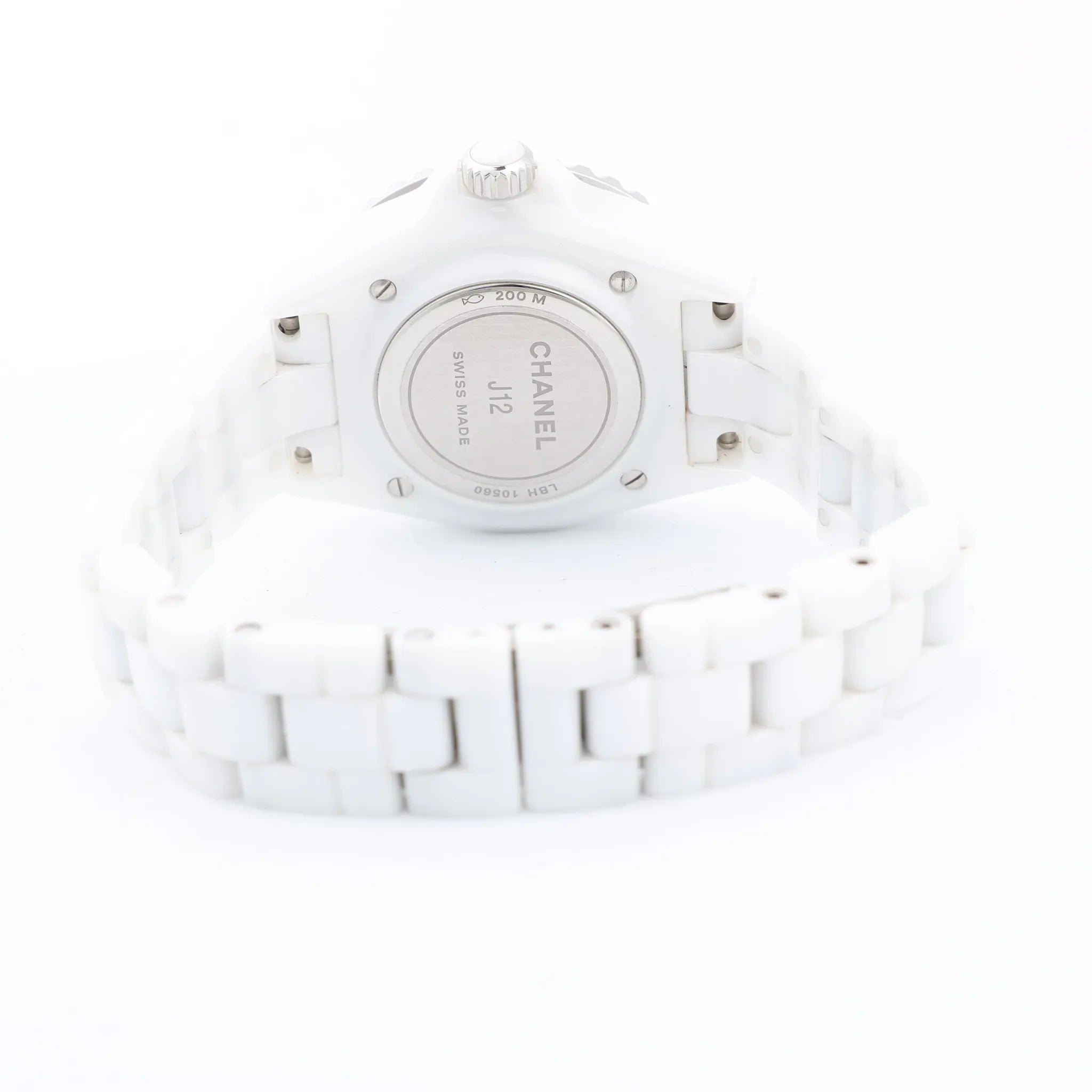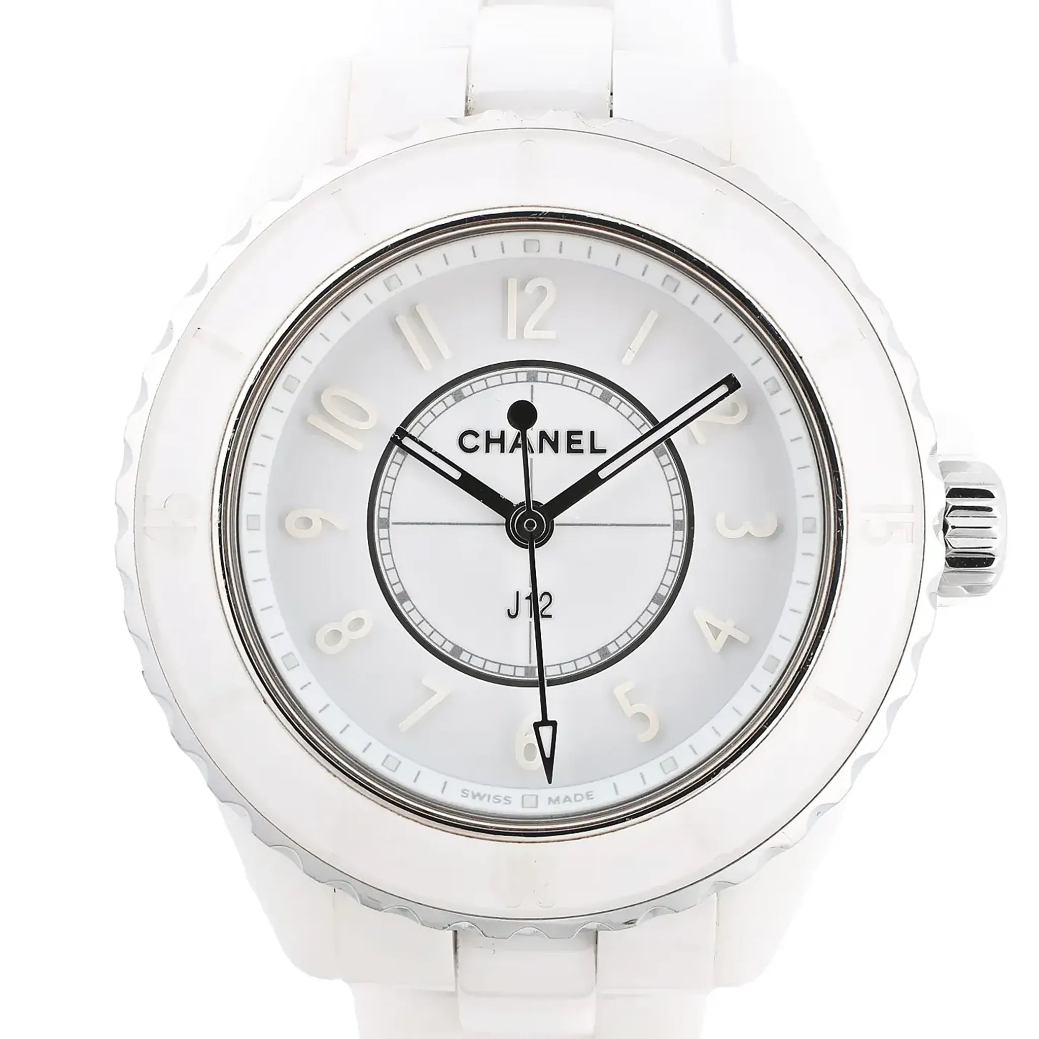 Brand: ChanelModel: J12Reference: H6345Condition: ExcellentCondition Details: Light signs of use, including subtle surface marks barely visible to the eye. Please see photos for the exact condition.Dial Colour: WhiteCase Material: Ceramic, Stainless SteelStarp Colour: WhiteStrap material: CeramicMovement: QuartzFace Diameter: 34 mmApprox. max circumference: 16.5 cmComes With: Box, Certificate, Booklet, Service card