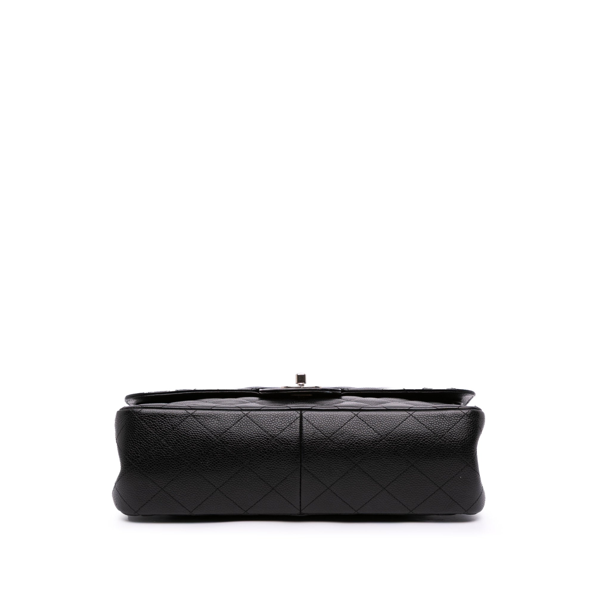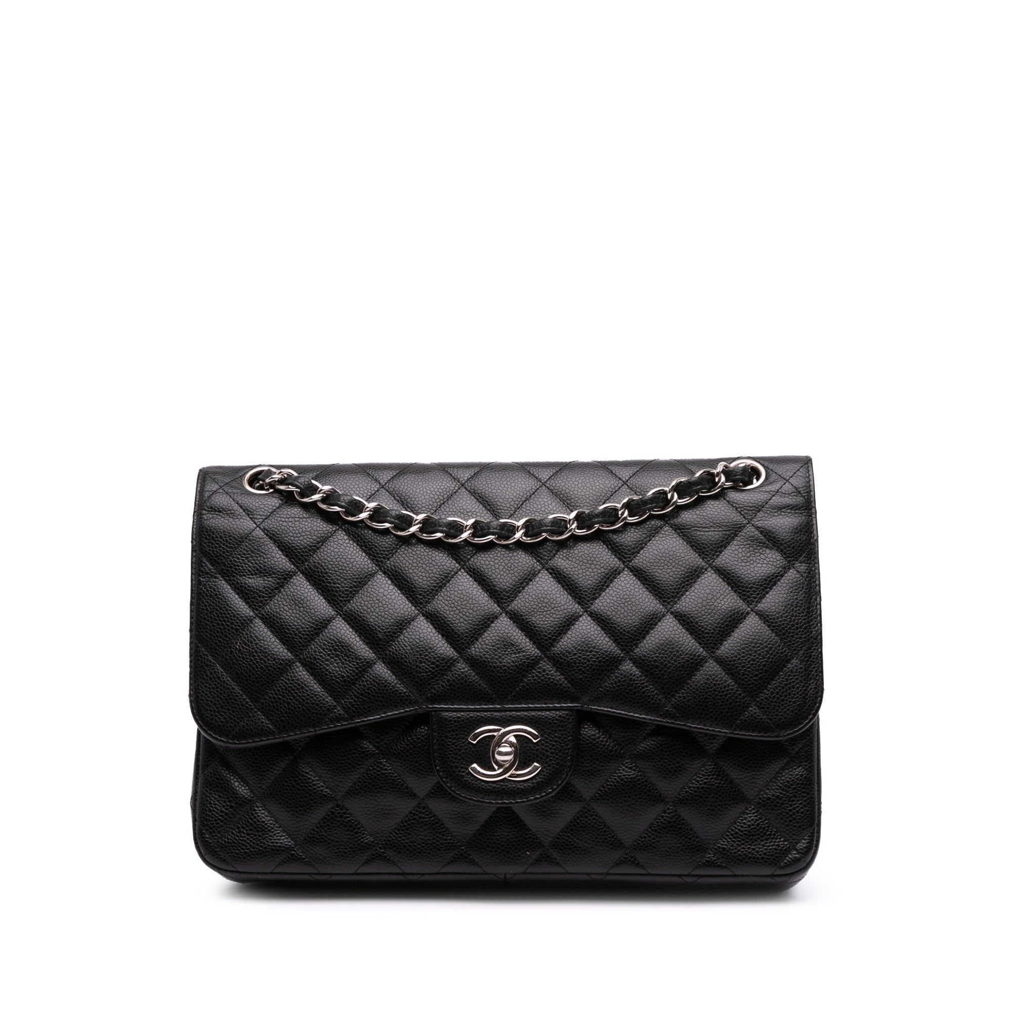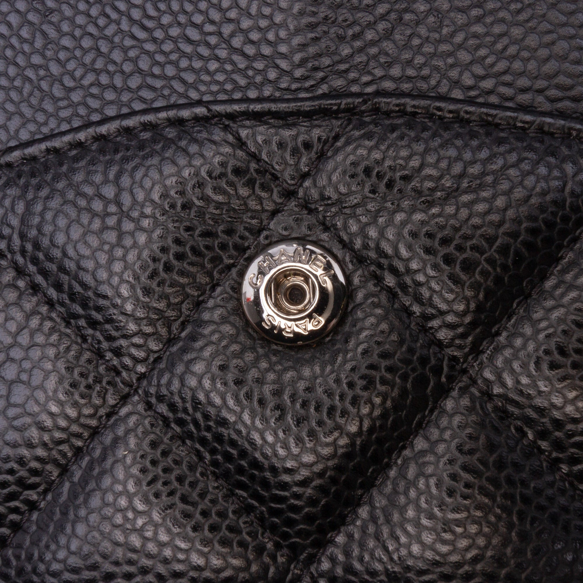 This shoulder bag features a quilted caviar leather body, leather woven chain link straps, a double top flap with CC turn-lock closure, an exterior back slip pocket, and interior zip and slip pockets. Retail Price: 10200.00