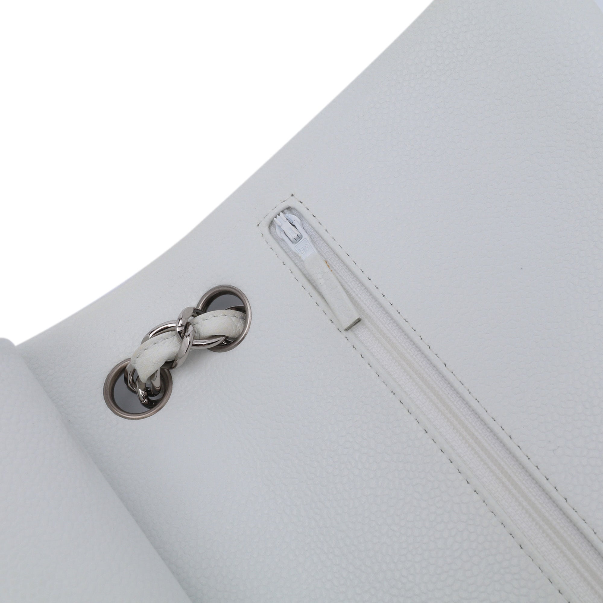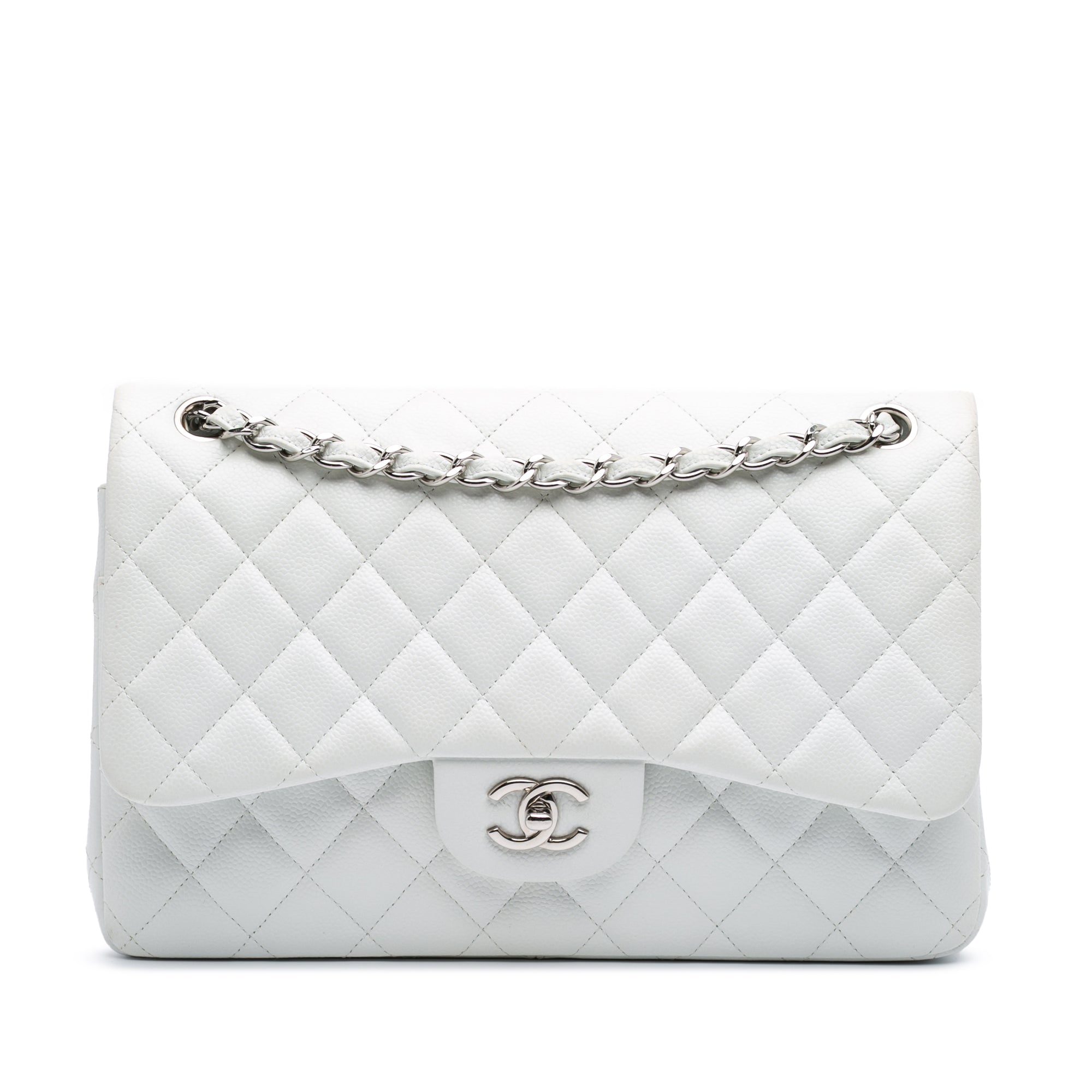 This shoulder bag features a quilted caviar leather body, leather woven chain straps, double front flaps with CC turn-lock closure, an exterior back slip pocket, and interior zip and slip pockets. Retail Price: 9600.00