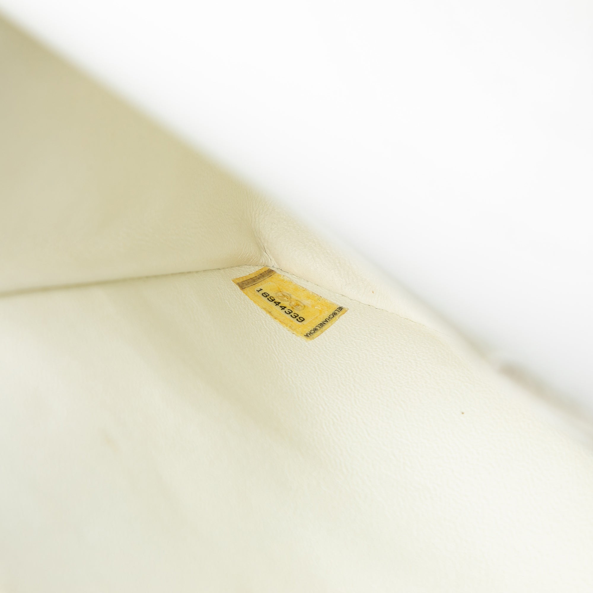 This shoulder bag features a quilted caviar leather body, leather woven chain straps, double front flaps with CC turn-lock closure, an exterior back slip pocket, and interior zip and slip pockets. Retail Price: 9600.00