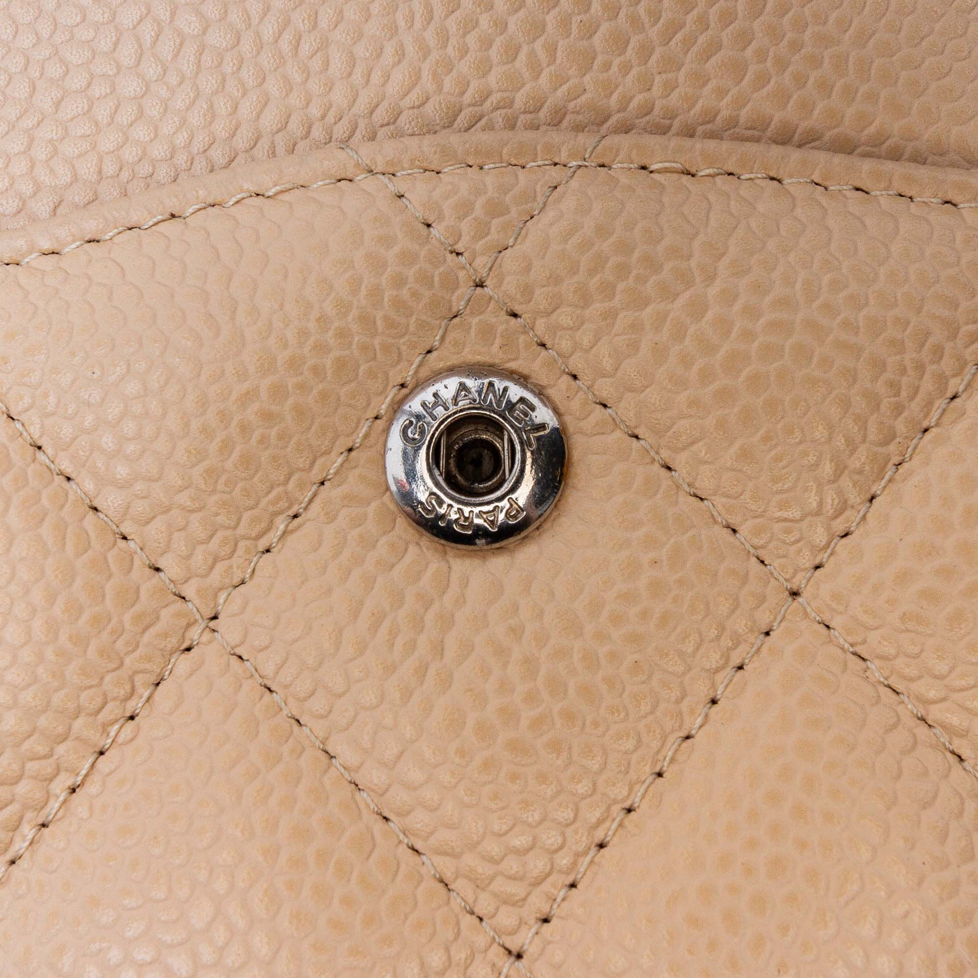 This shoulder bag features a quilted caviar leather body, leather woven chain straps, a double top flap with CC turn-lock closure, an exterior back slip pocket, and interior zip and slip pockets. Retail Price: 11000.00