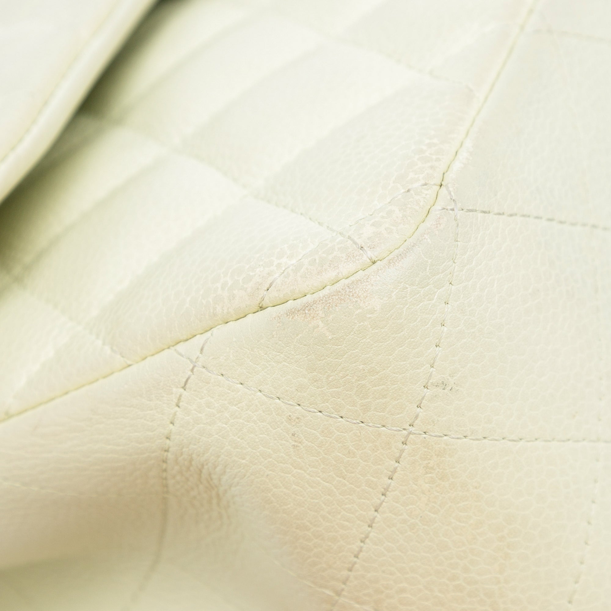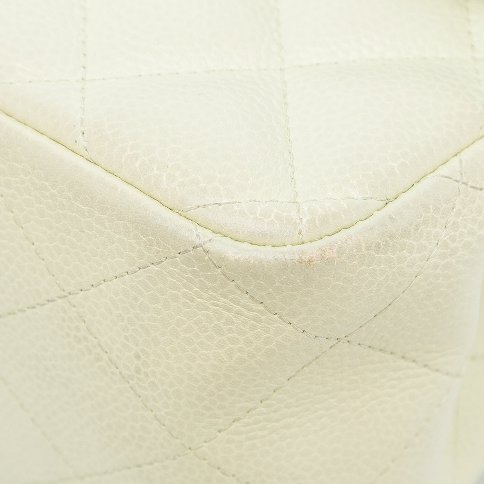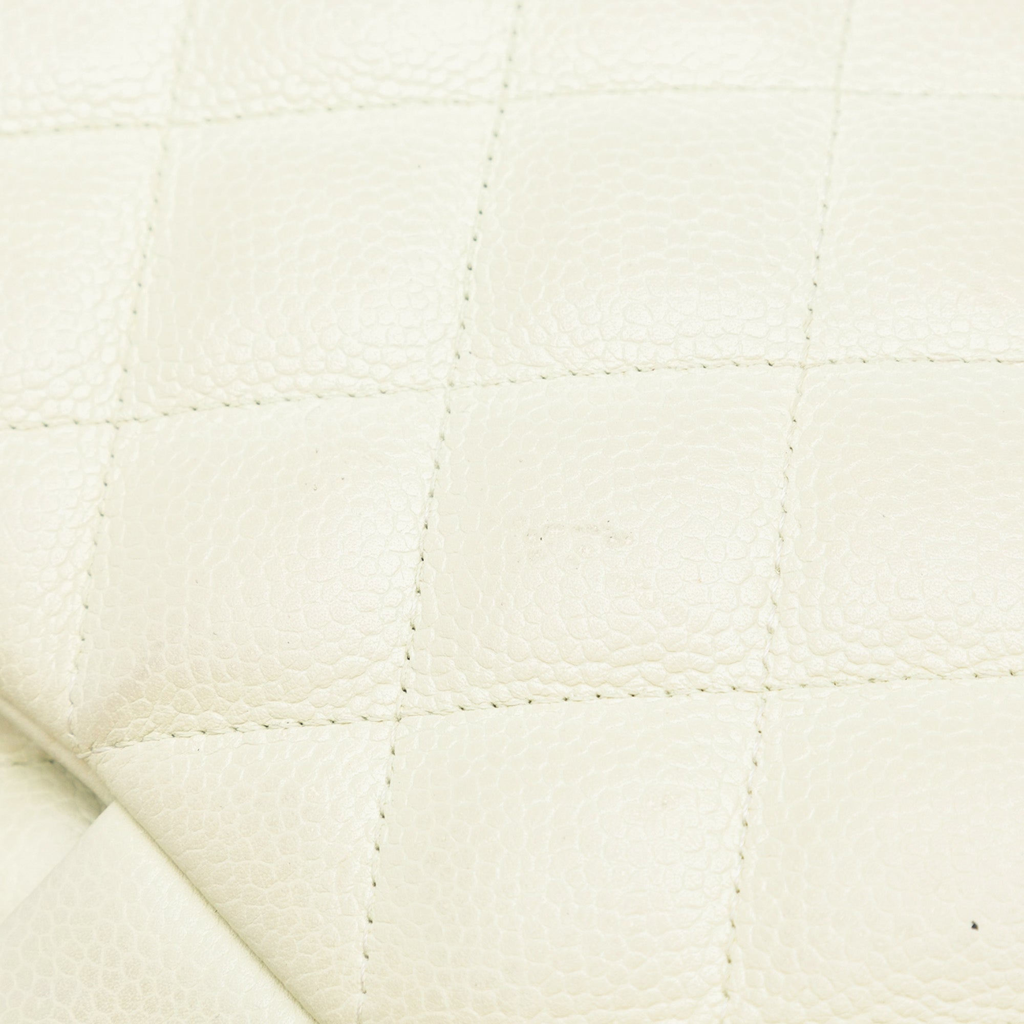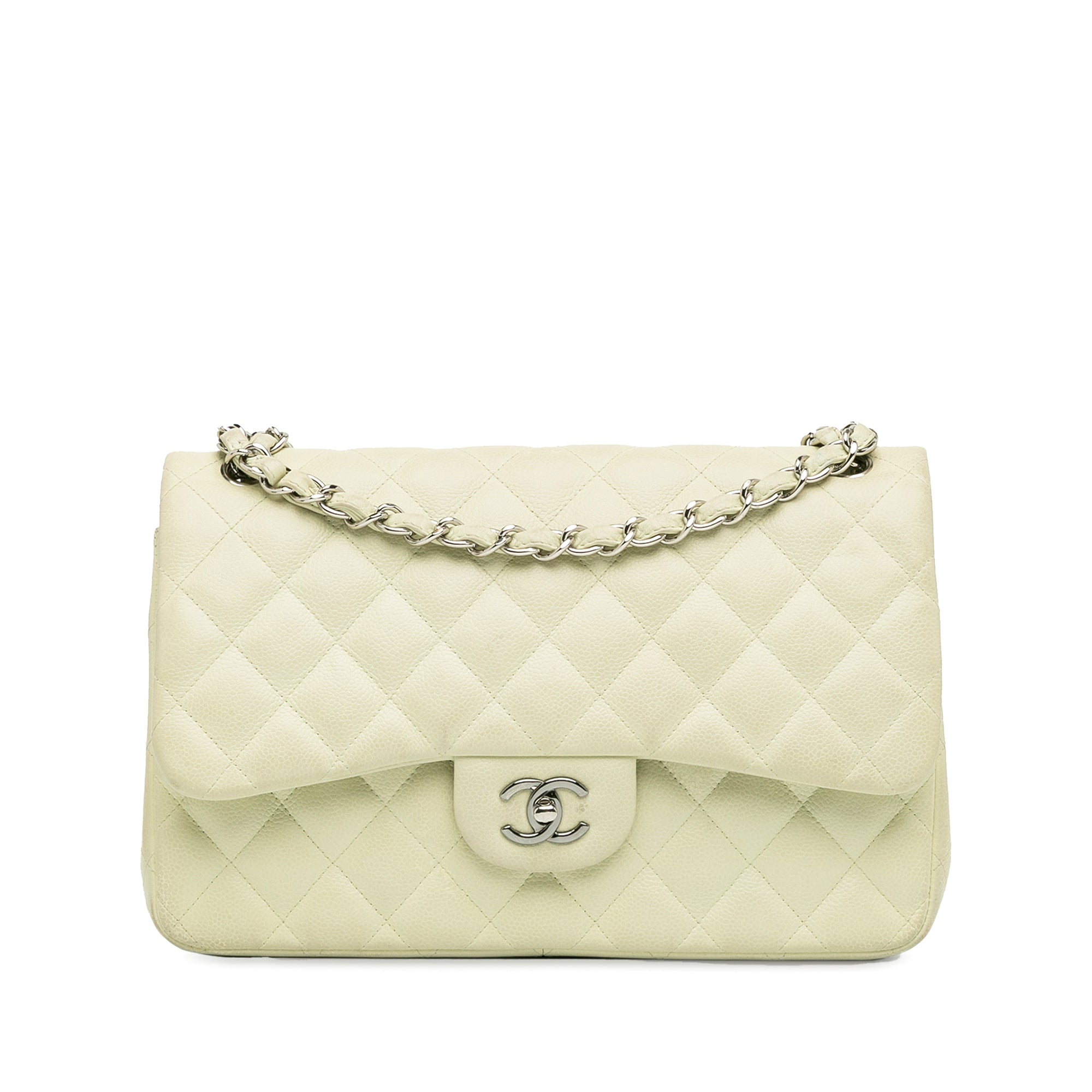 This shoulder bag features a quilted caviar leather body, leather woven chain straps, double top flaps with CC turn-lock closure, an exterior back slip pocket, and interior zip and slip pockets. Inclusion: authenticity card. Retail Price: 9600.00