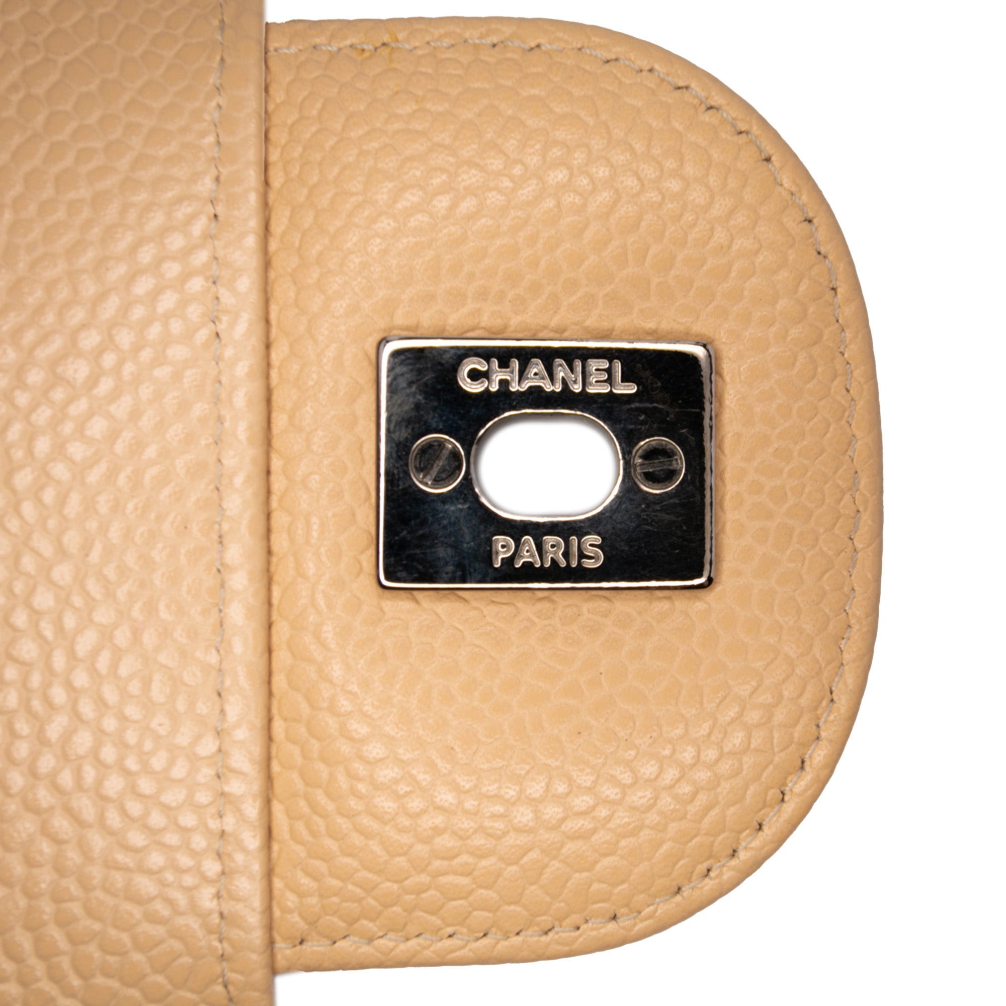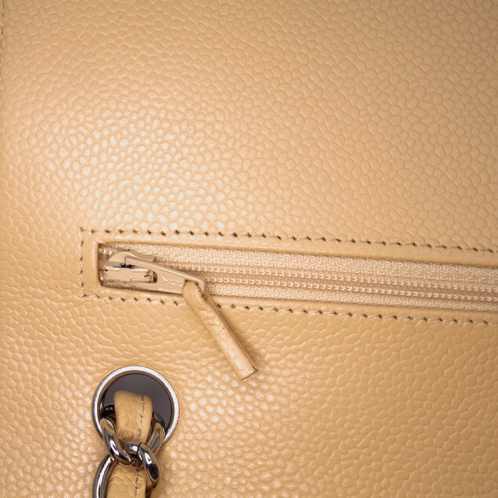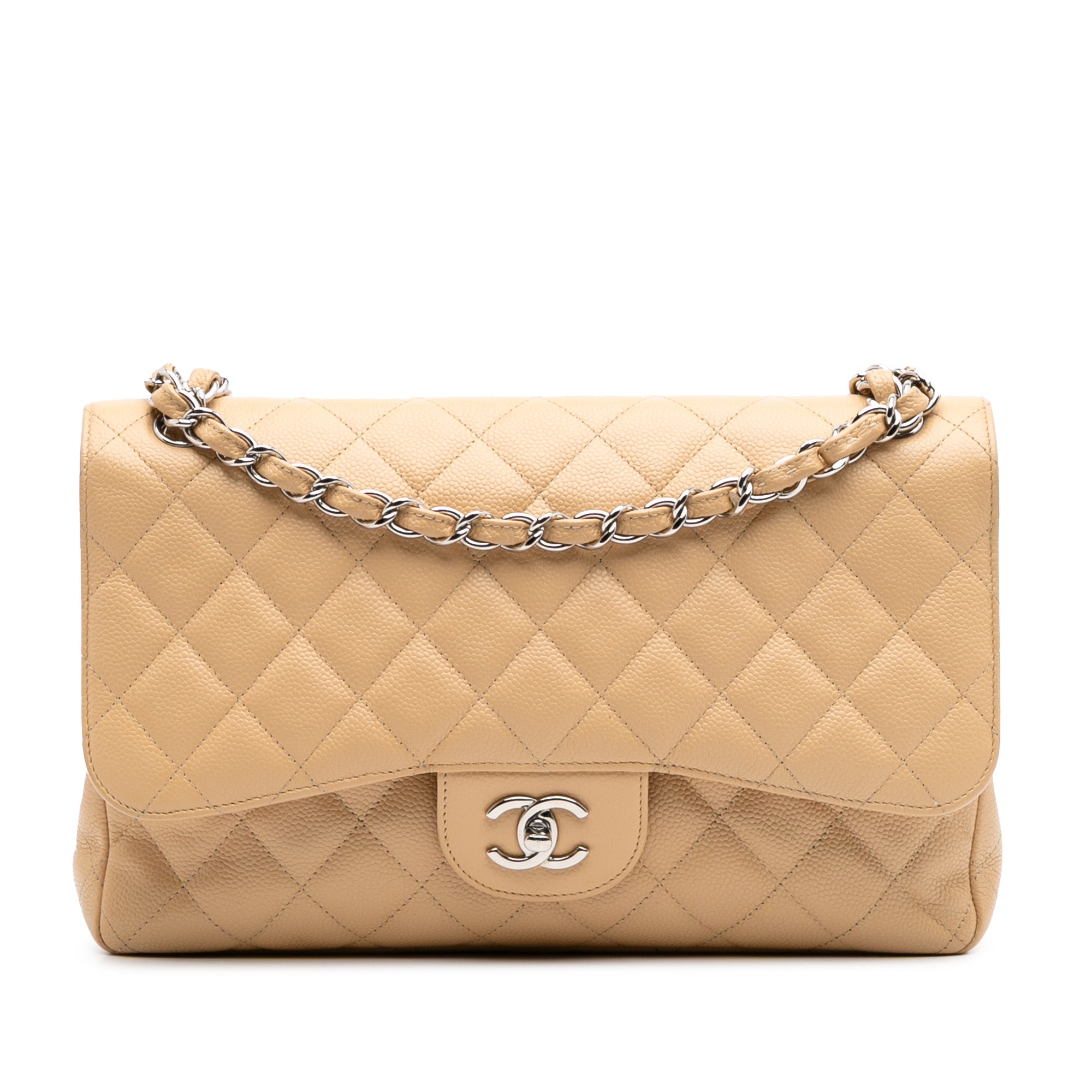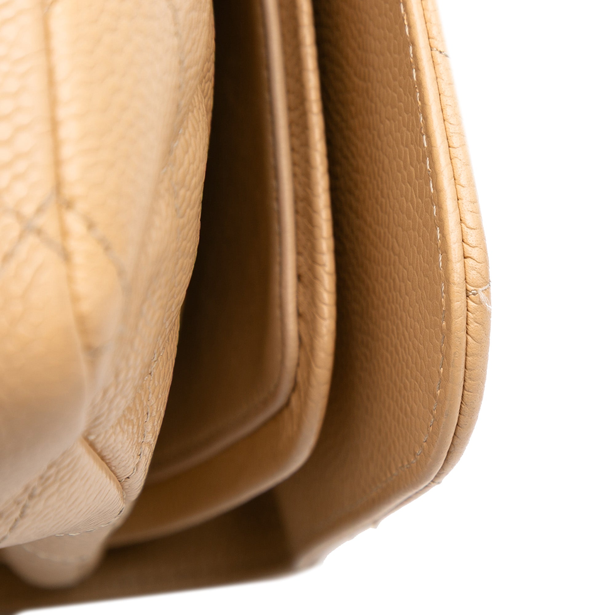 This shoulder bag features a quilted caviar leather body, leather woven chain straps, a double top flap with CC turn-lock closure, an exterior back slip pocket, and interior zip and slip pockets. Retail Price: 11000.00