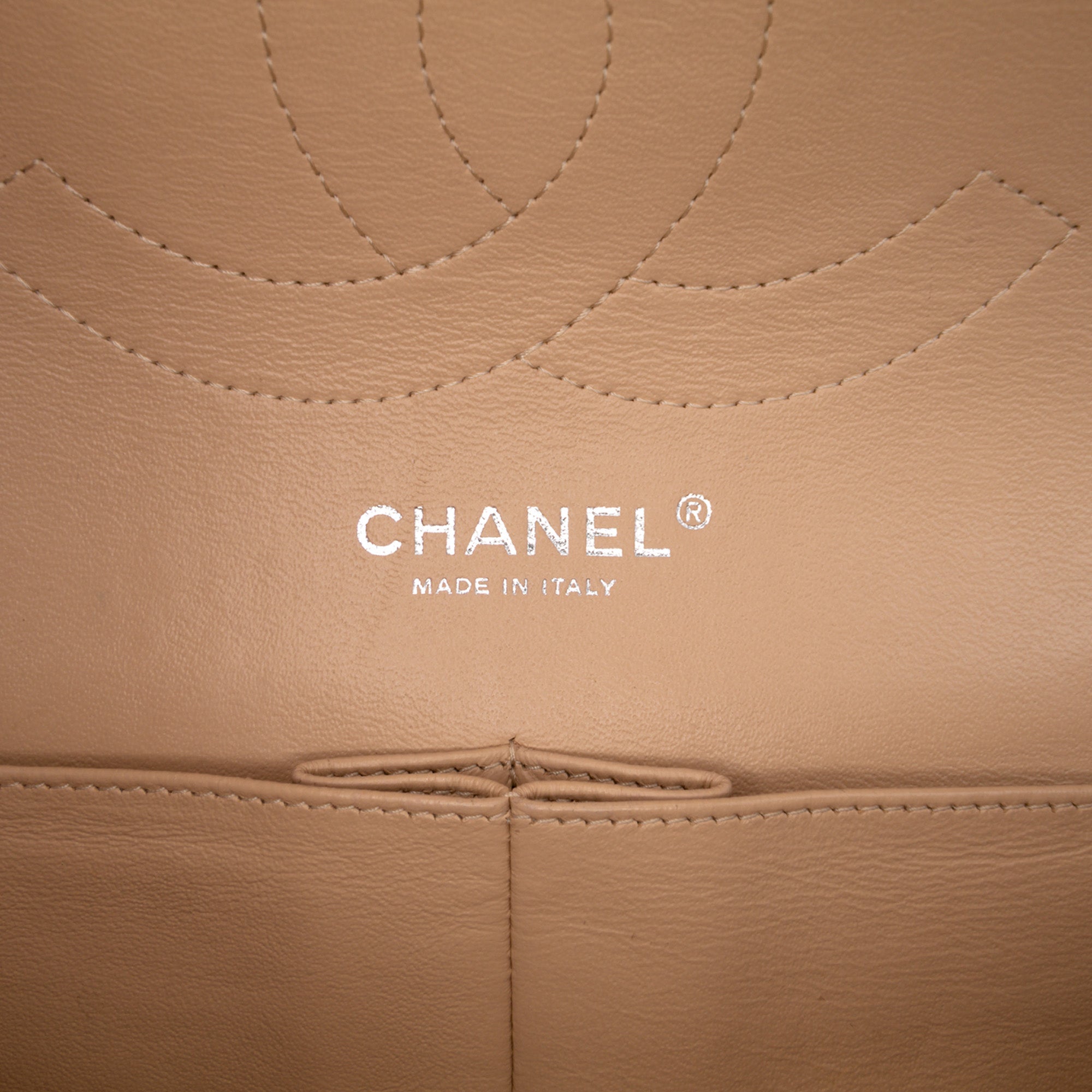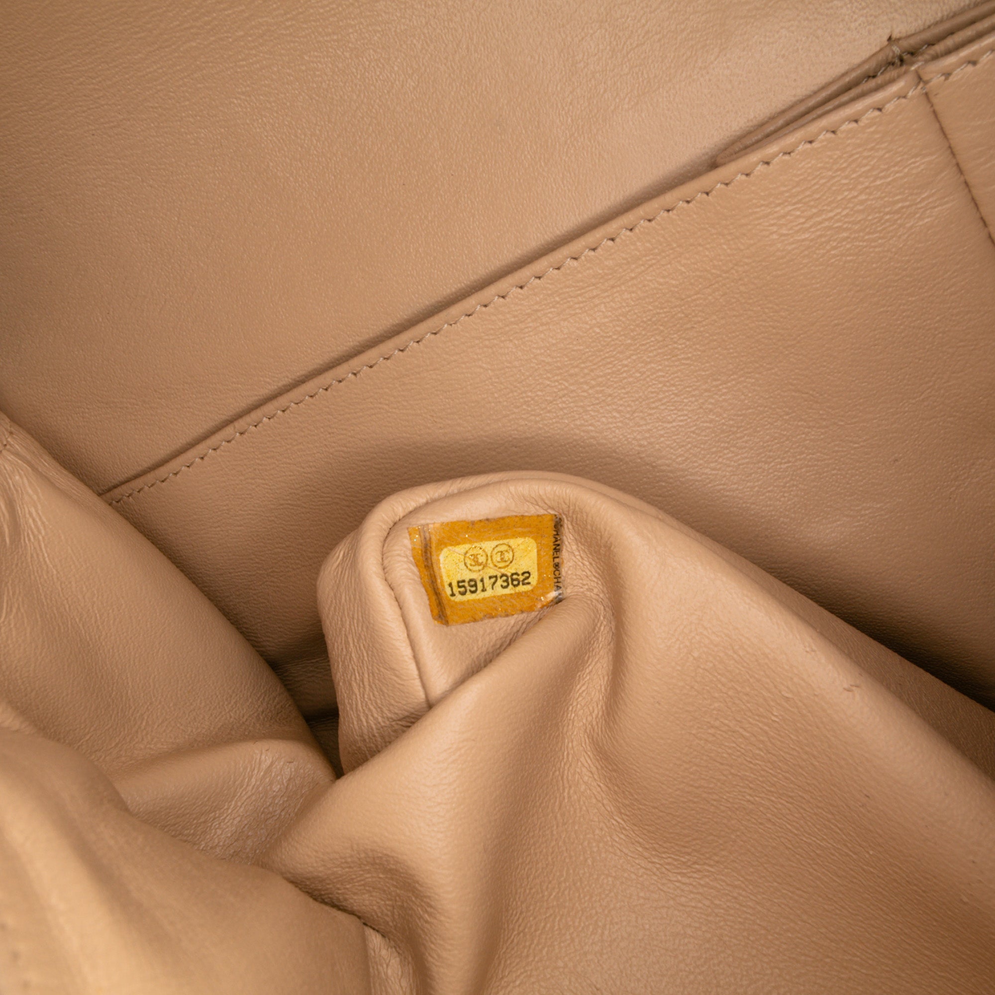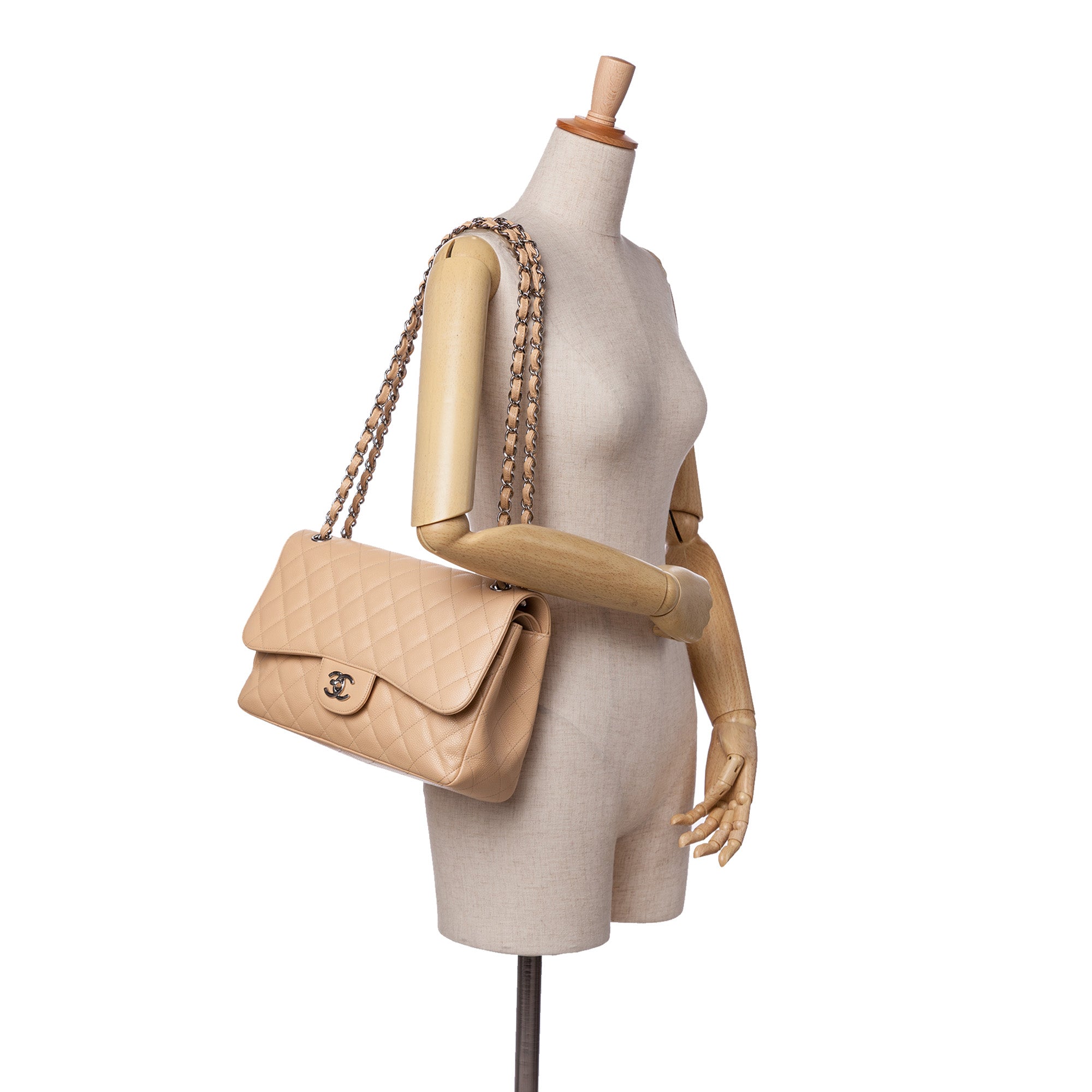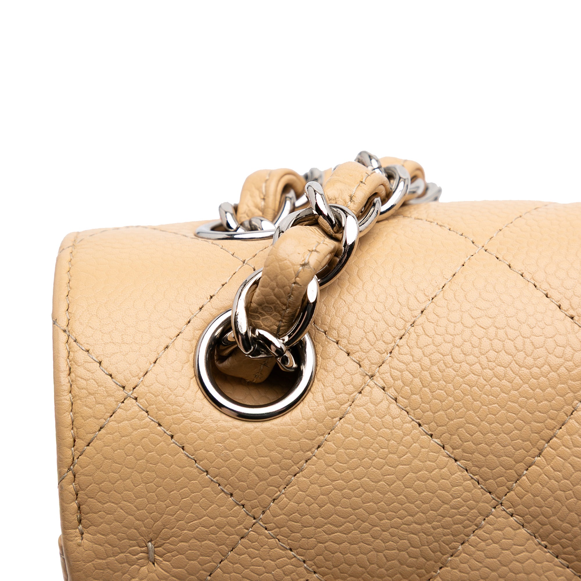 This shoulder bag features a quilted caviar leather body, leather woven chain straps, a double top flap with CC turn-lock closure, an exterior back slip pocket, and interior zip and slip pockets. Retail Price: 11000.00