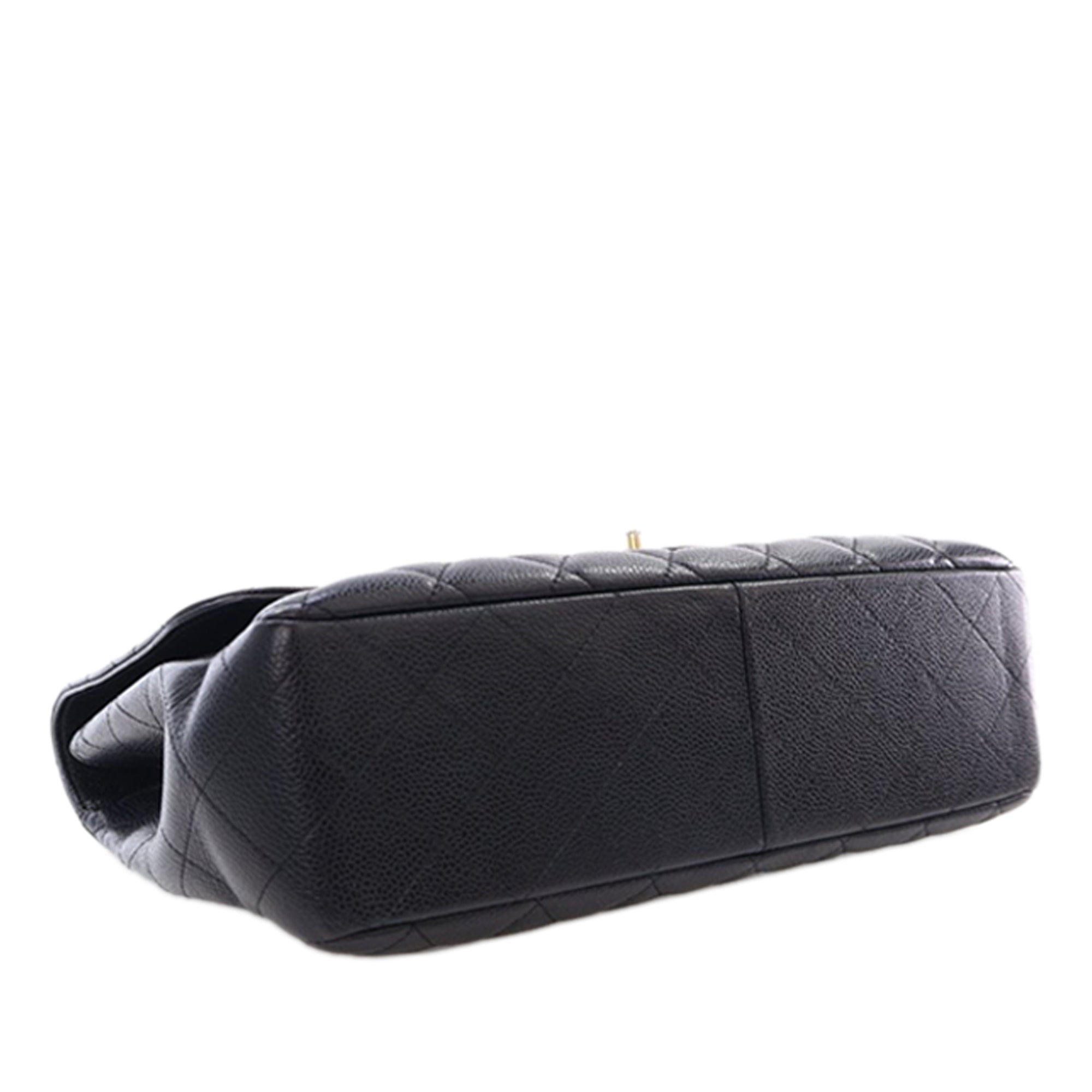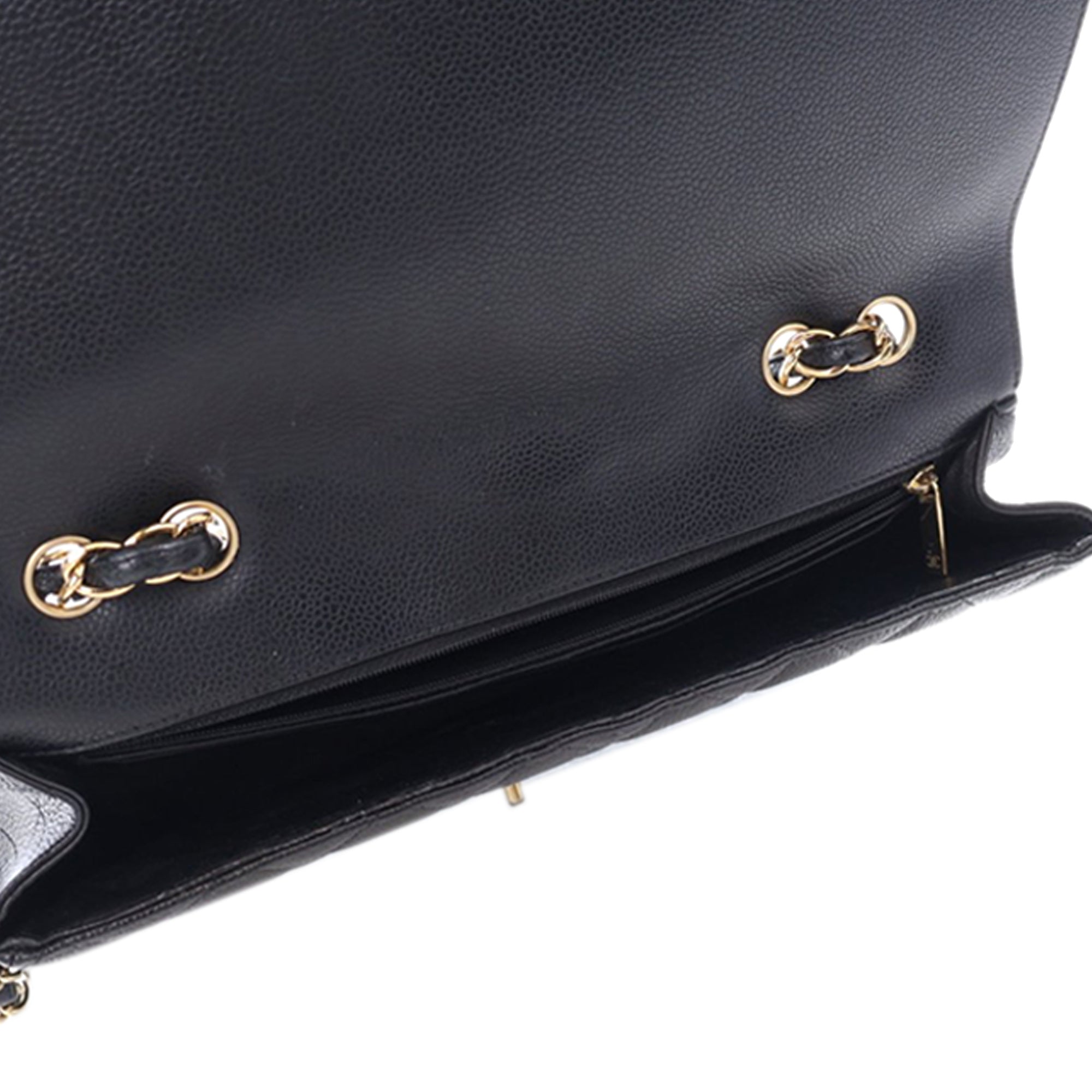 The Classic Jumbo Single Flap features a quilted caviar leather body, leather woven chain-link shoulder straps, a front flap with double Cs and twist lock closure, an exterior back slip pocket, and interior zip and slip pockets. Retail Price: 11700.00