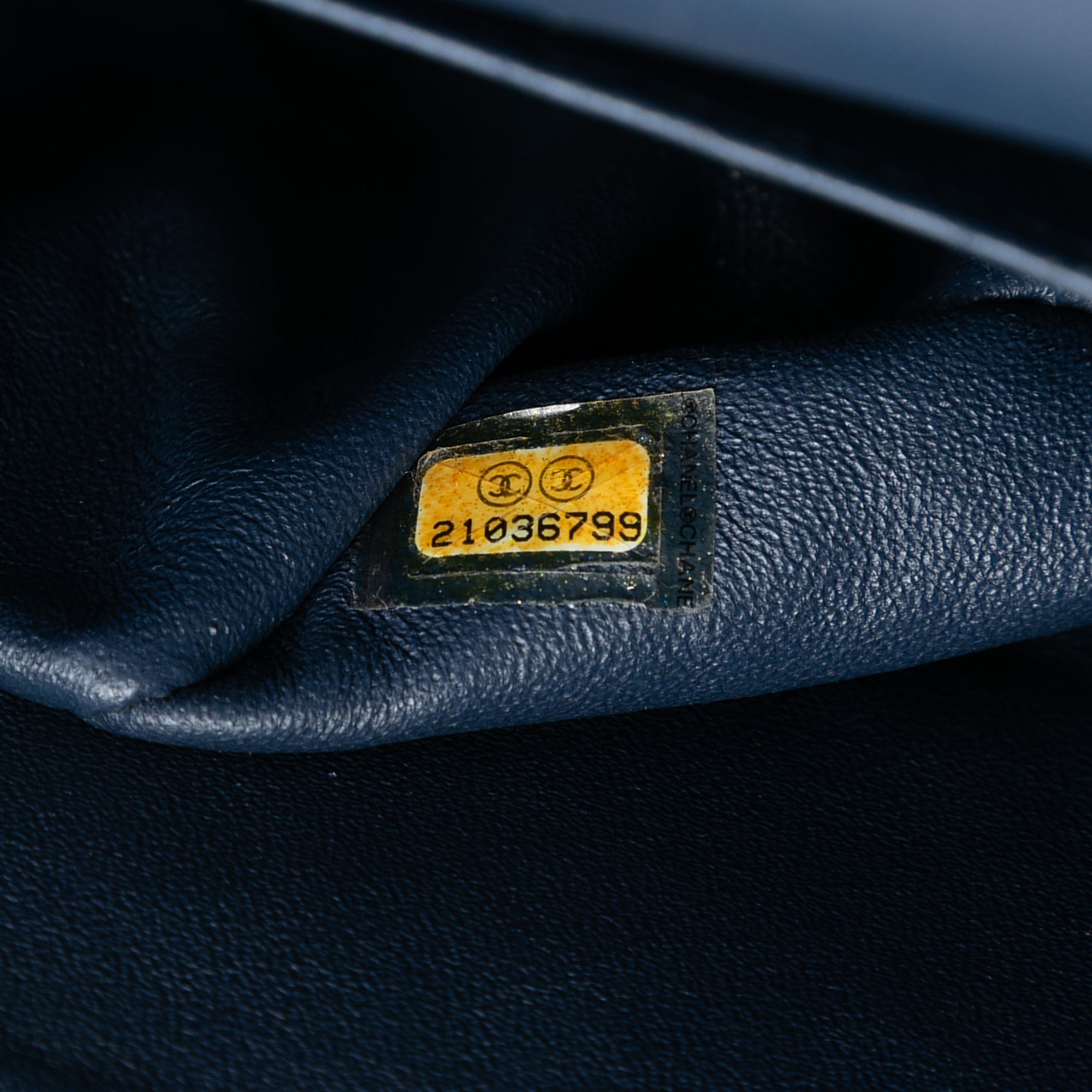 This shoulder bag features a quilted patent leather body, leather-woven chain link shoulder strap, a double front flap with interlocking Cs and twist lock closure, an exterior back slip pocket, and interior zip and slip pockets. Retail Price: 9500.00