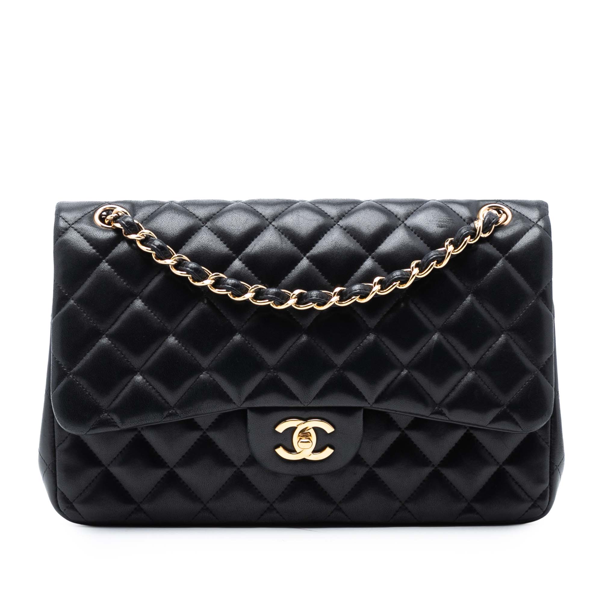 This shoulder bag features a quilted lambskin leather body, leather woven chain straps, double front flaps with CC turn-lock closure, an exterior back slip pocket, and interior zip and slip pockets. Retail Price: 11218.00
