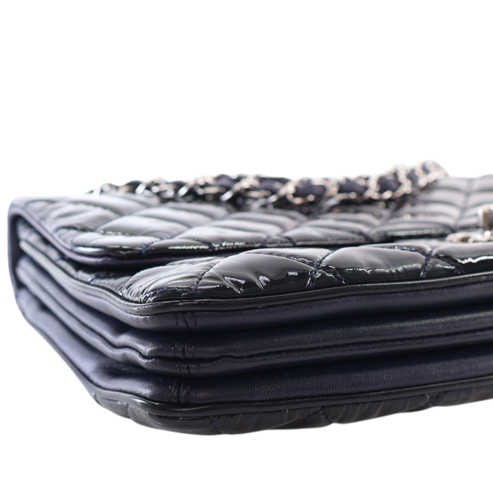 This shoulder bag features a quilted patent leather body, silver-tone leather woven chain link straps, a front flap with CC turn lock closure, an exterior back slip pocket, three interior open compartments, and interior zip and slip pockets. Retail Price: 10690.00