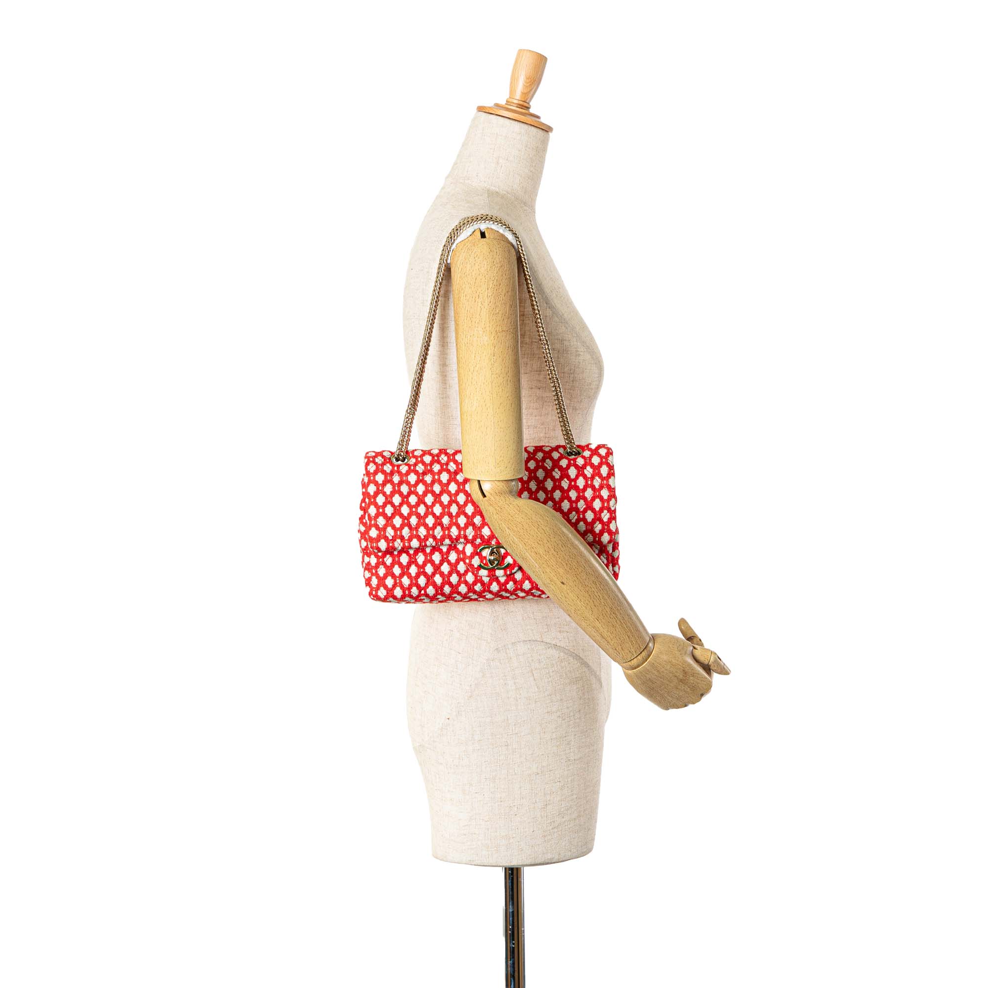 This flap bag features a quilted tweed body, chain link straps, a front flap with interlocking Cs and a twist lock closure, an exterior back slip pocket, and interior slip pockets. Retail Price: 3790.00