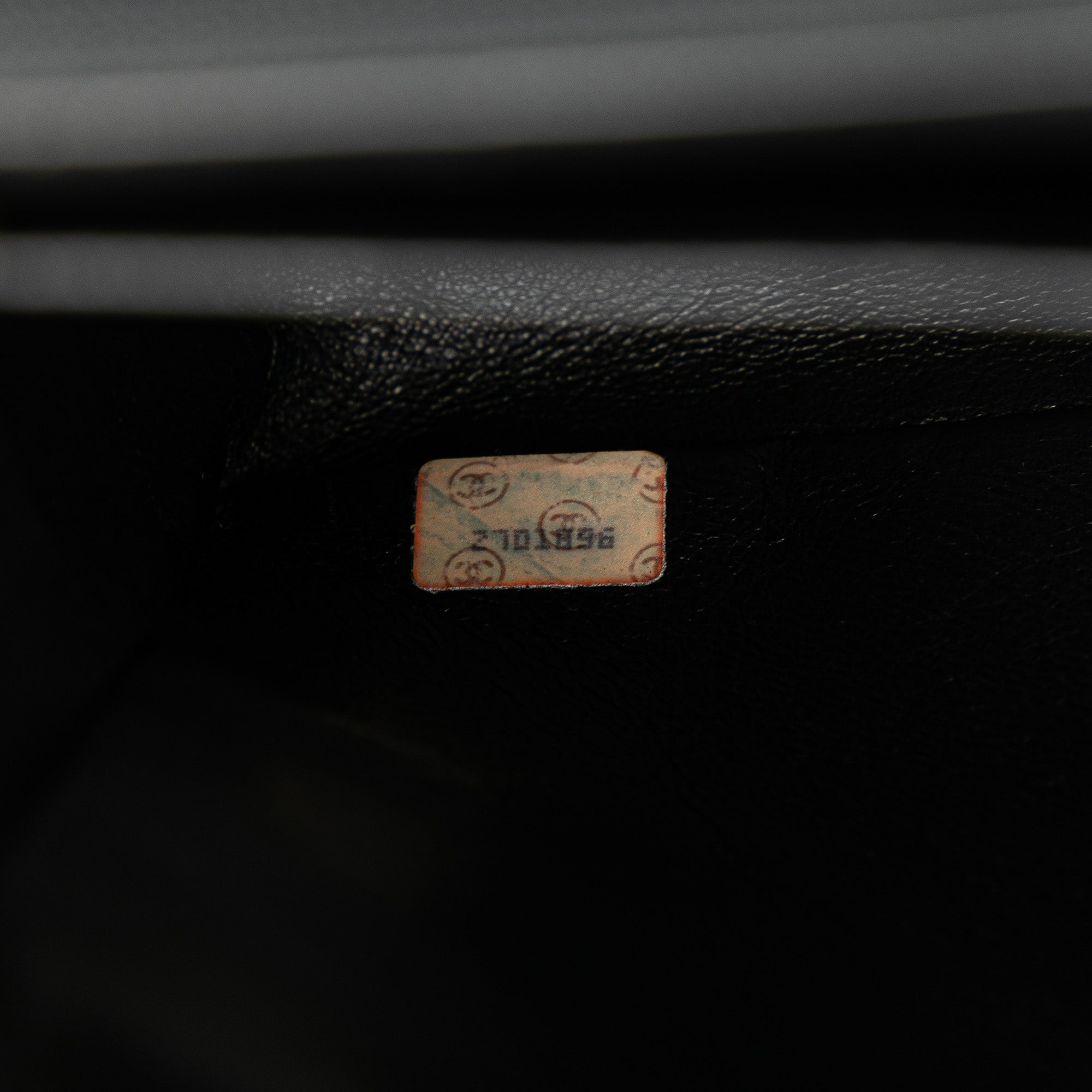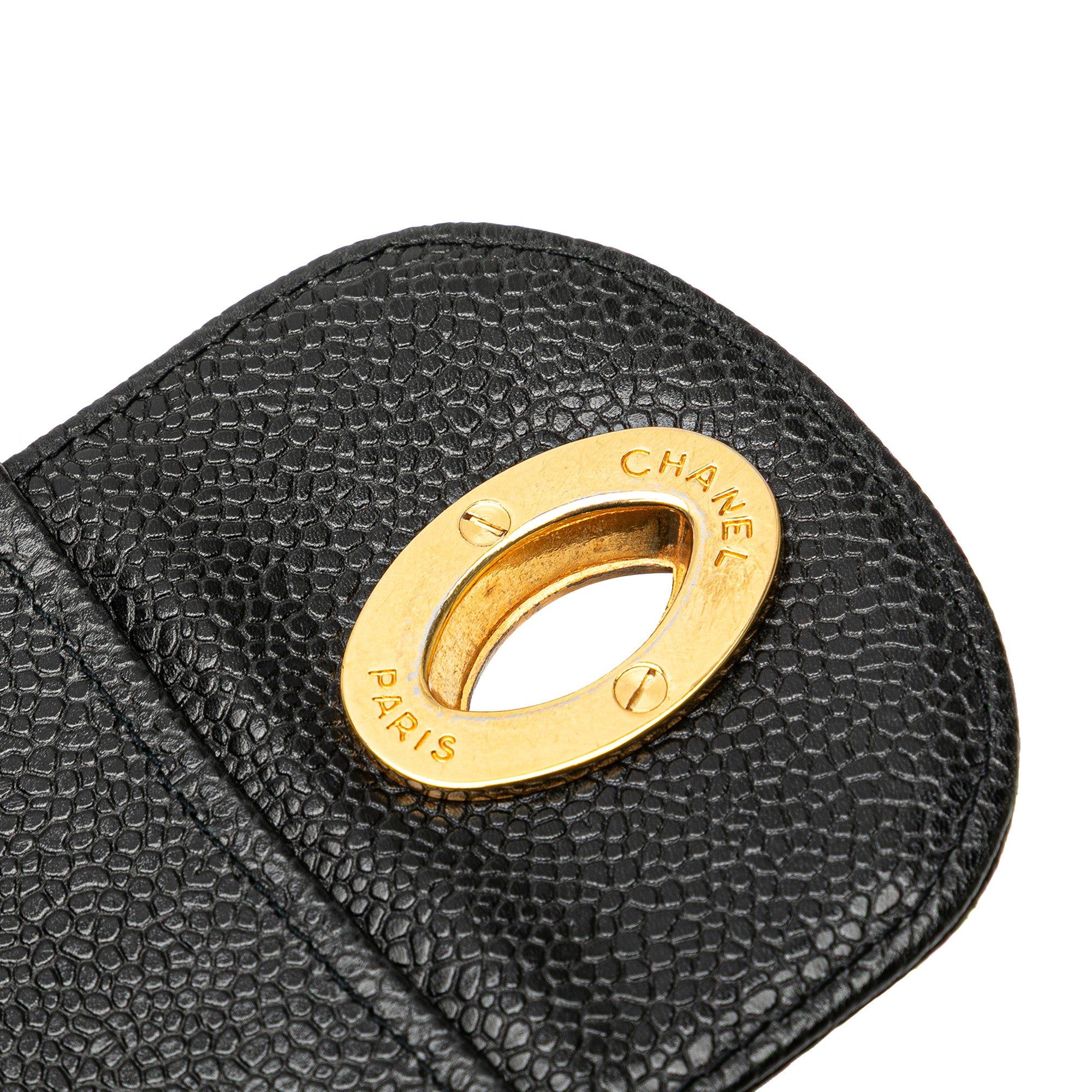 This shoulder bag features a caviar leather body, leather woven chain shoulder straps, a front flap with double Cs and twist lock closure, an exterior back slip pocket, and interior zip and slip pockets. Retail Price: 6650.00