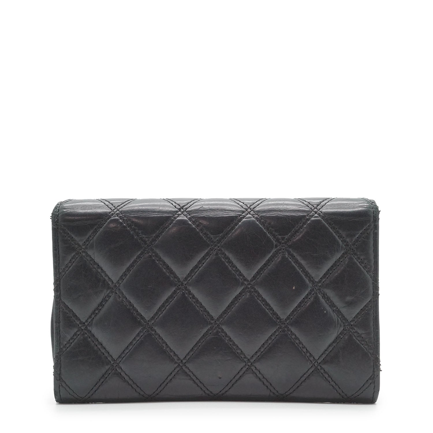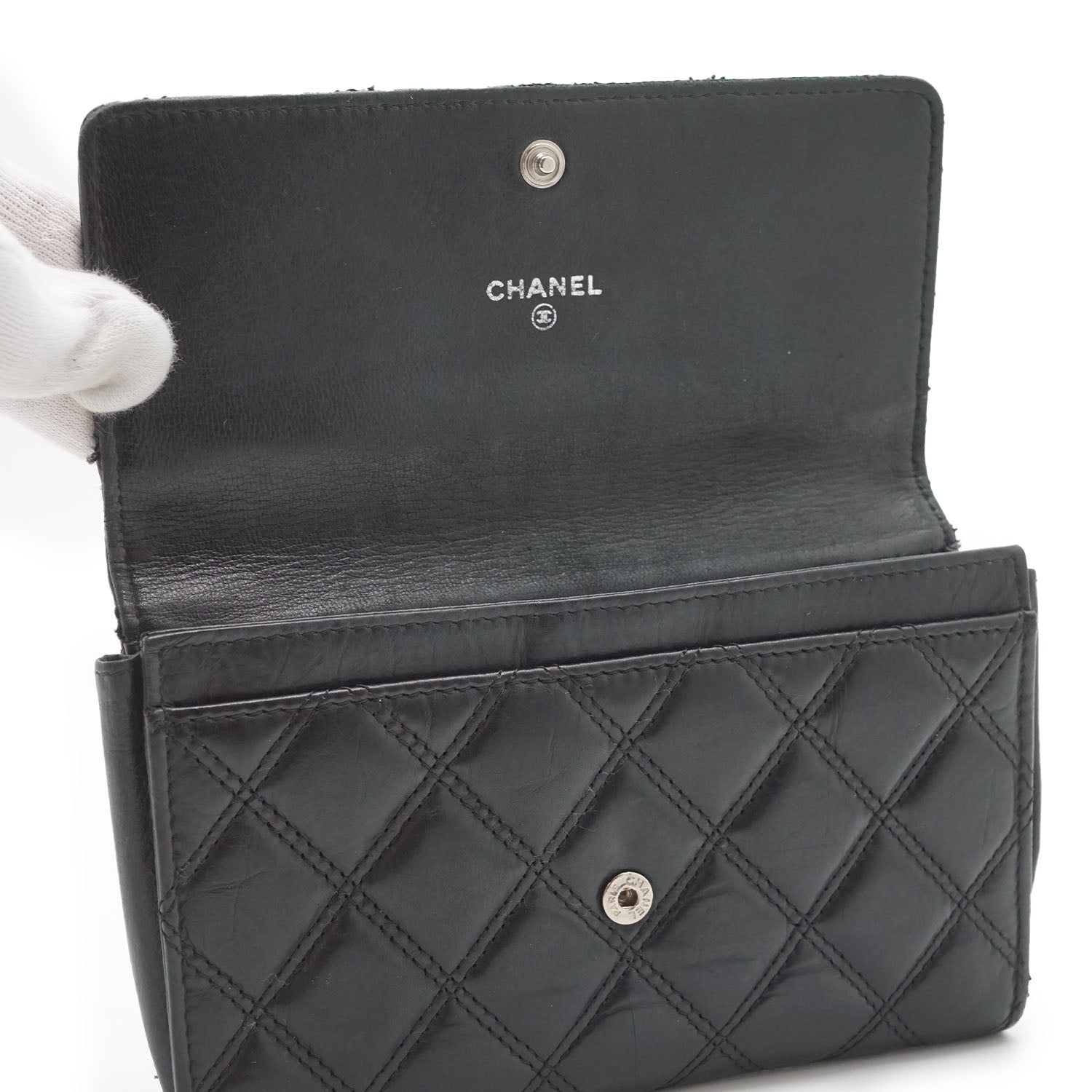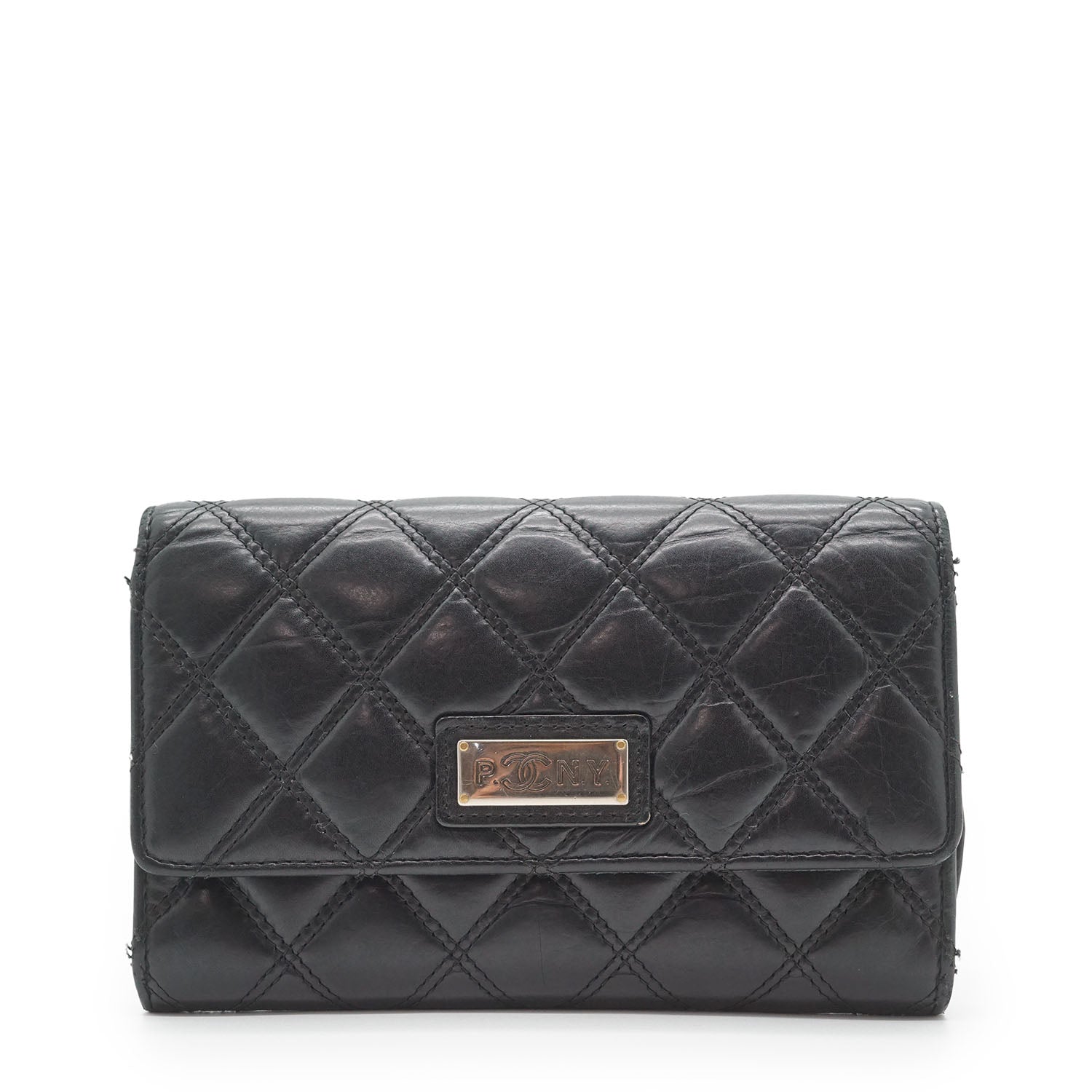Lambskin Matelasse 2006 Paris NY Bi-fold Wallet Black LeatherDepth: 2cmHeight: 10.5cmWidth: 16cmOutside Rank: BCInside Rank: BDiscoloration: Some tarnish on the front logo plate, slight discoloration throughout the inside fabricScratch: Some scratches overall, corner rubPeeling: Some leather creasing overallWorn: In general, with a few loose stitches all along the edgesOdor: Slight storage smellMissing: The zipper pull of the inside pocket is missing Serial code: 10846785SKU: 7060083