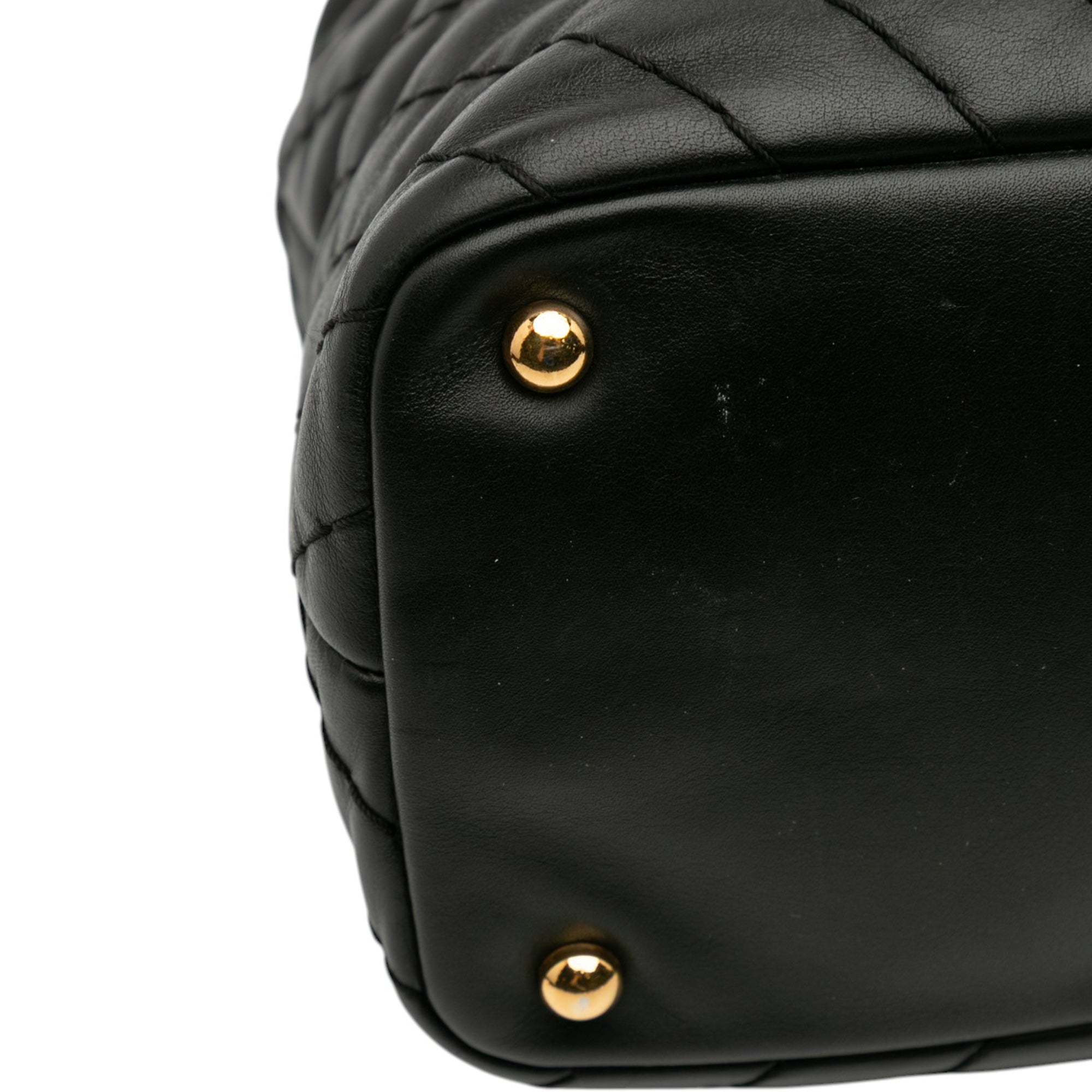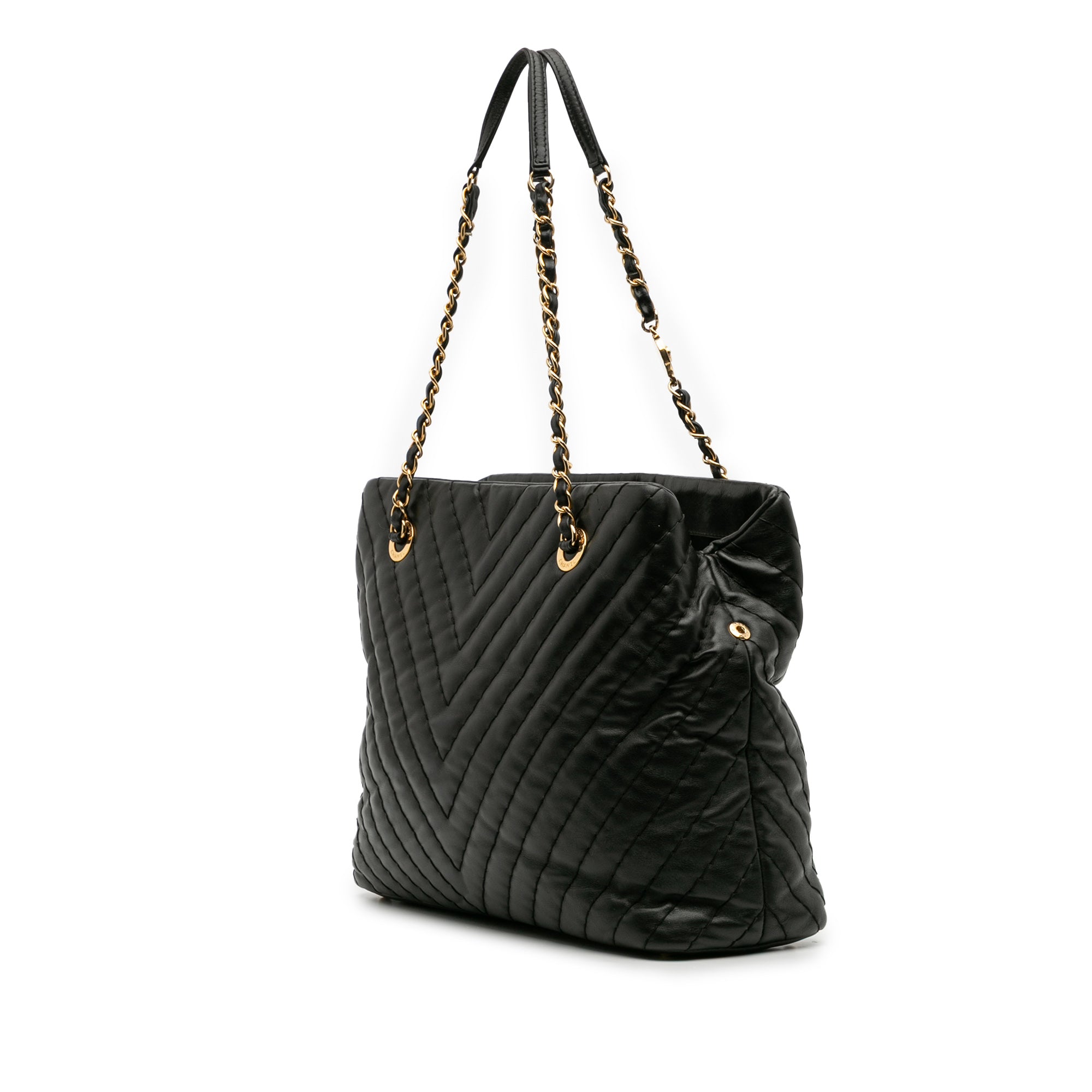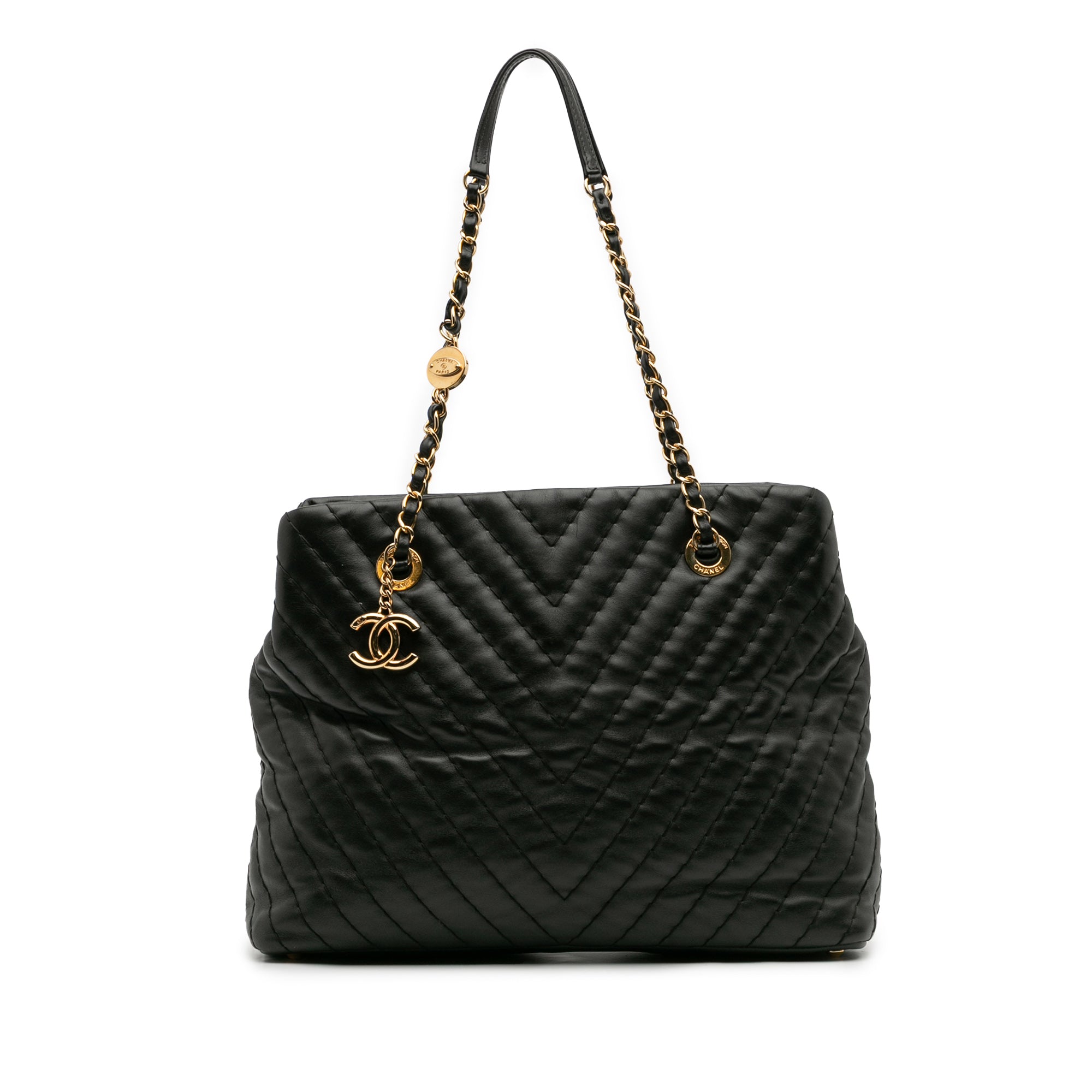 This tote bag features a quilted leather body, chain straps with leather guard, an open top, an interior zip compartment, and interior zip and slip pockets. Retail Price: 2900.00
