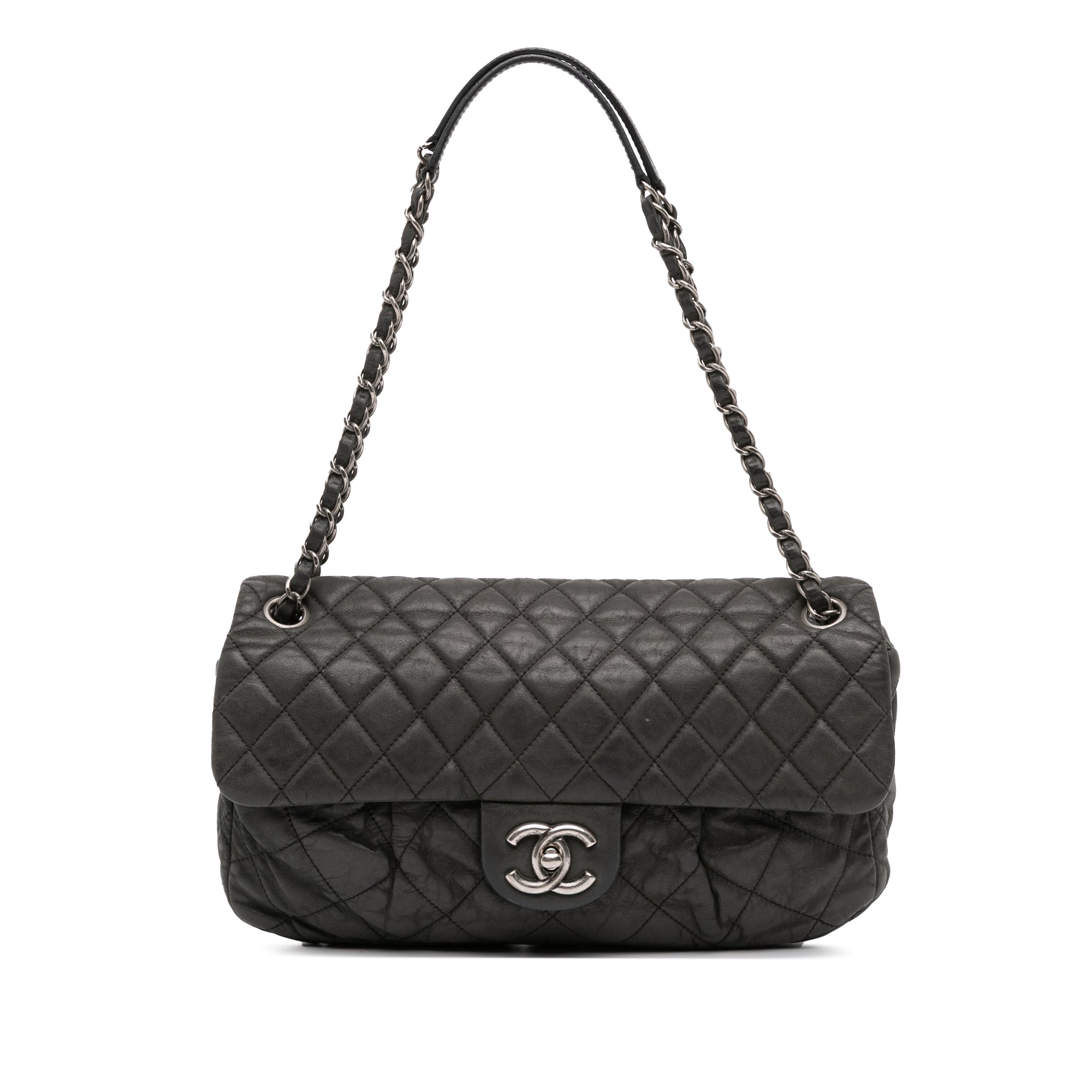 This shoulder bag features a quilted calfskin body, a leather woven chain strap with flat leather guard, a front flap with a CC turn lock closure, and interior zip and slip pockets. Retail Price: 3200.00