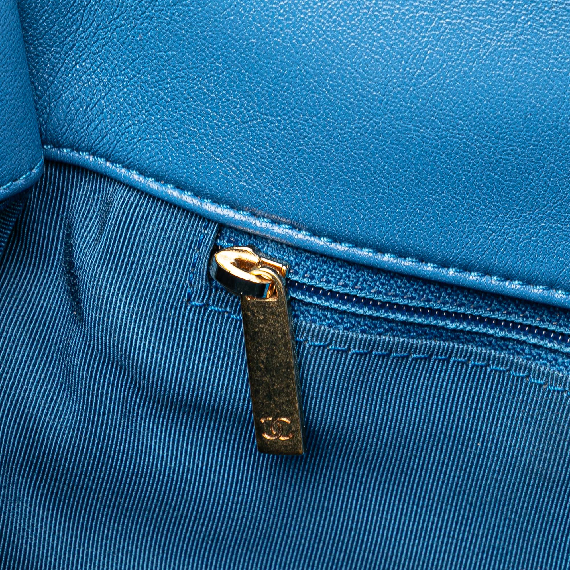 The Large 19 Flap bag features a quilted lambskin leather body, a gold-tone chain handle, a woven leather chain shoulder strap, a flap with a CC twist lock closure, an exterior back slip pocket, and an interior zip pocket. Inclusion: box, authenticity card. Retail Price: 8500.00
