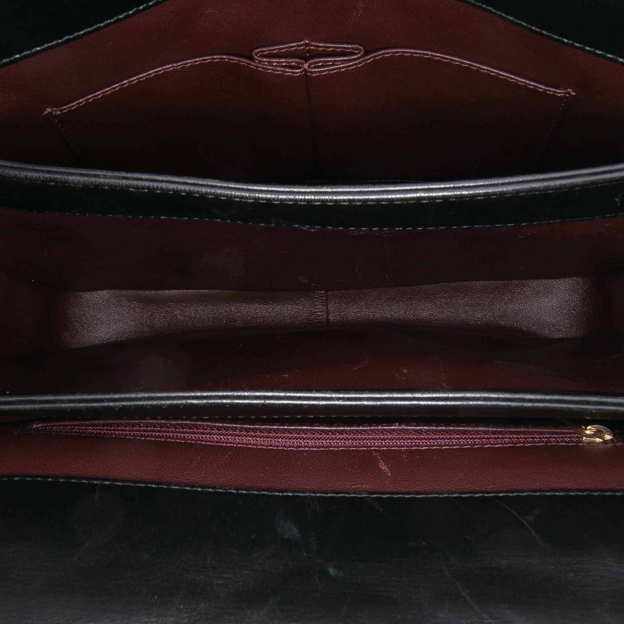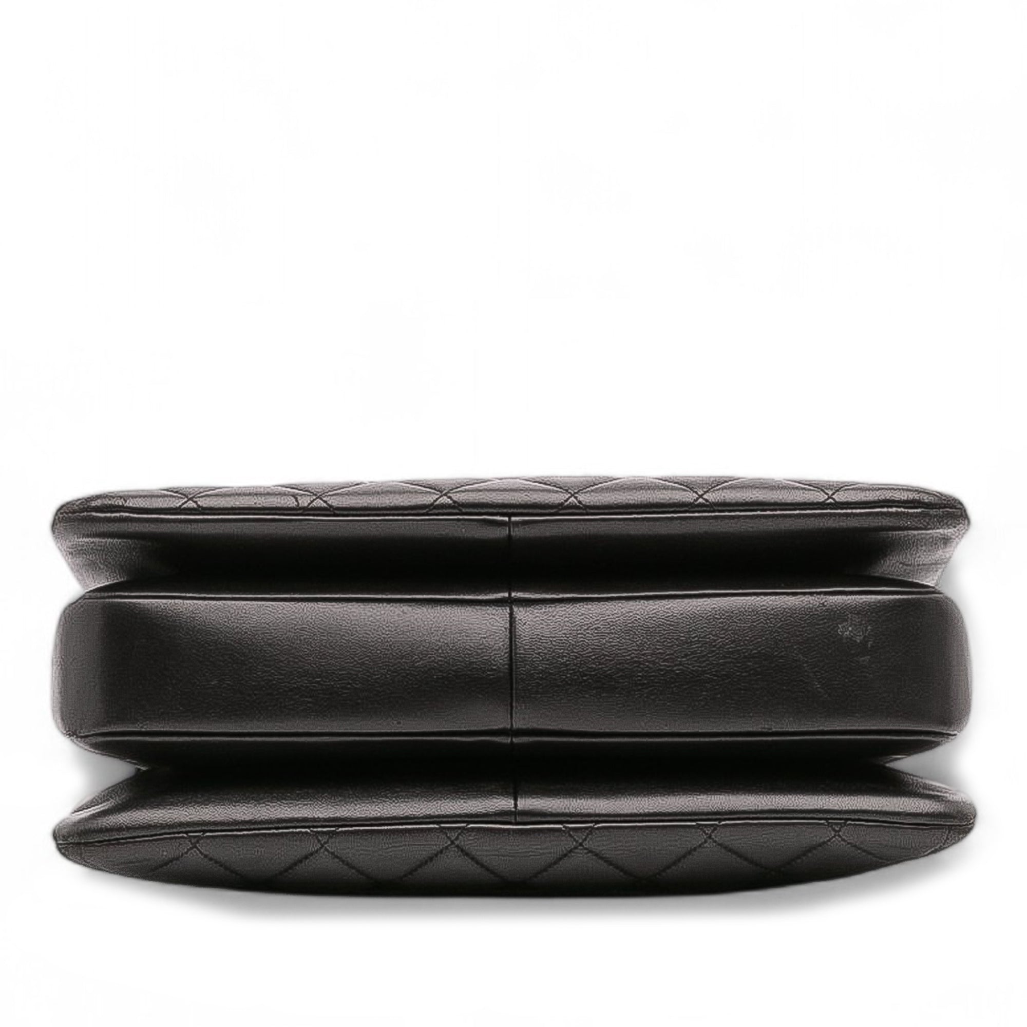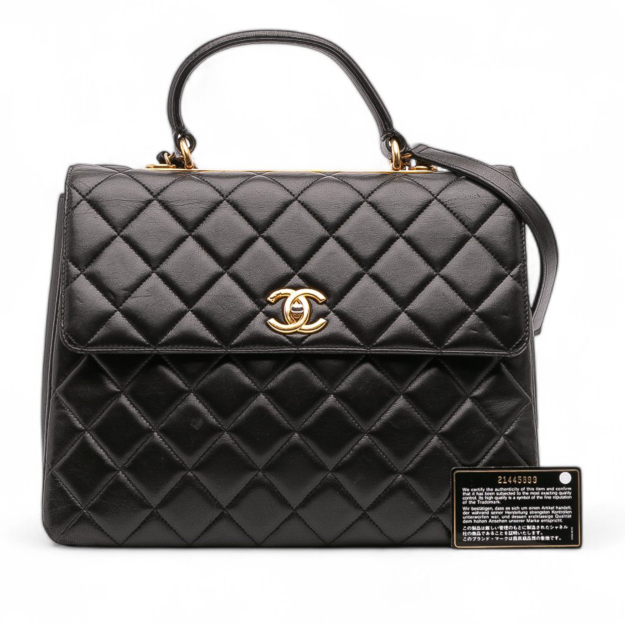 This satchel features a quilted lambskin leather body, a flat leather top handle, a detachable slat leather strap, a front flap with twist lock closure, three interior compartments, and interior zip and slip pockets. Inclusion: authenticity card. Retail Price: 7000.00