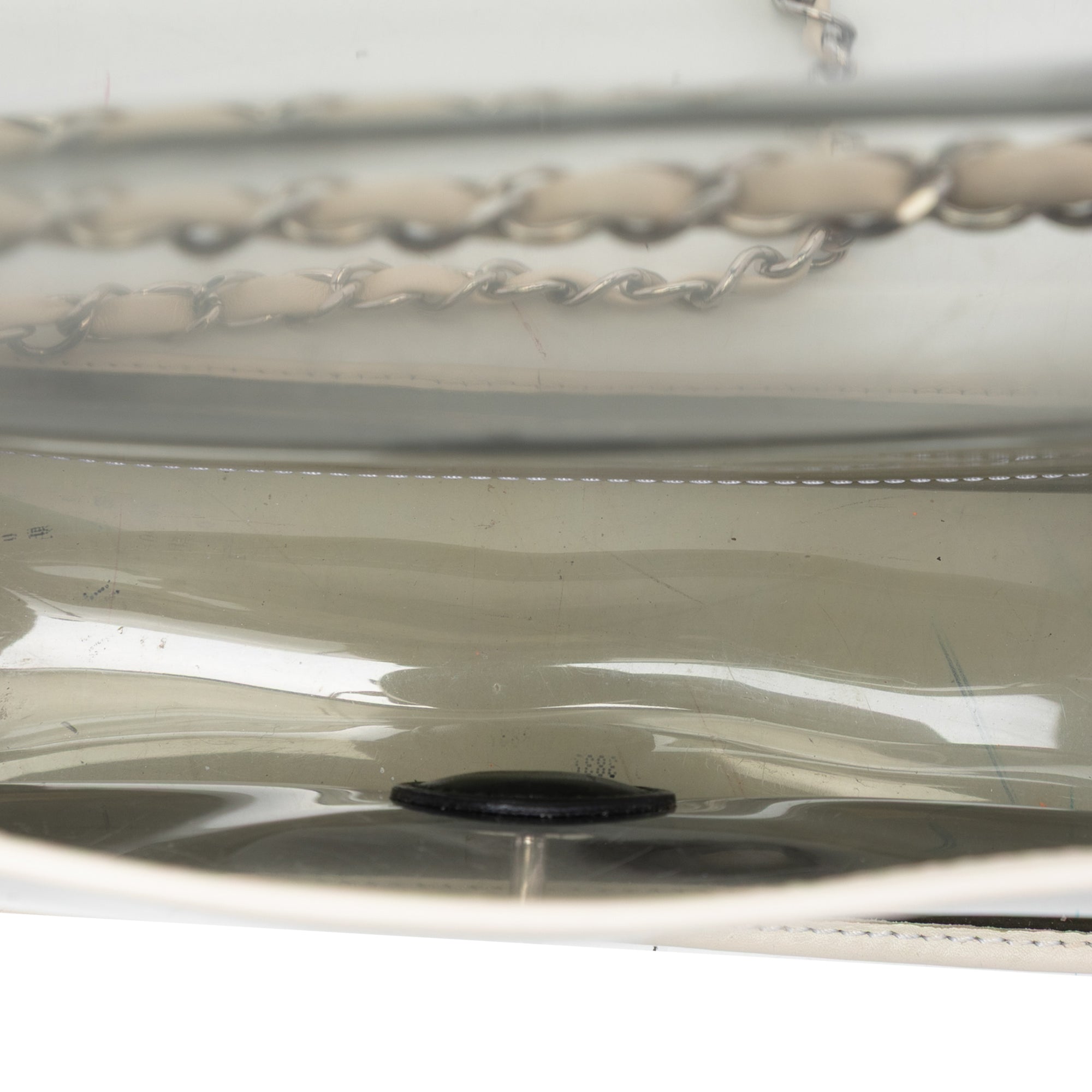 The Naked Flap bag features a PVC body with leather trim, leather woven chain link shoulder straps, a front flap with twist lock closure, and an exterior back slip pocket. Retail Price: 3000.00