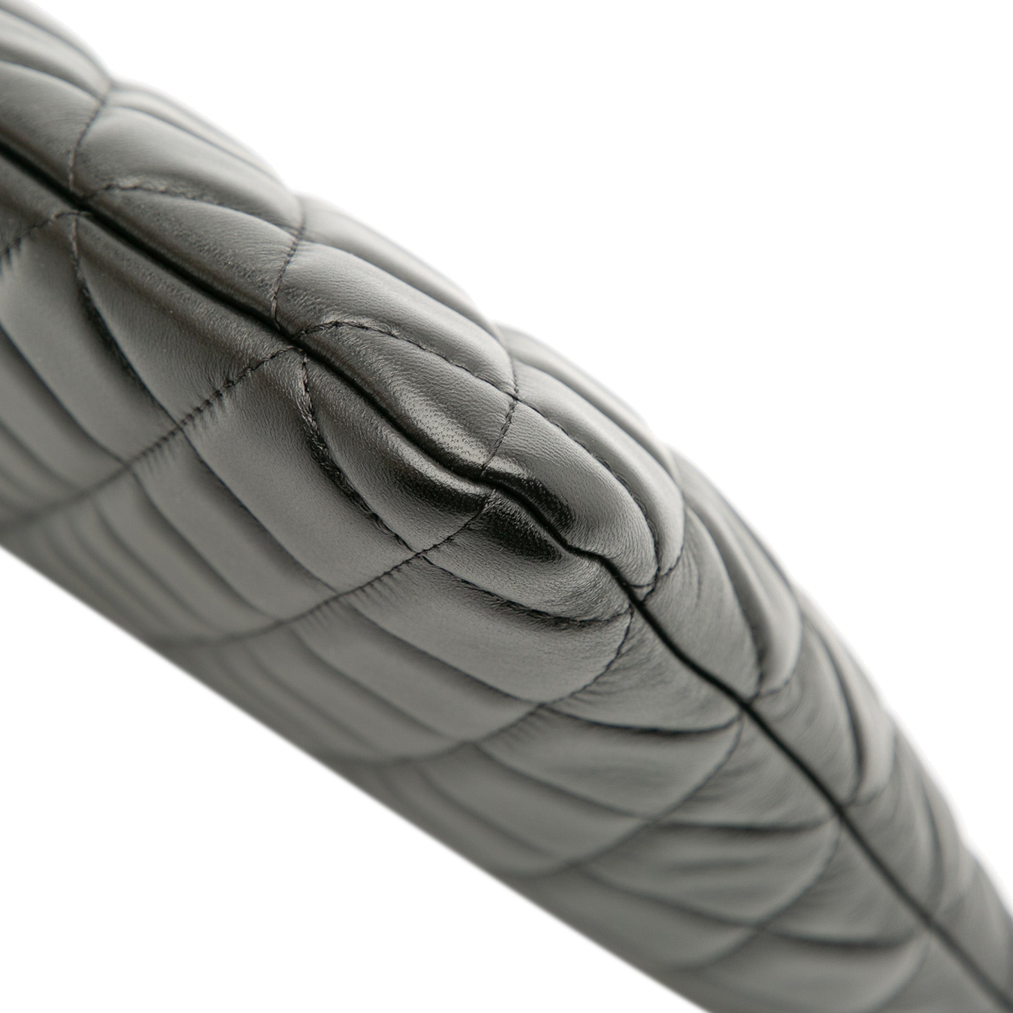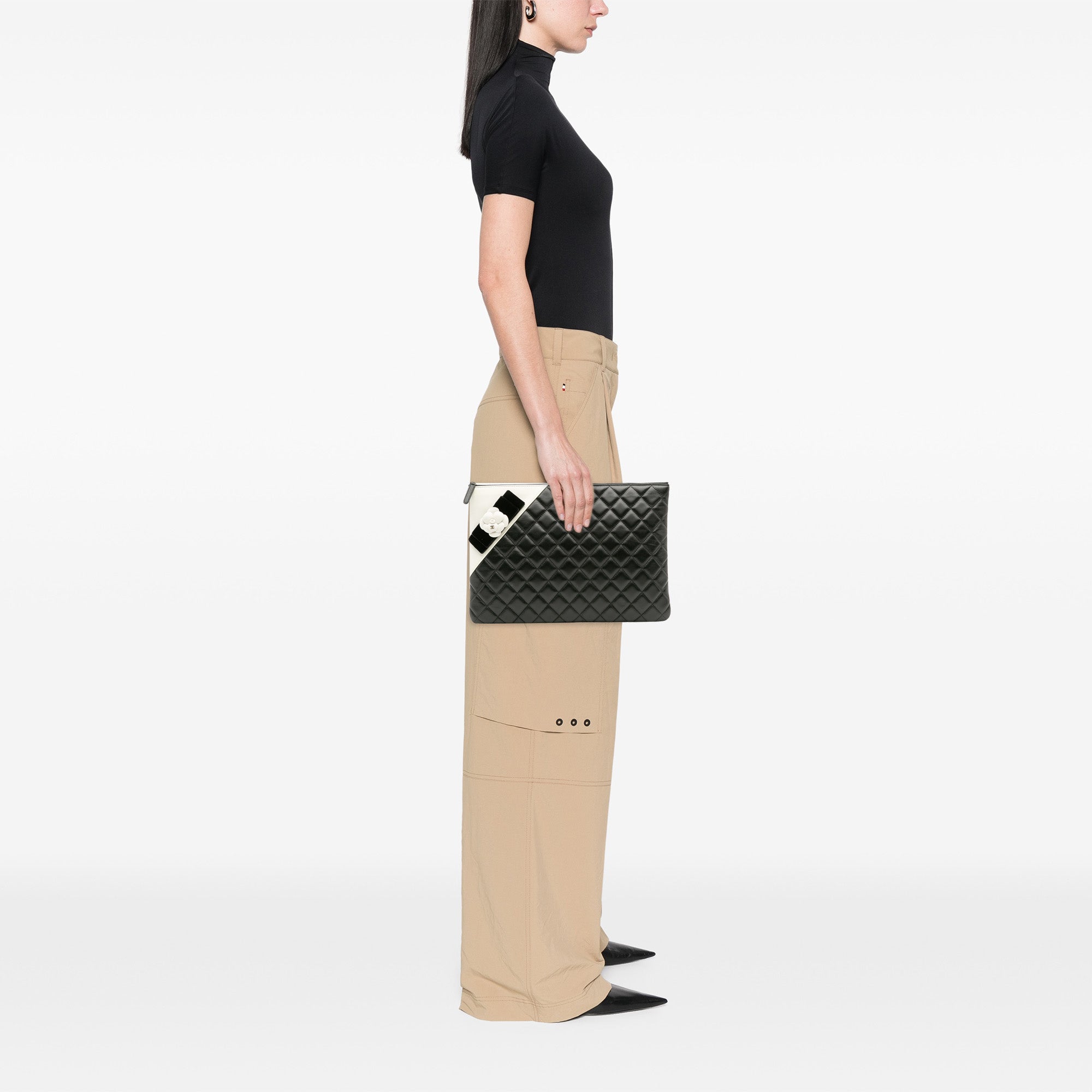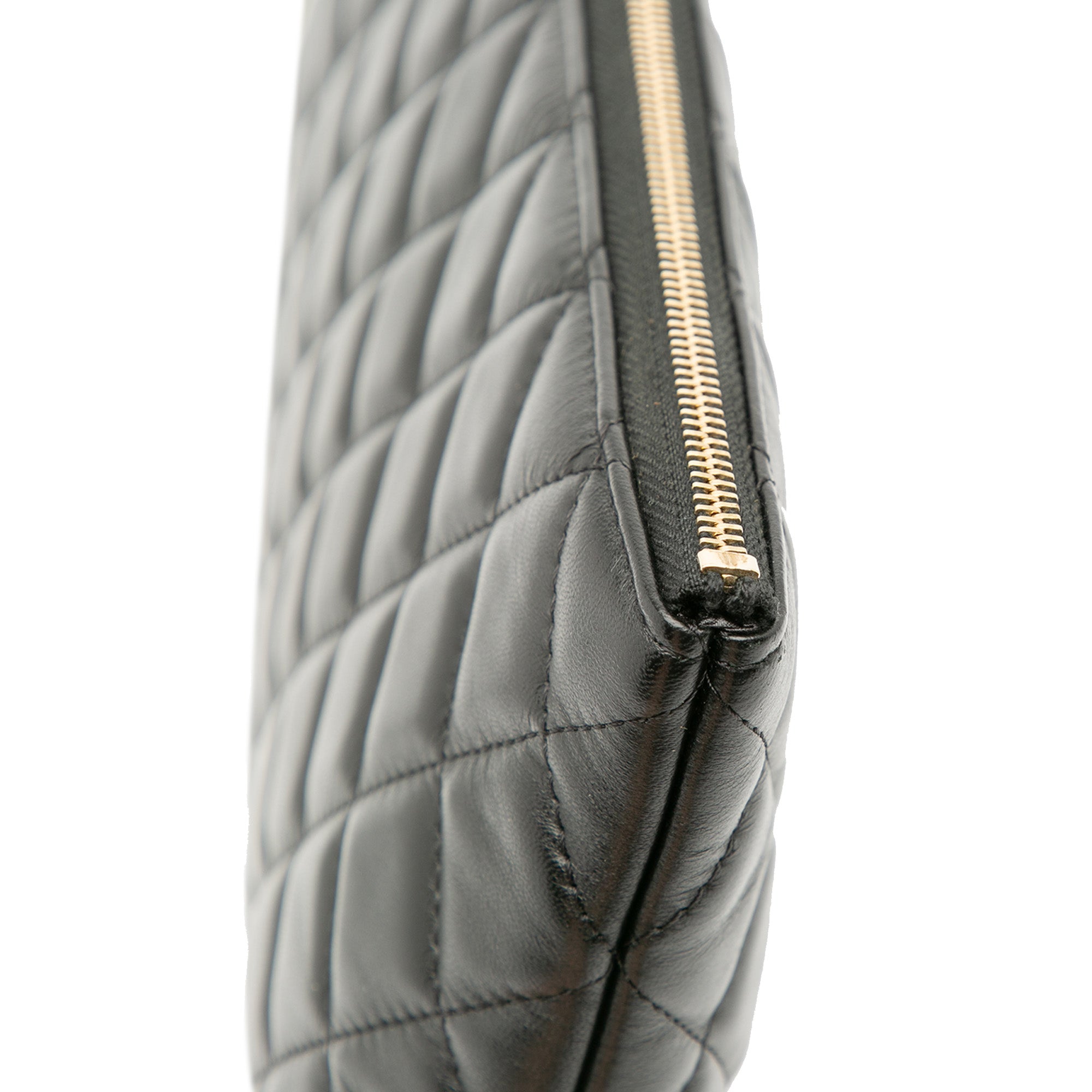 This clutch bag features a quilted lambskin leather body, a top zip closure, an exterior back slip pocket, and an interior zip pocket. Inclusion: authenticity card. Retail Price: 1670.00
