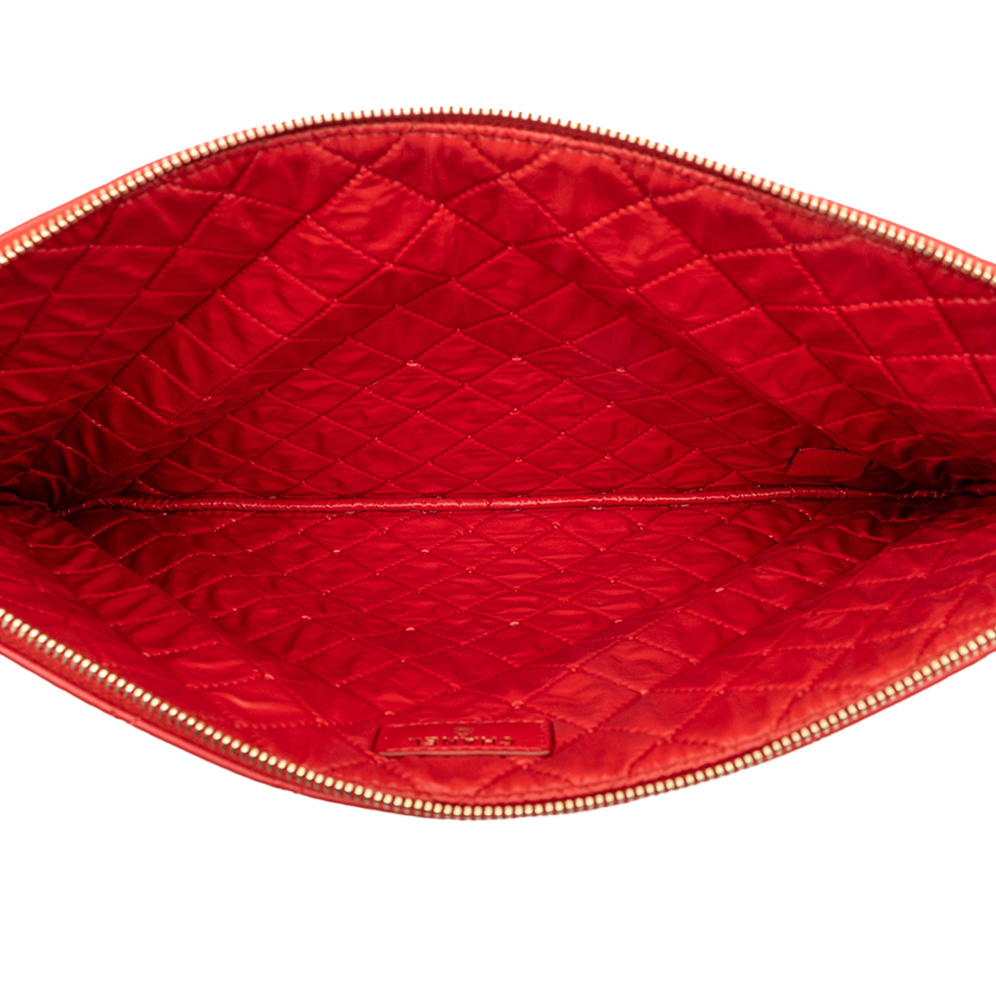 This clutch bag features a quilted lambskin leather body, and a top zip closure. Retail Price: 1700.00