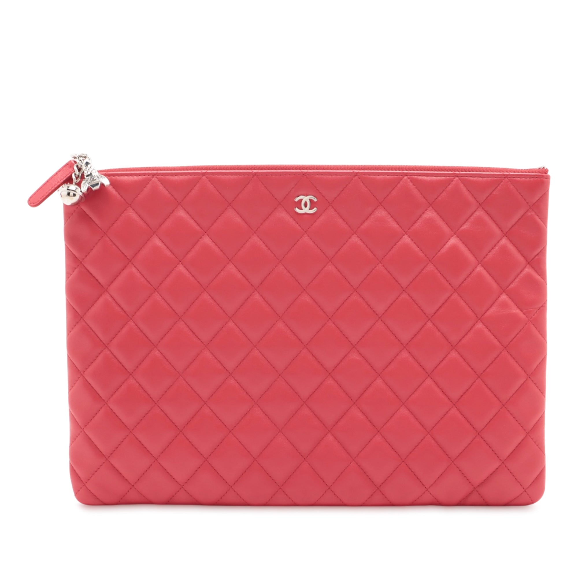 This clutch bag features a quilted lambskin leather body, a top zip closure, an exterior back slip pocket, and an interior zip pocket. Inclusion: authenticity card. Retail Price: 1450.00