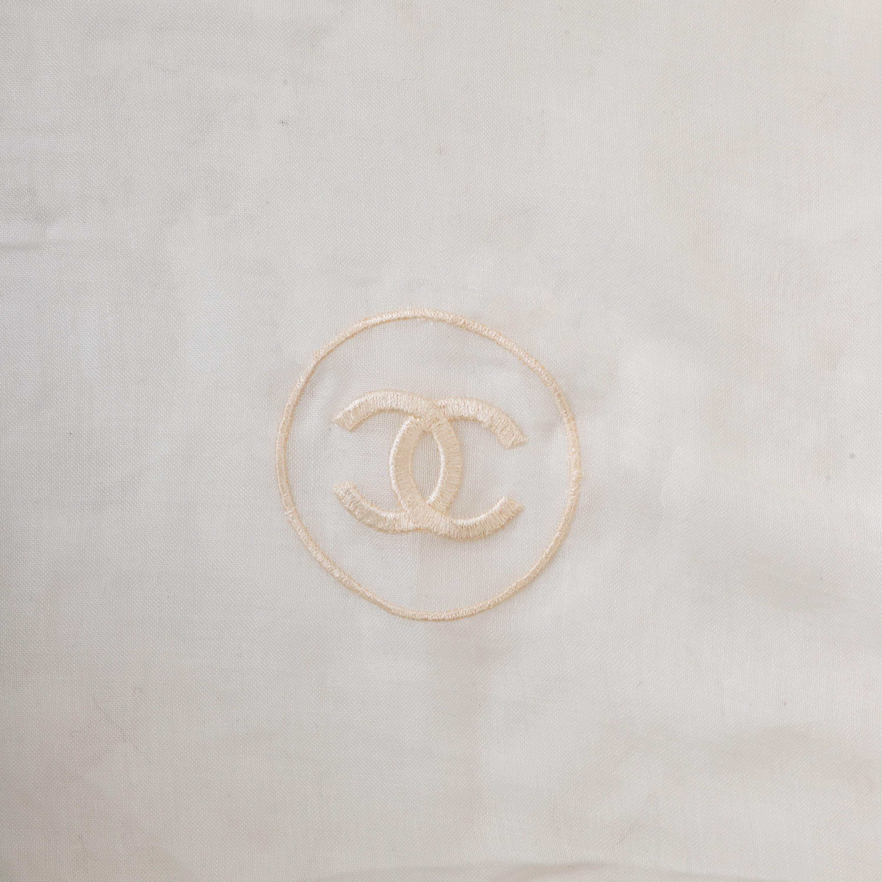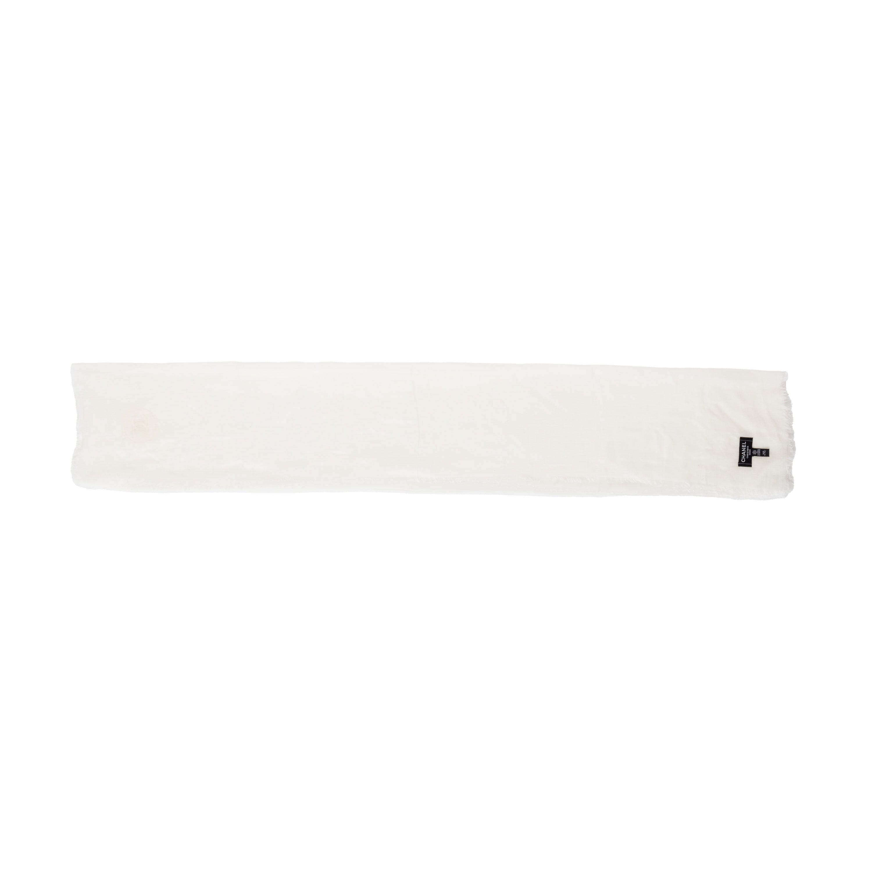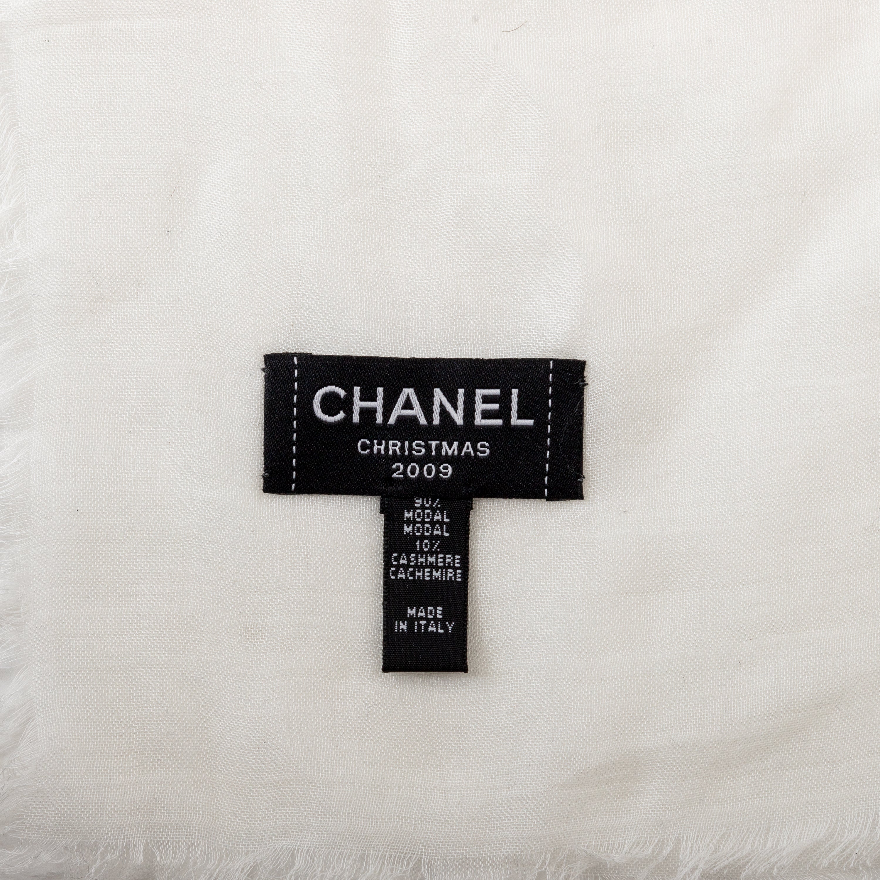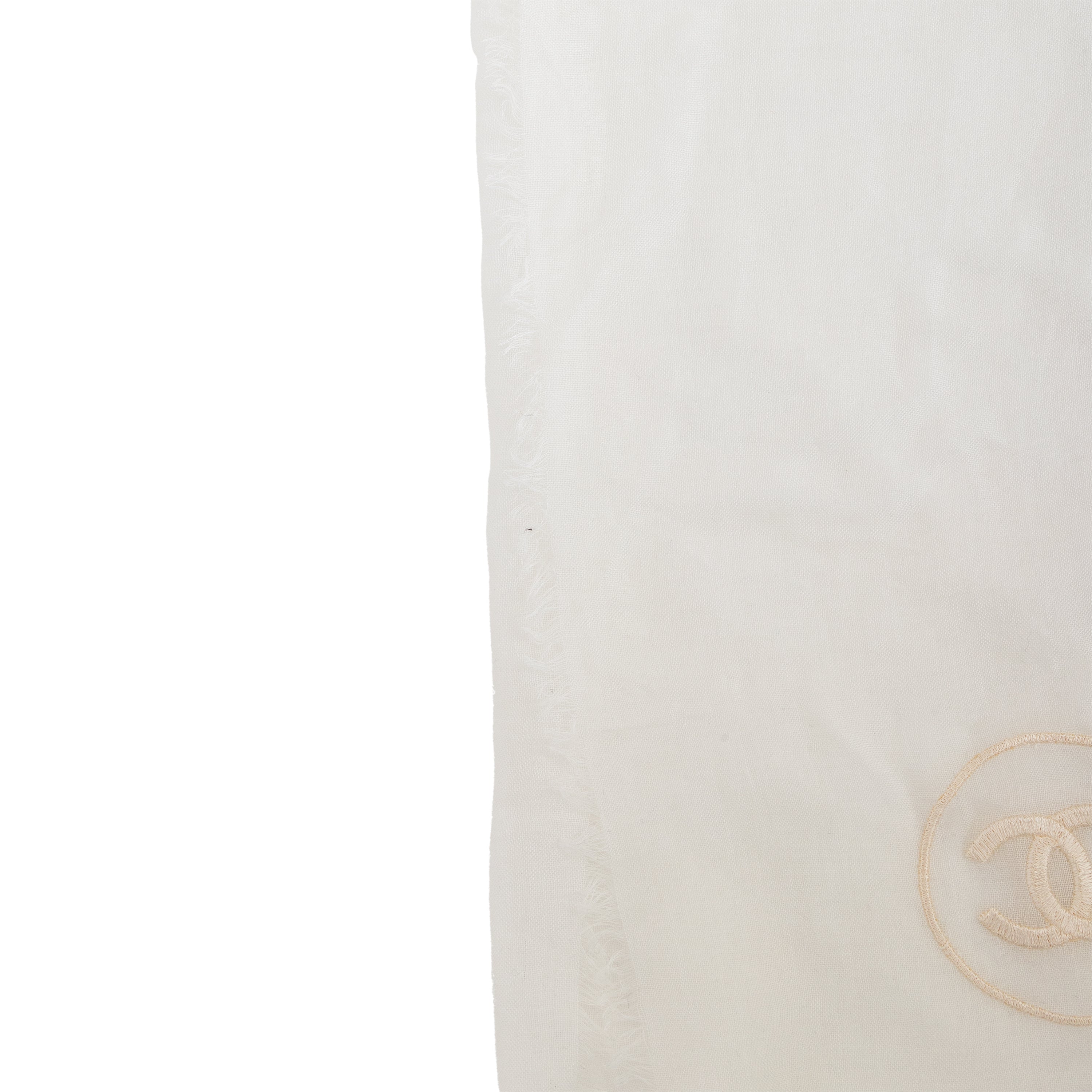 This Chanel Logo Embroidered Scarf from the Christmas 2009 collection is the perfect blend of luxury and warmth. Made from a soft cashmere and modal blend, it features a delicate off-white cc logo embroidery and a fringed hem.