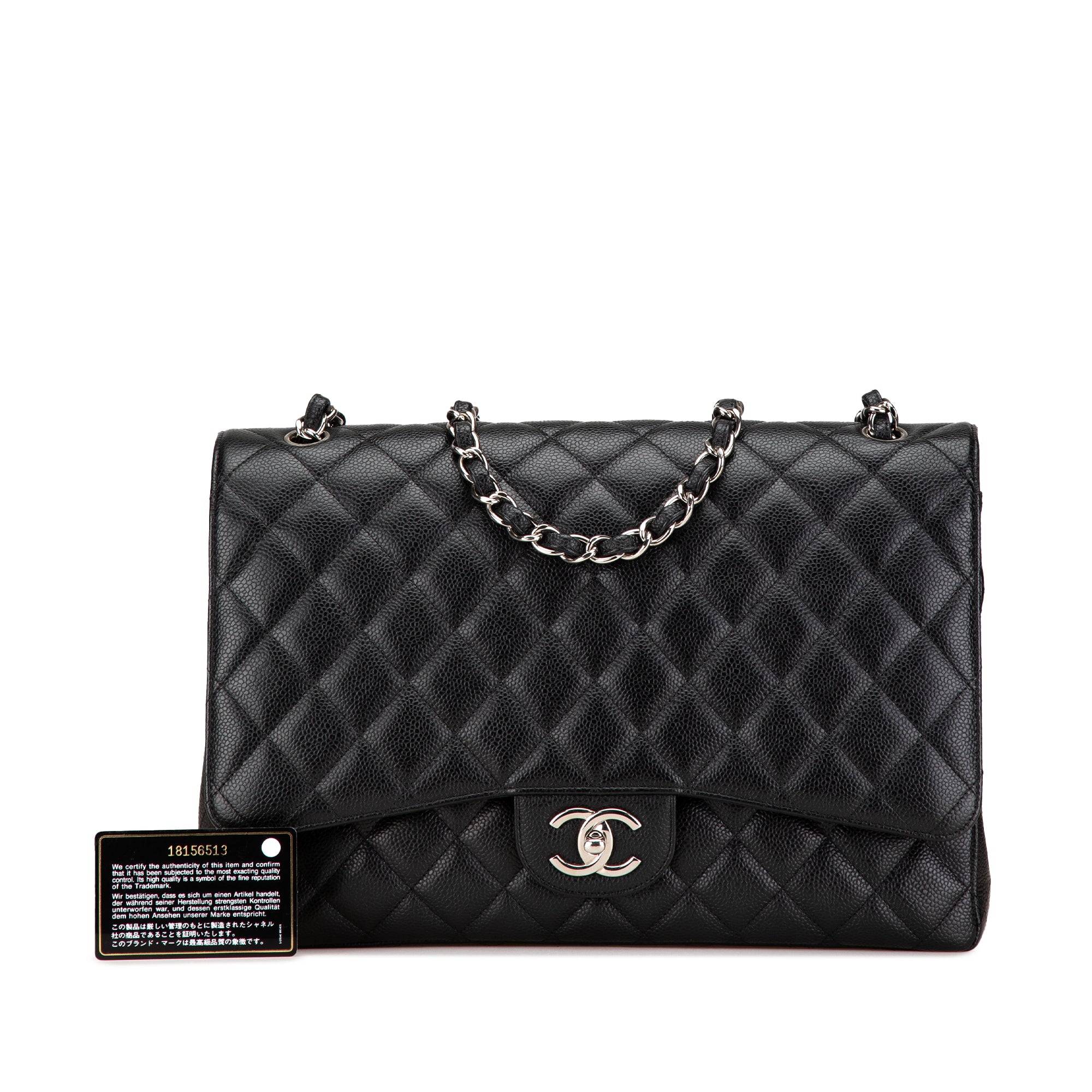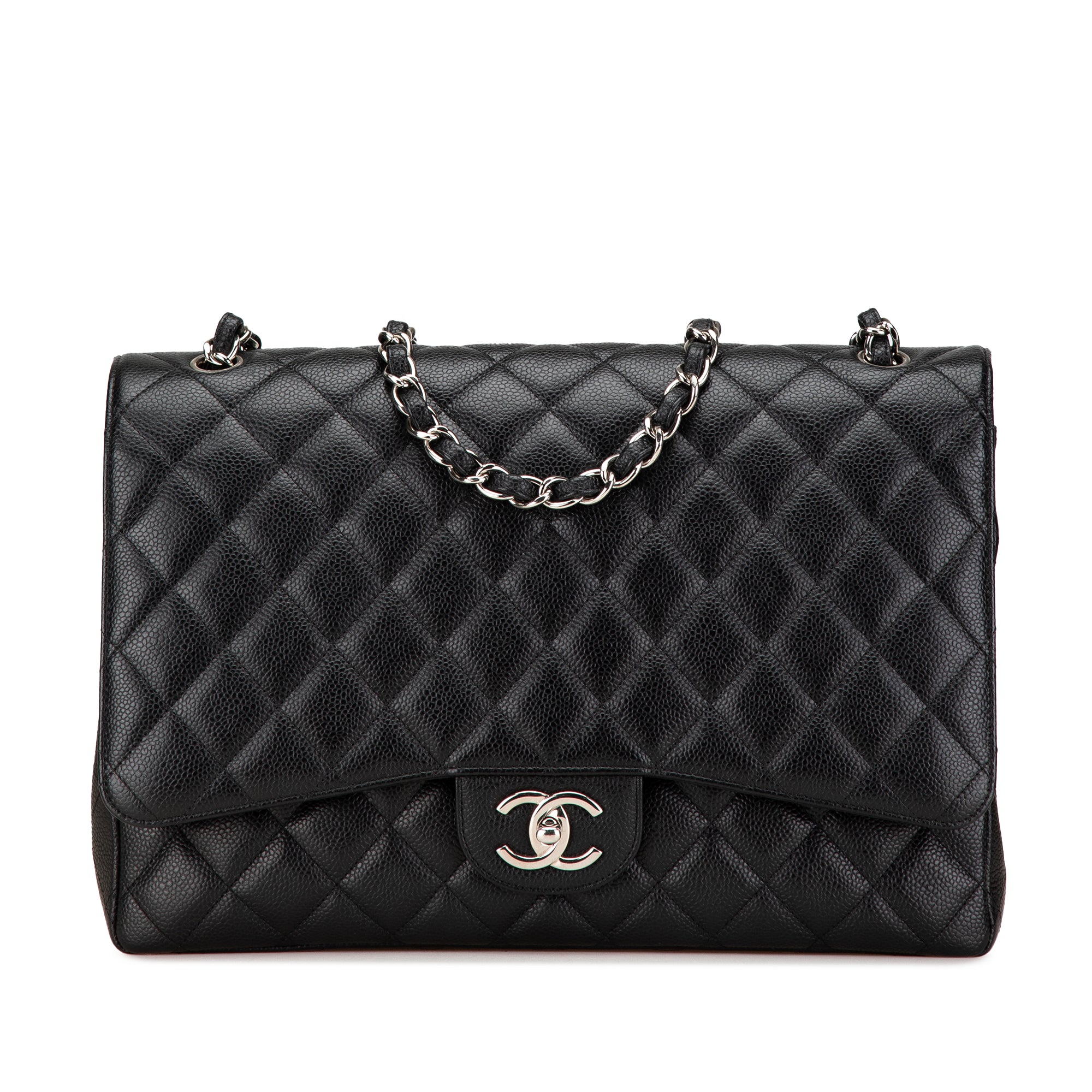 The Classic Maxi features a quilted caviar leather body, leather woven chain straps, double front flaps with interlocking Cs and a twist lock closure, an exterior back slip pocket, and interior slip pockets. Inclusion: authenticity card. Retail Price: 12300.00