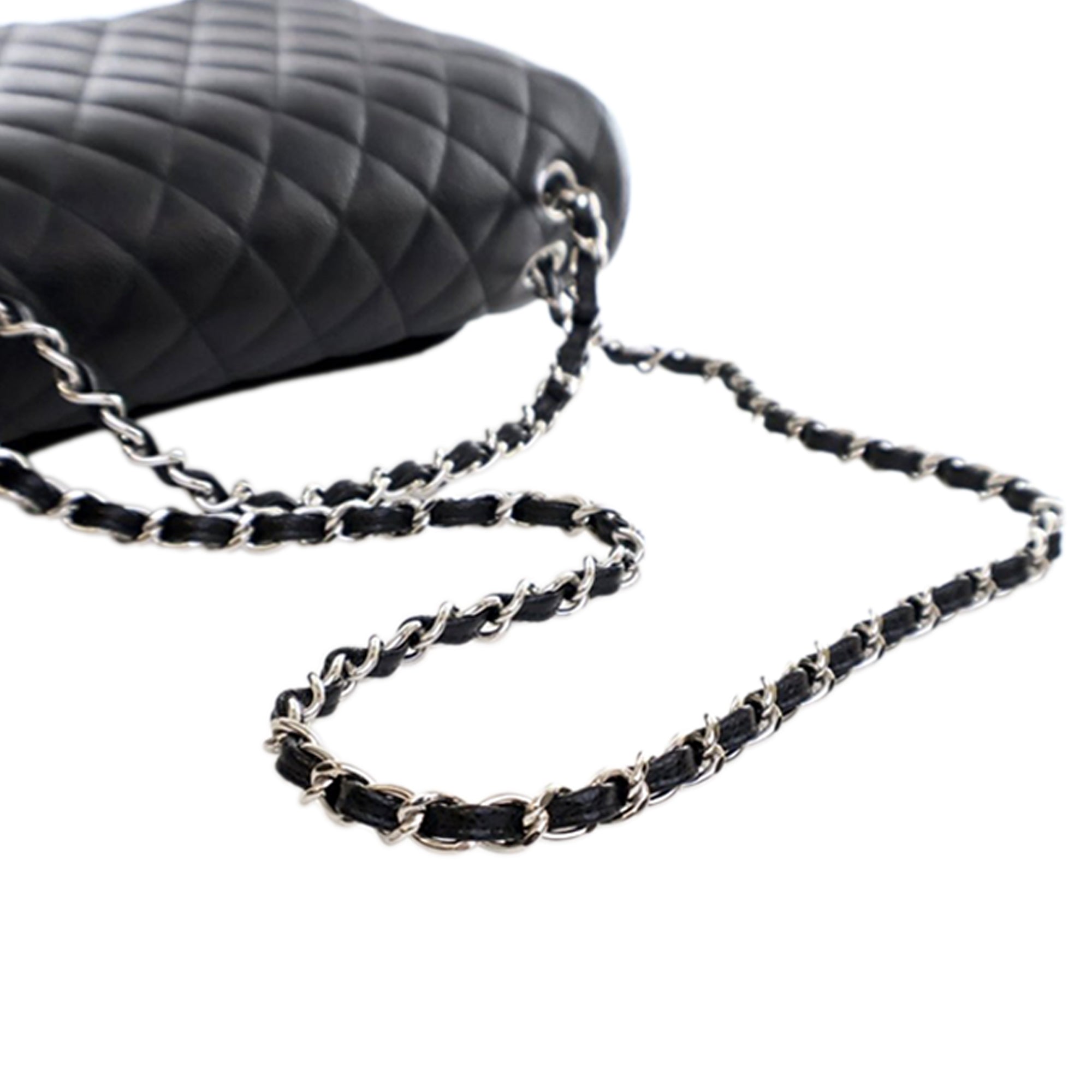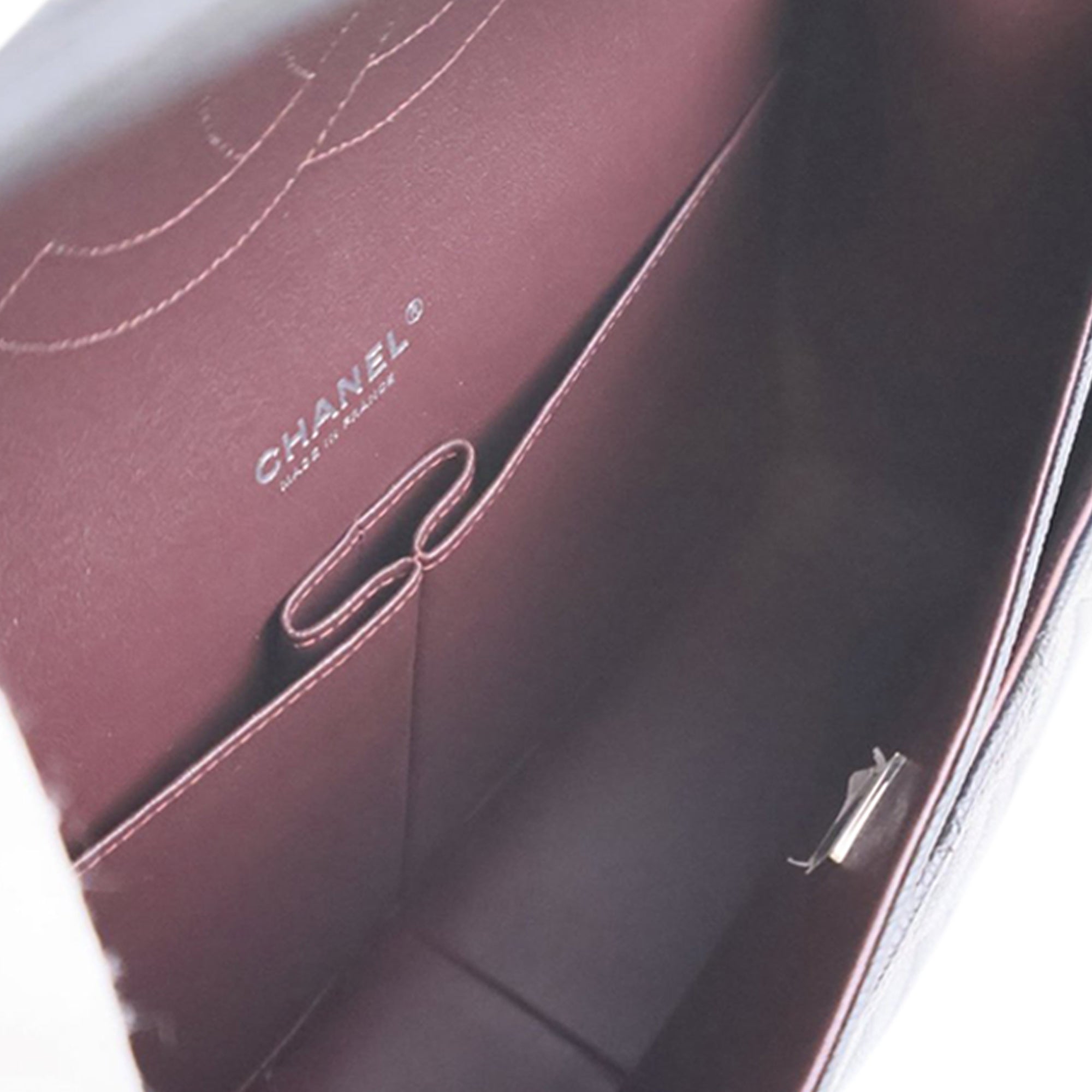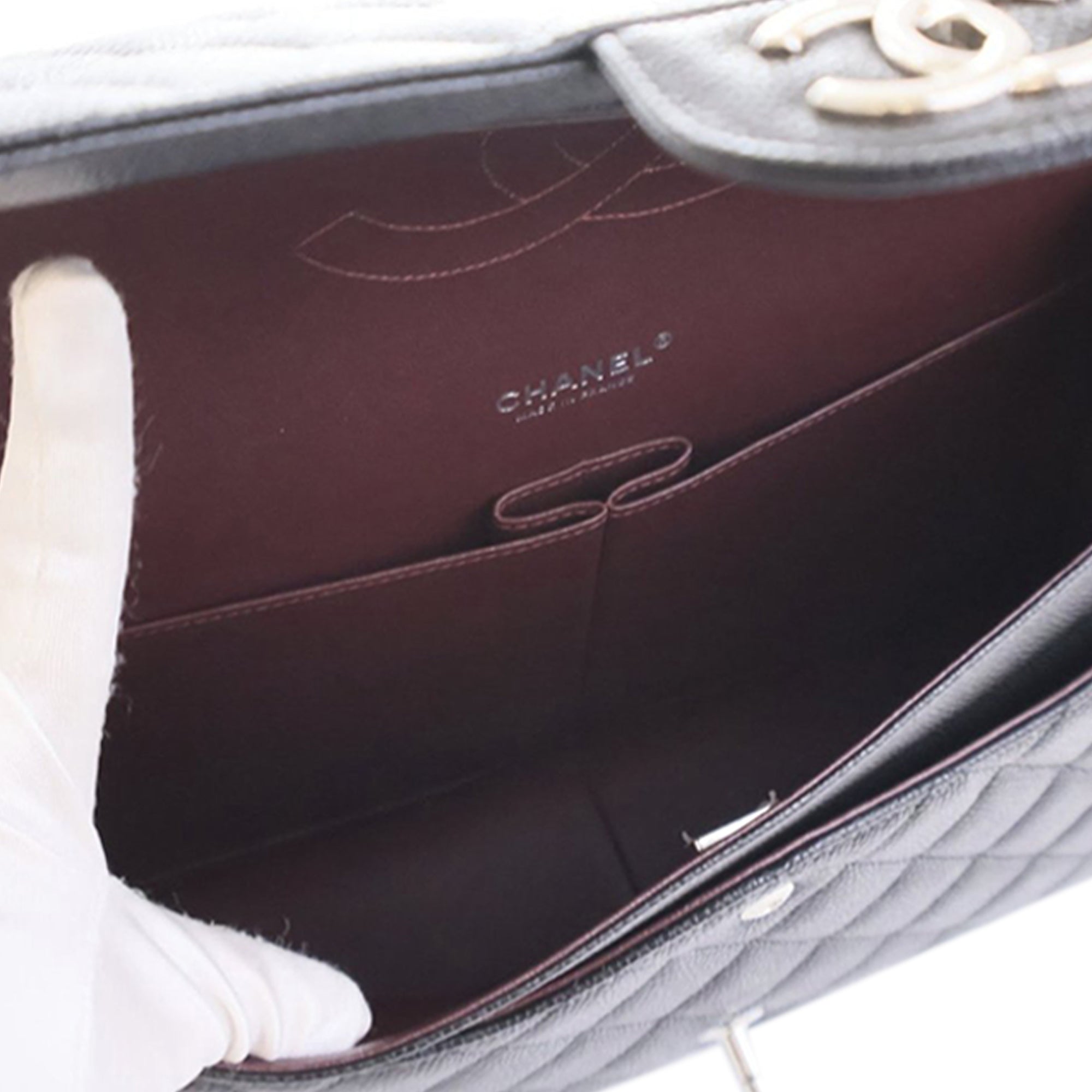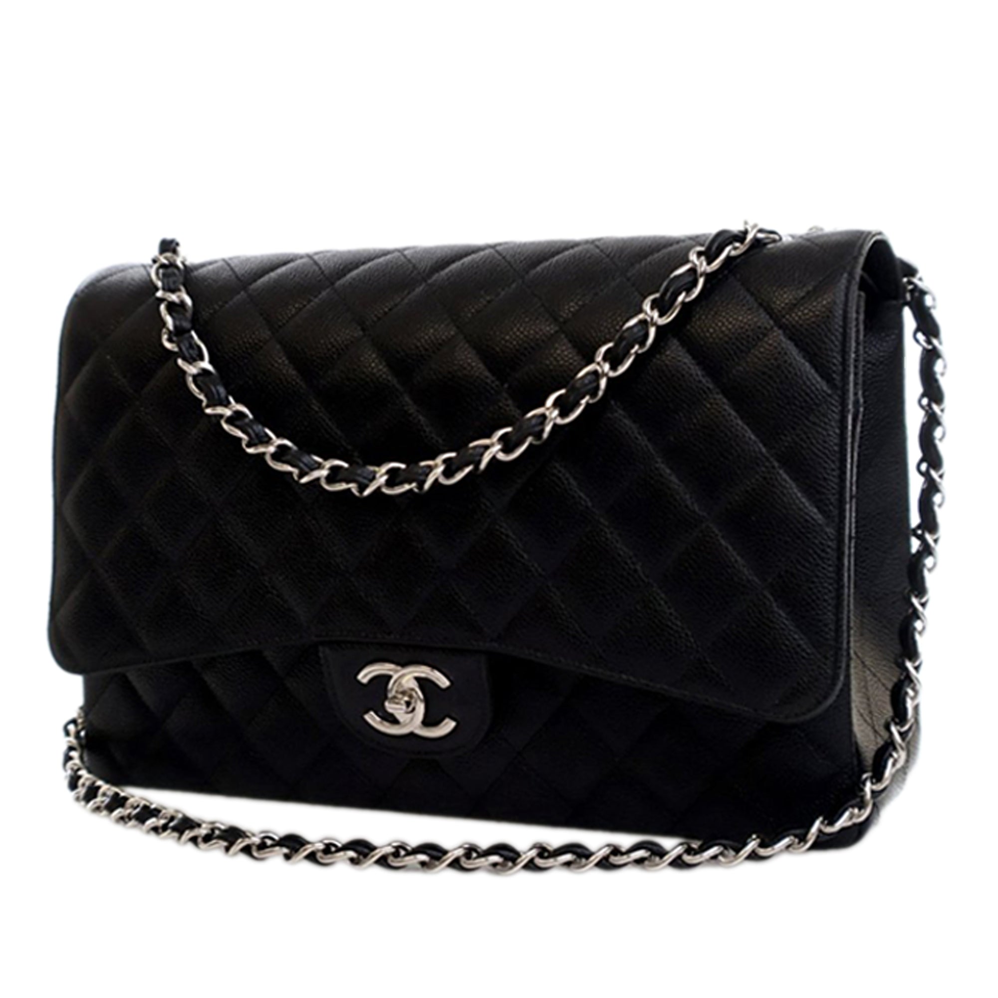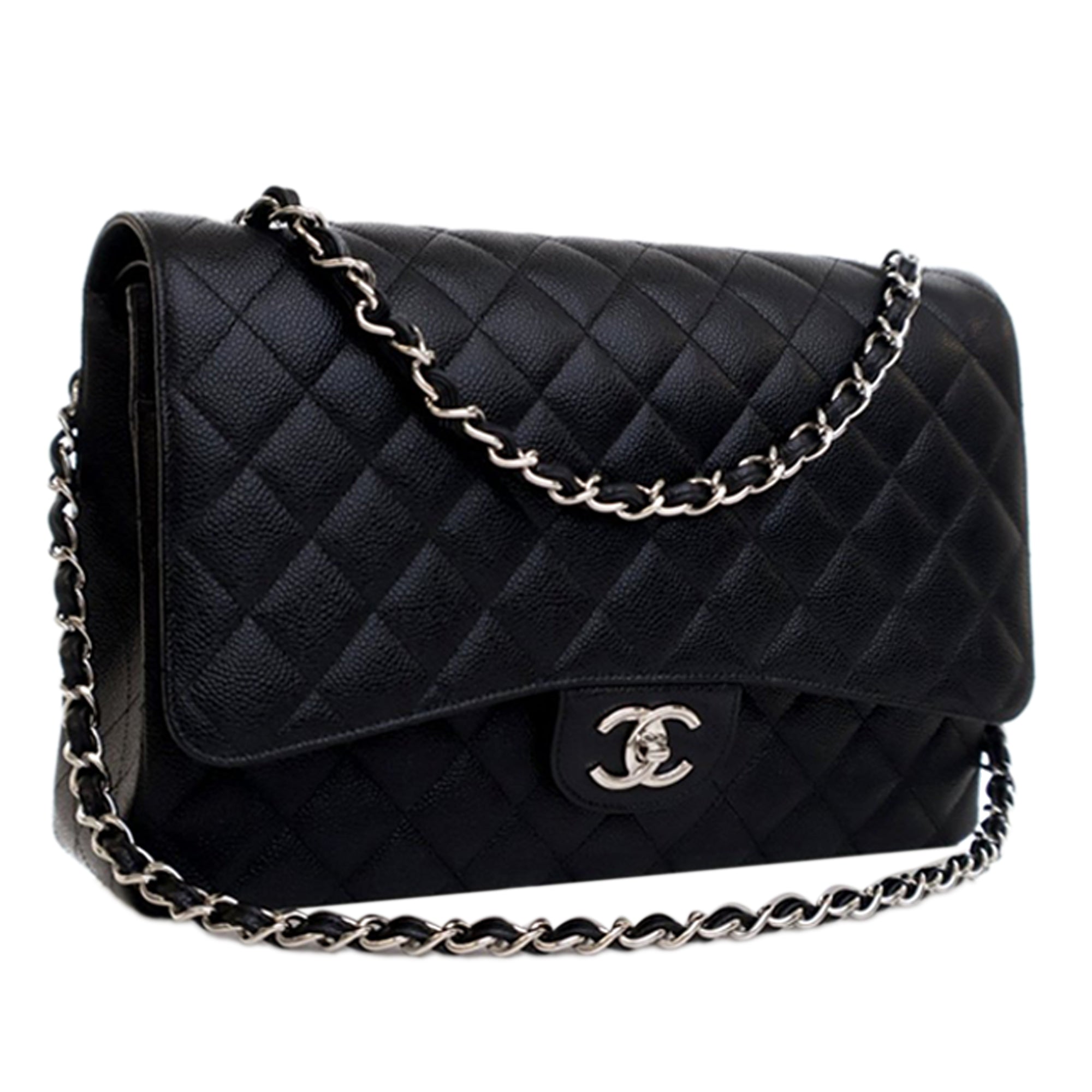 The Classic Maxi features a quilted caviar leather body, leather woven chain link straps, double front flaps with interlocking Cs and a twist lock closure, an exterior back slip pocket, and interior zip and slip pockets. Inclusion: Dust bag, box. Retail Price: 12300.00