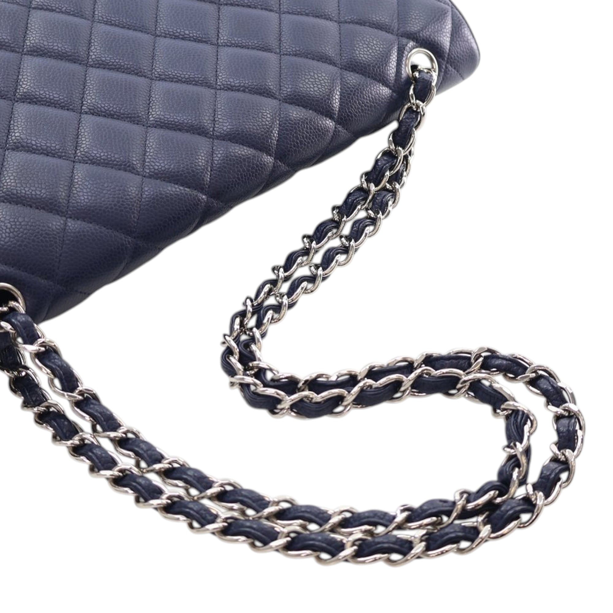 This shoulder bag features a quilted caviar leather body, silver-tone leather woven chain link straps, a top flap with CC turn lock closure, an exterior back slip pocket, and interior zip and slip pockets. Inclusion: Dust bag. Retail Price: 11350.00