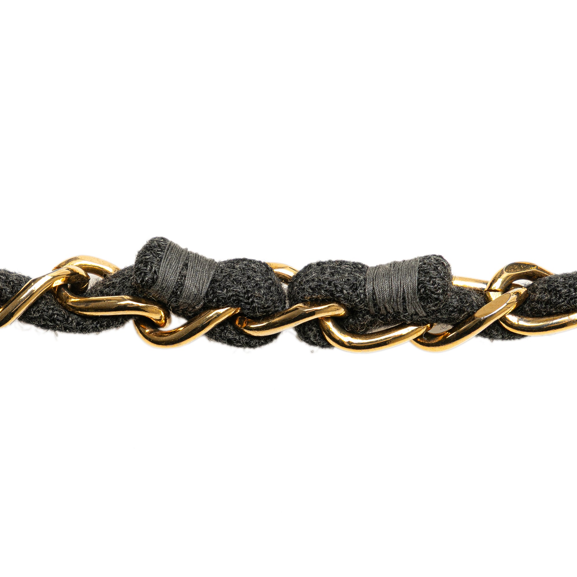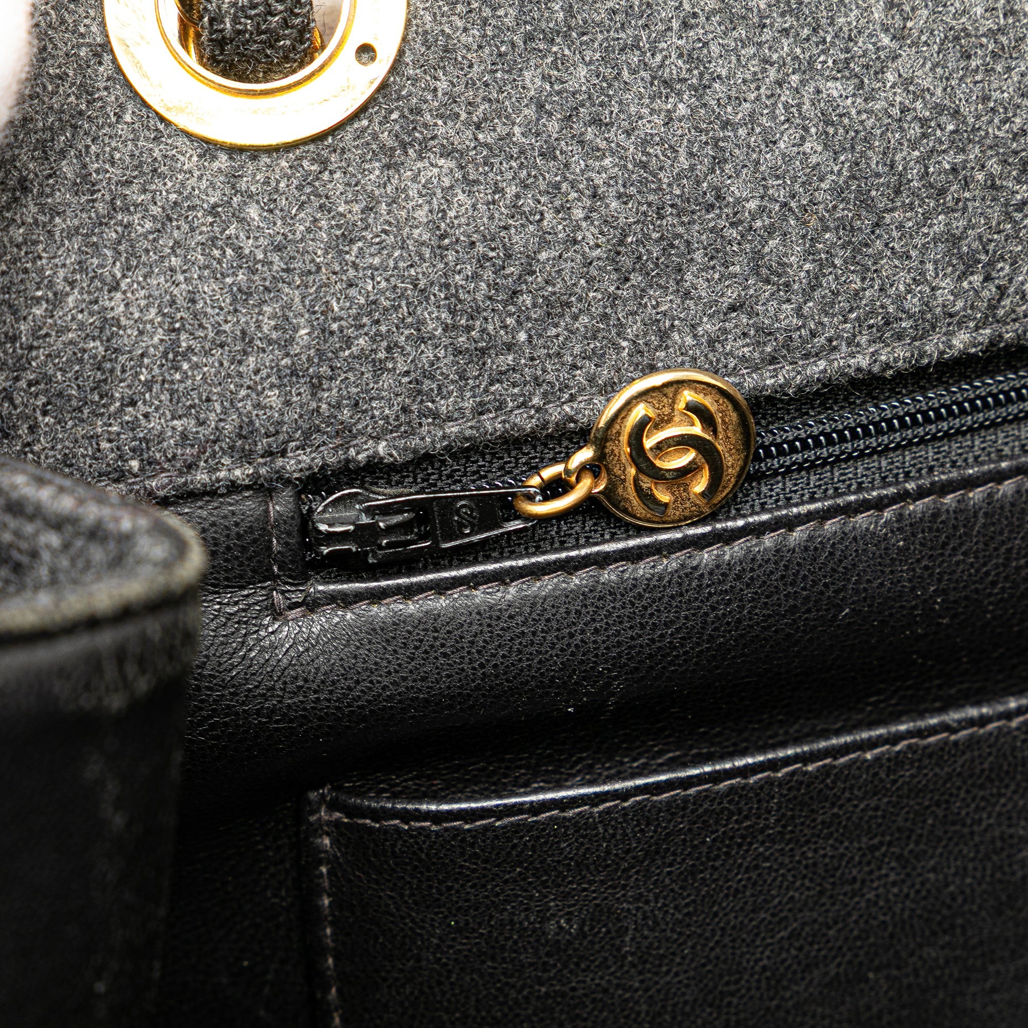 This flap bag features a quilted wool body, wool woven chain straps, a front flap with an oversize CC turn lock closure, an exterior back slip pocket, and interior zip and slip pockets. Retail Price: 5749.00